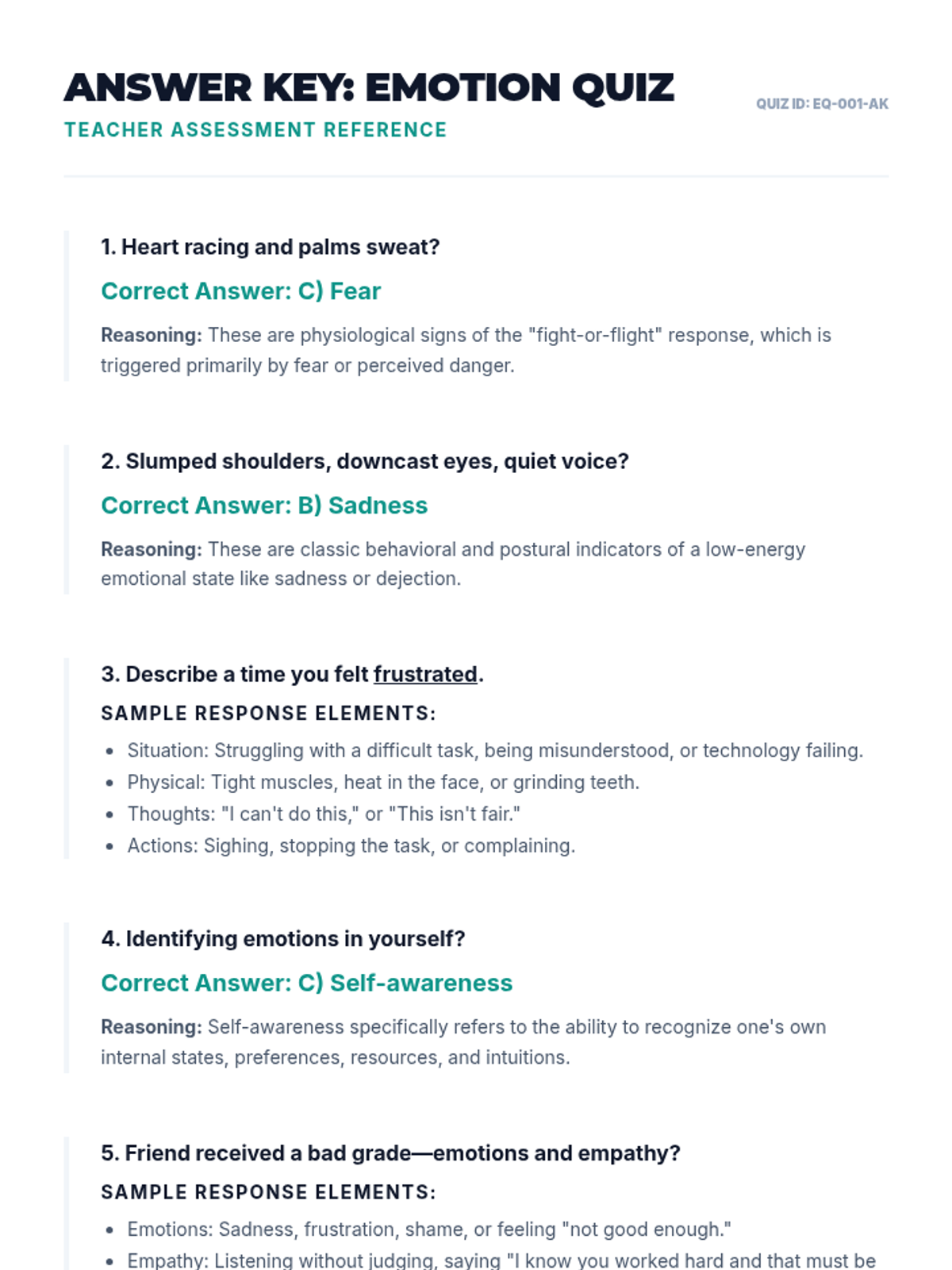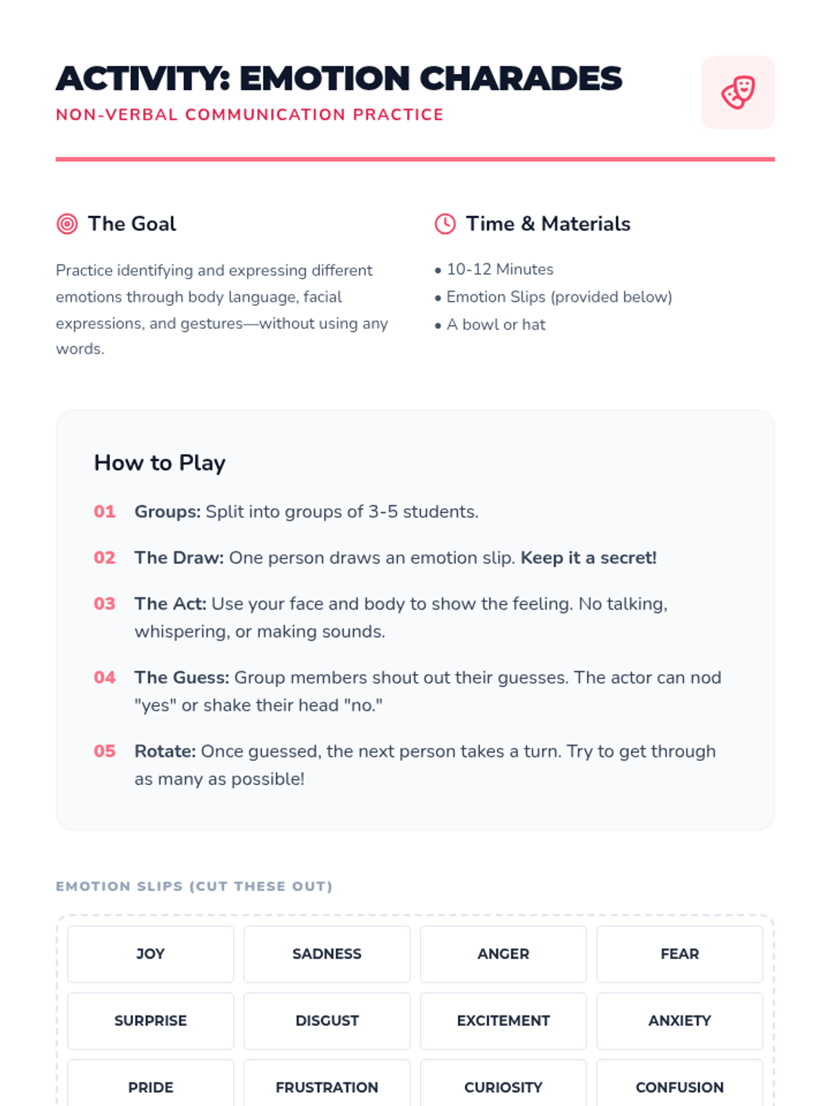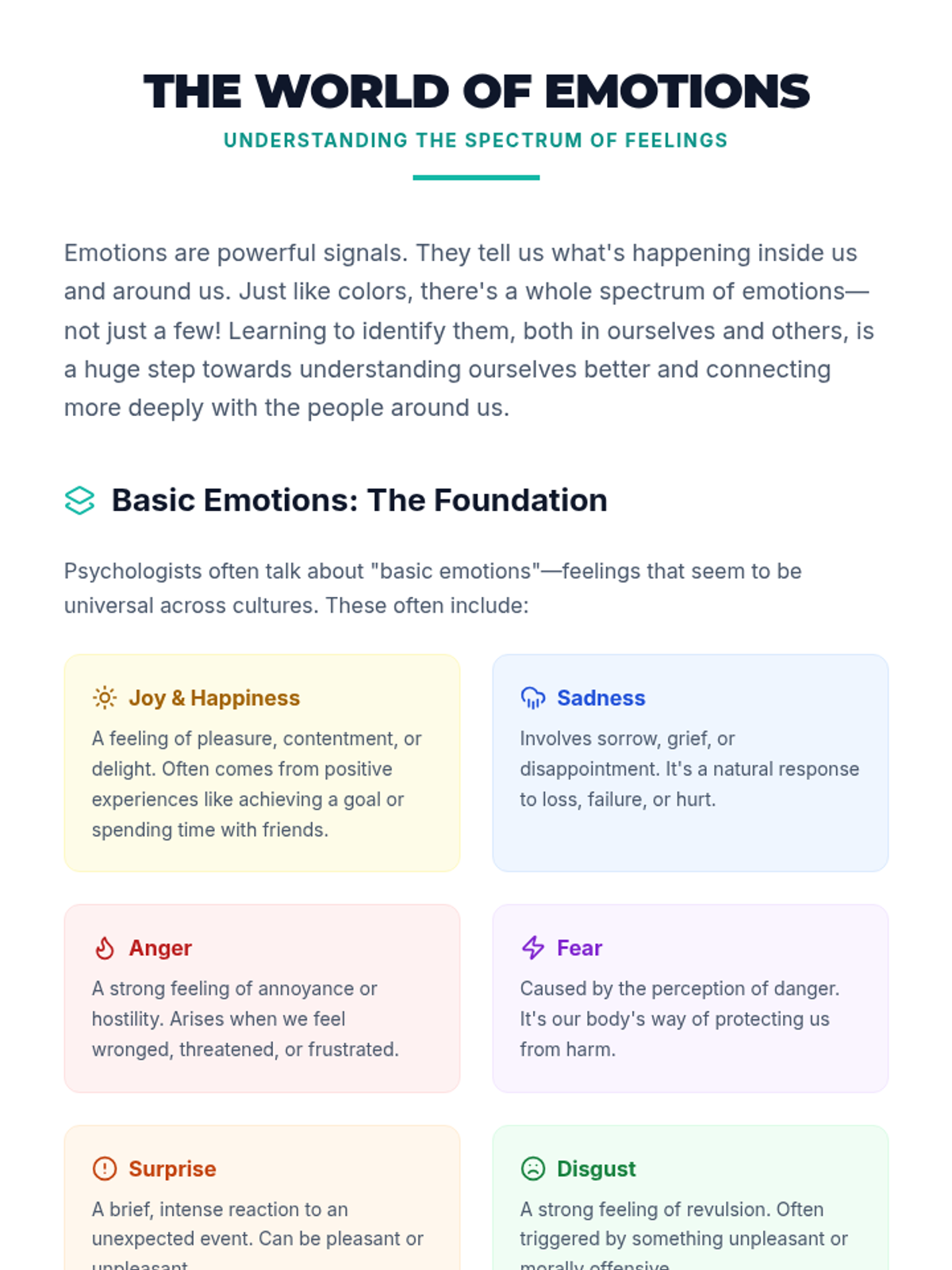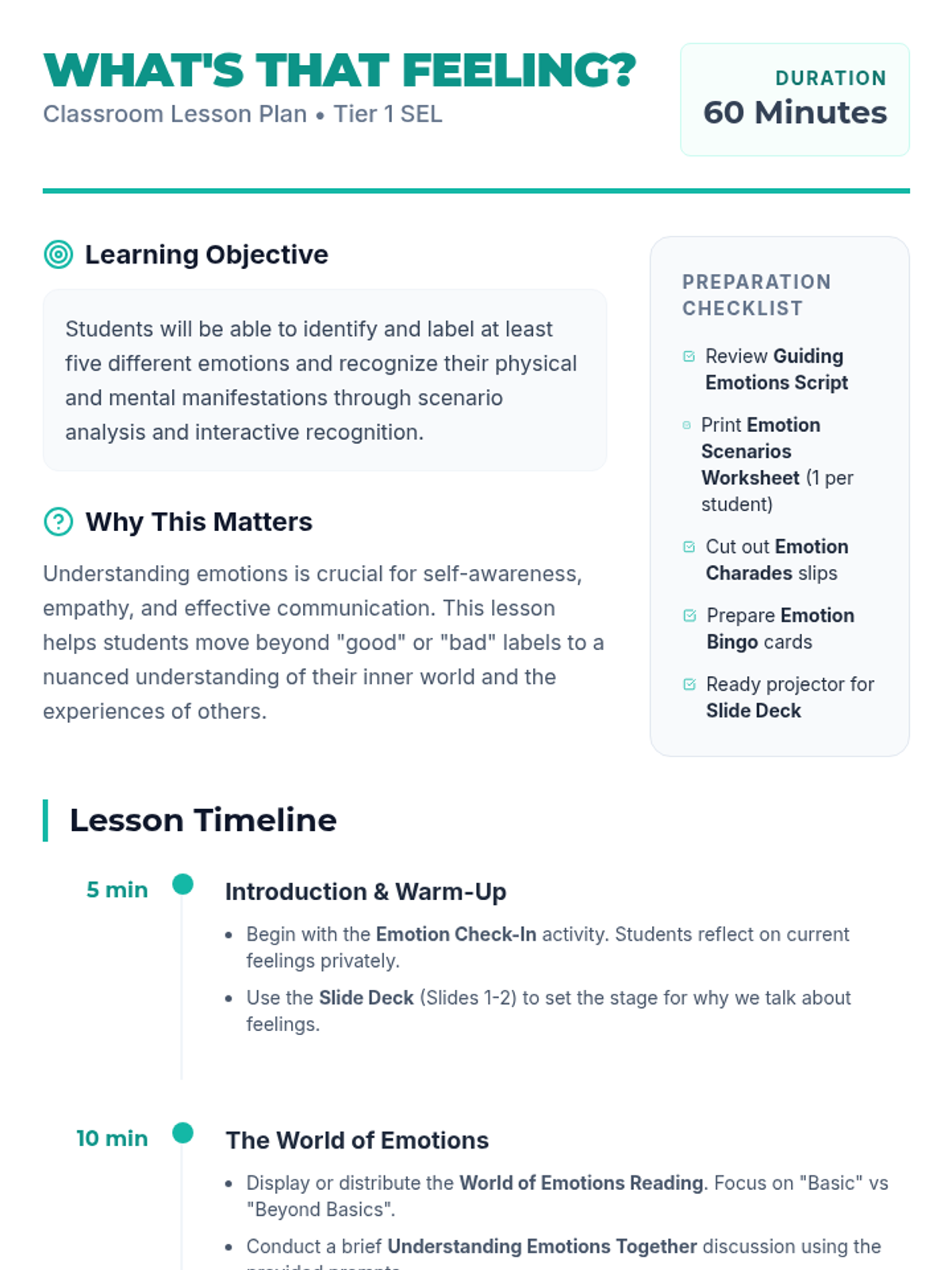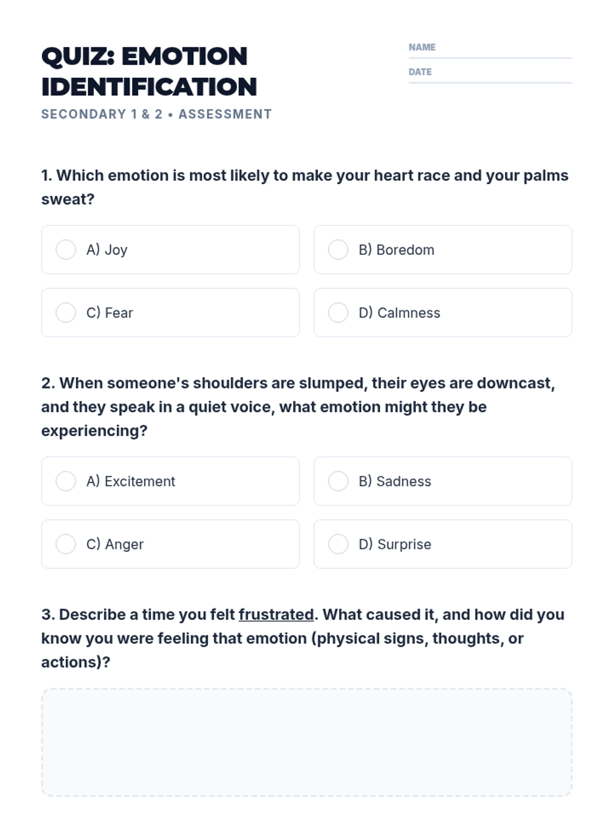 A comprehensive 60-minute lesson for secondary students to identify, label, and understand the physical and mental manifestations of various emotions. Students engage through reading, scenarios, and interactive games to build emotional intelligence and empathy.