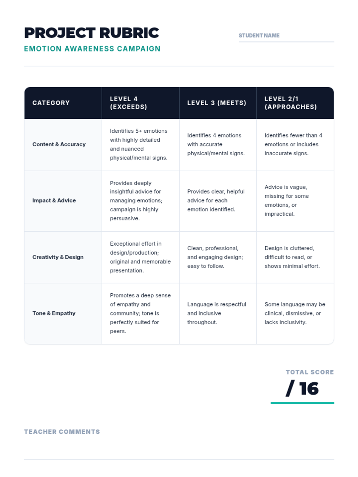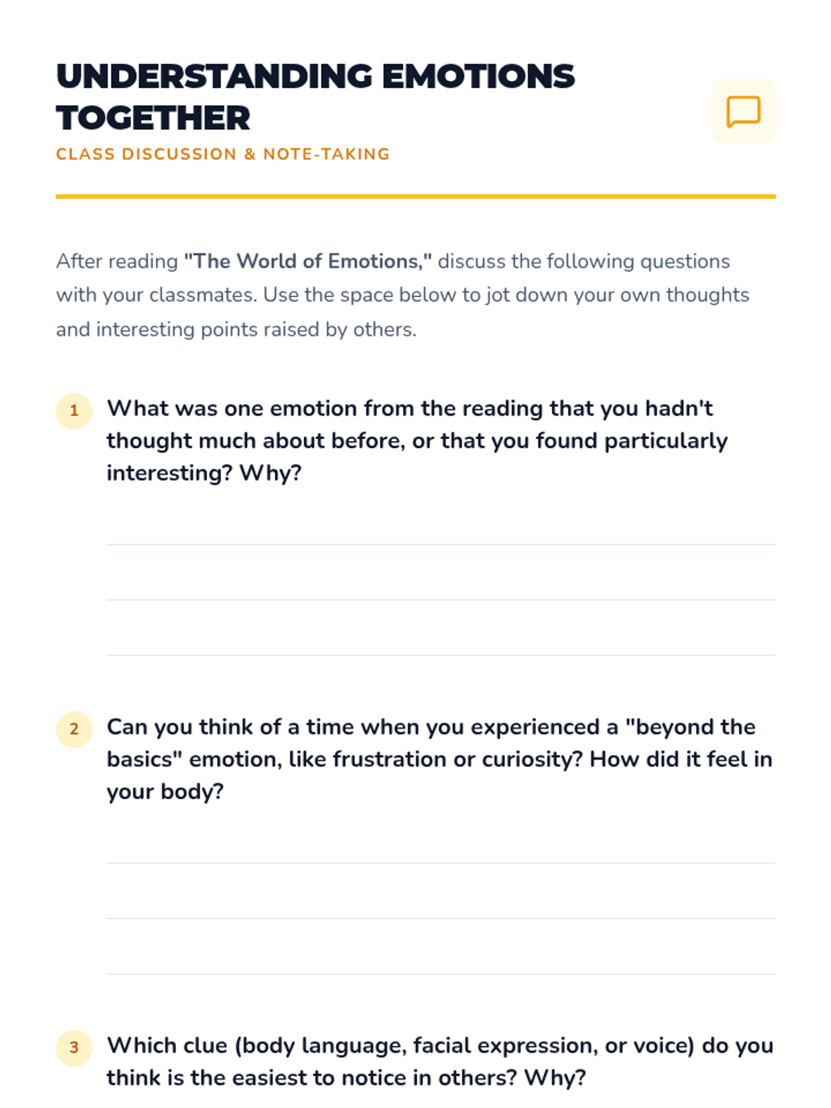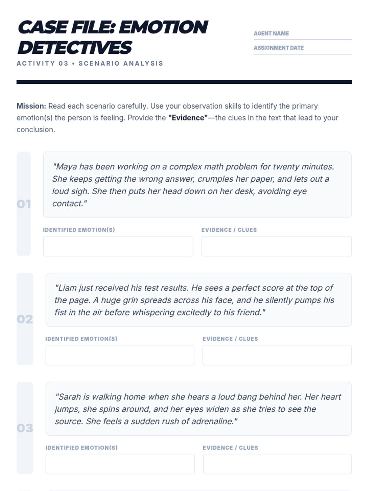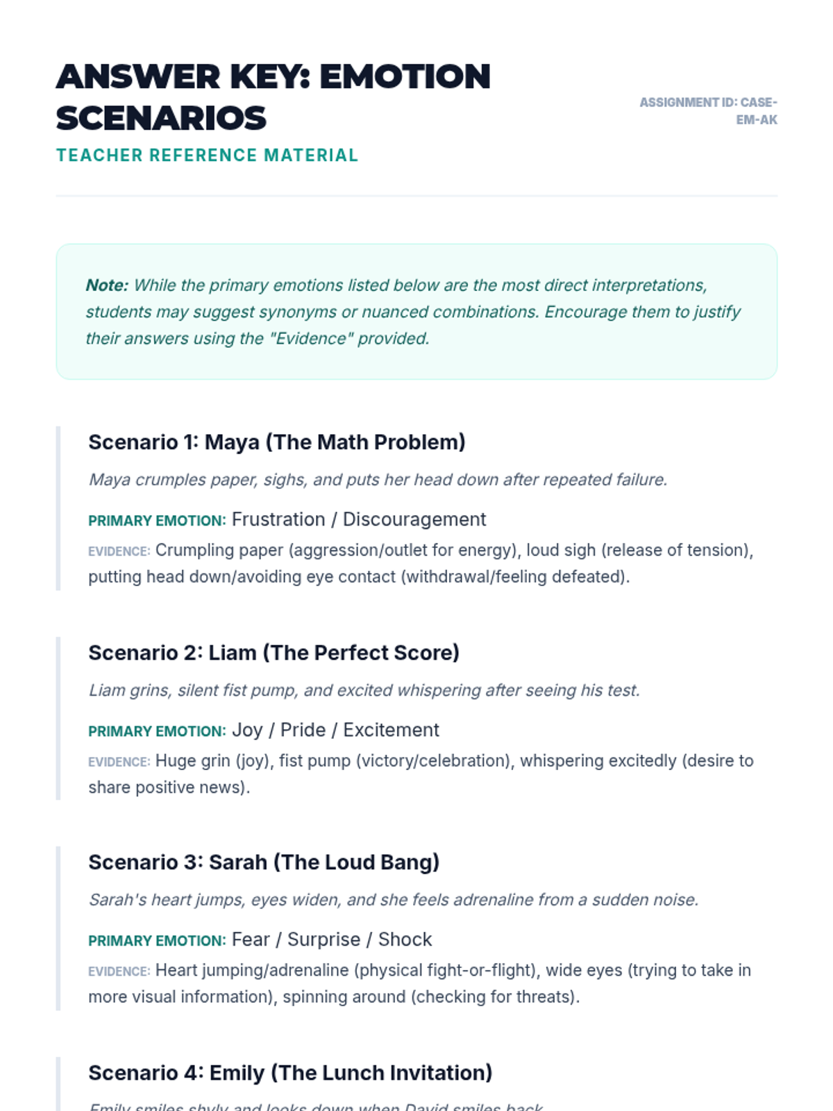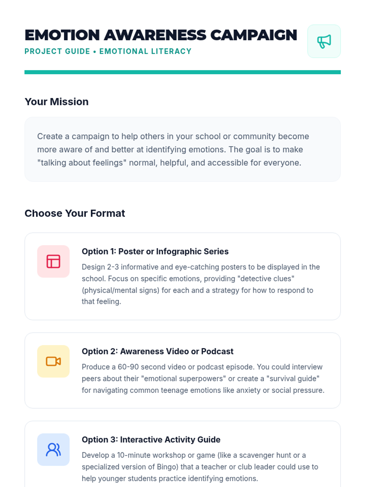 A comprehensive 60-minute lesson for secondary students to identify, label, and understand the physical and mental manifestations of various emotions. Students engage through reading, scenarios, and interactive games to build emotional intelligence and empathy.