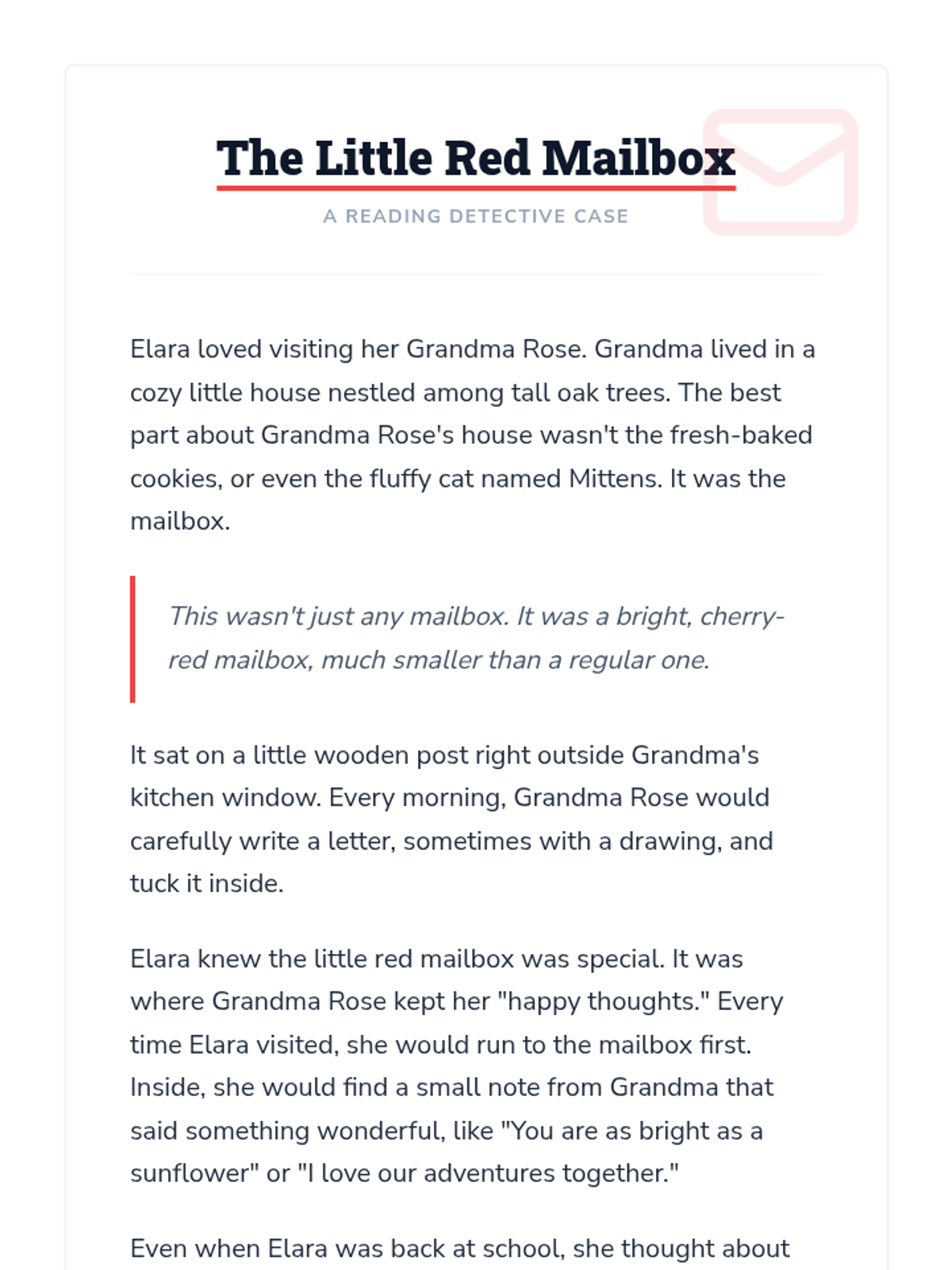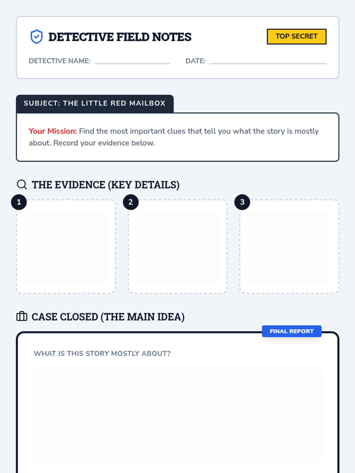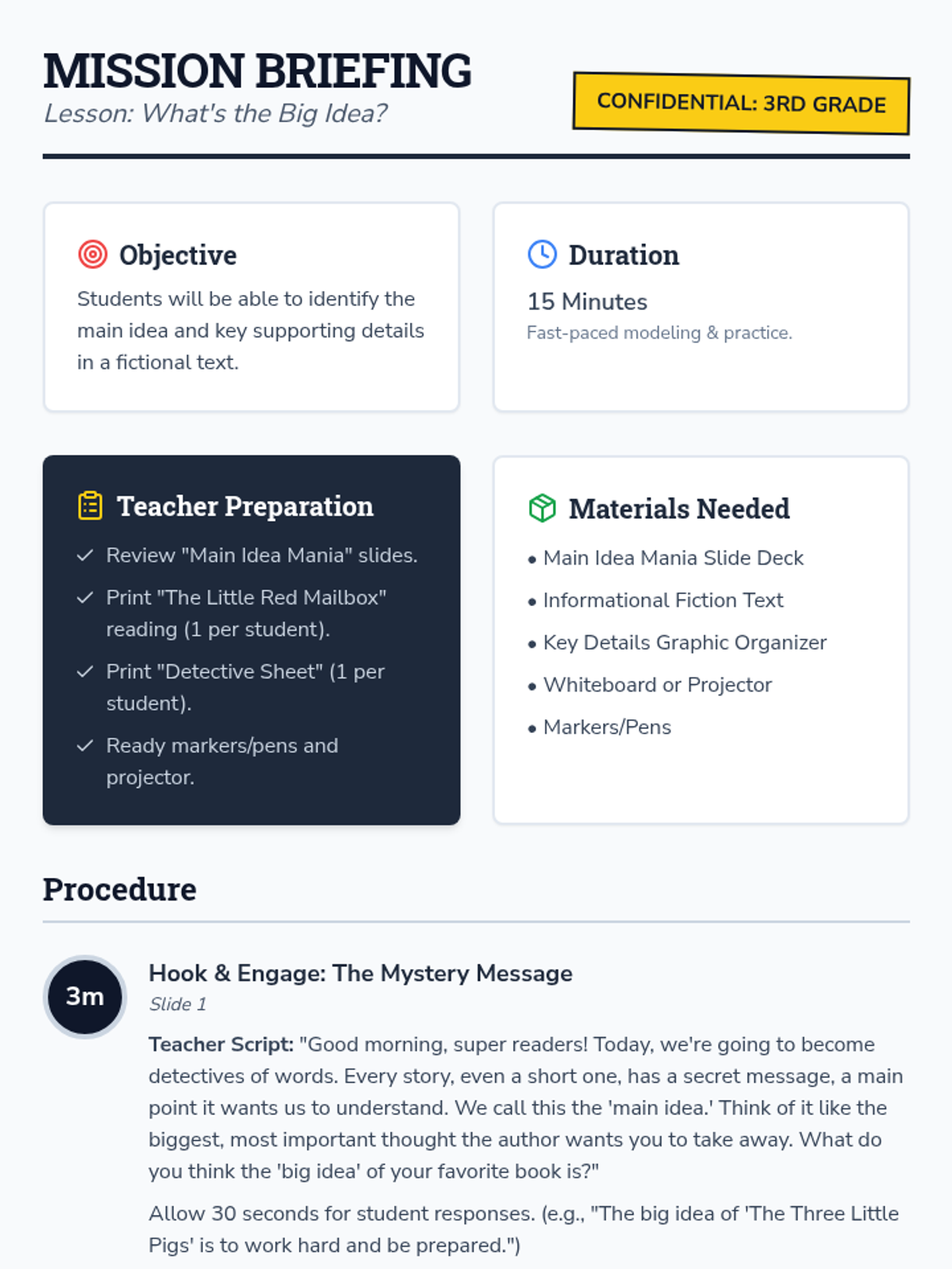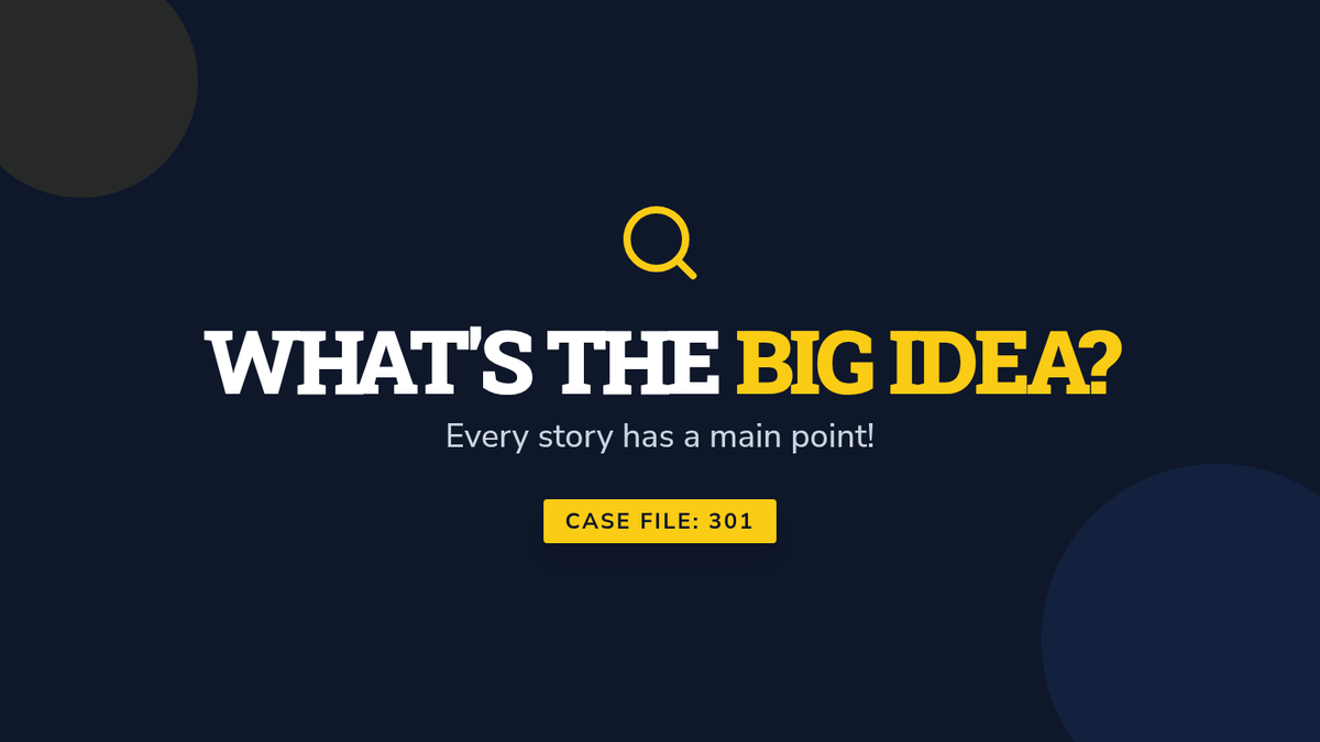 A 15-minute 3rd-grade lesson focused on identifying the main idea and key supporting details in fictional texts using a fun detective theme. Students act as 'word detectives' to find clues that lead to the 'big idea' of a story.