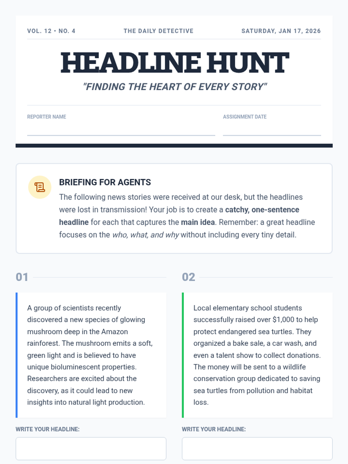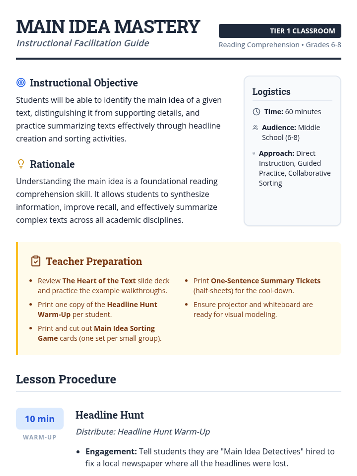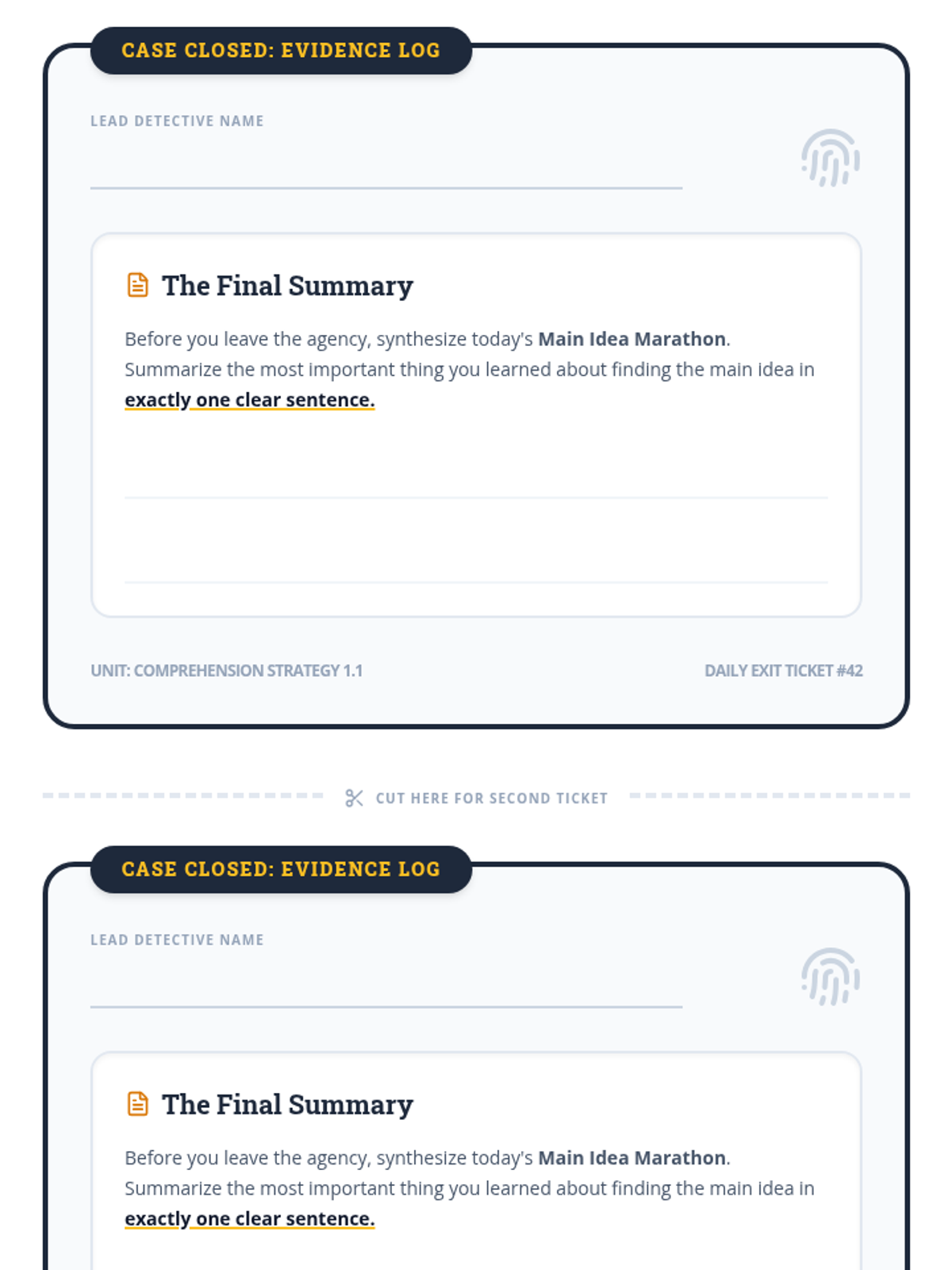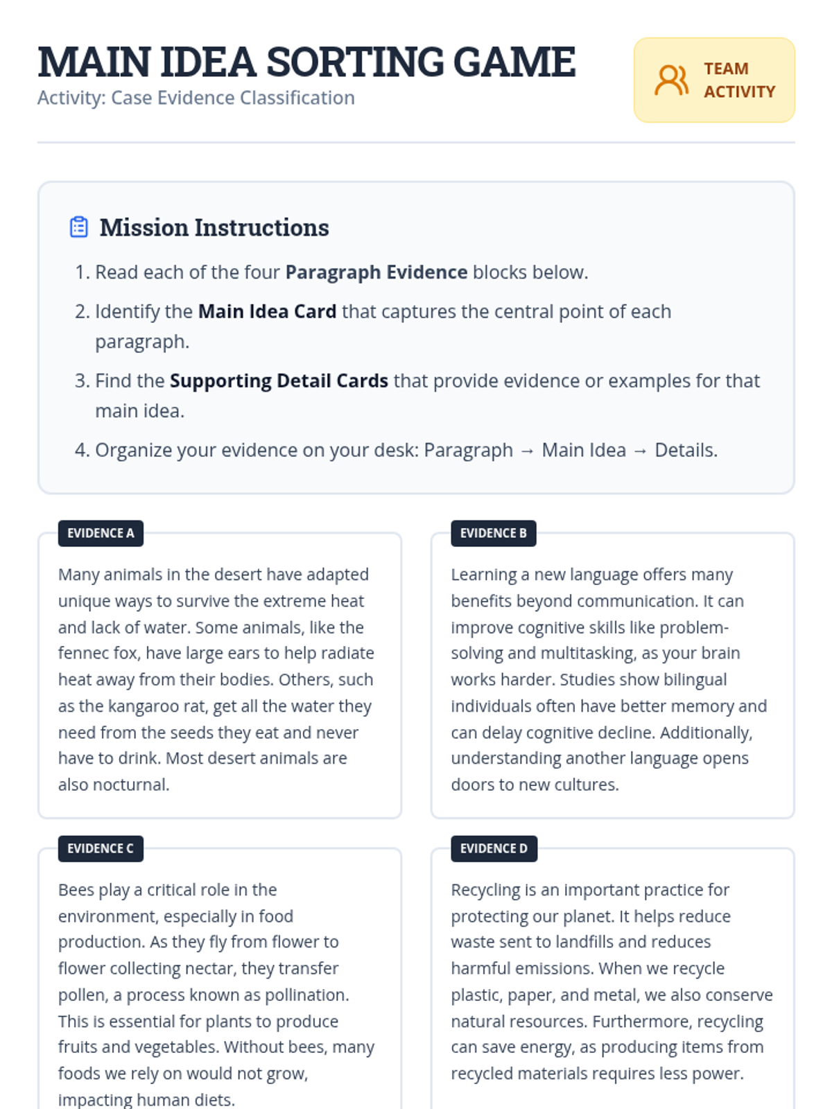 A comprehensive 60-minute lesson for middle schoolers on identifying the main idea and distinguishing it from supporting details using a detective-themed approach.