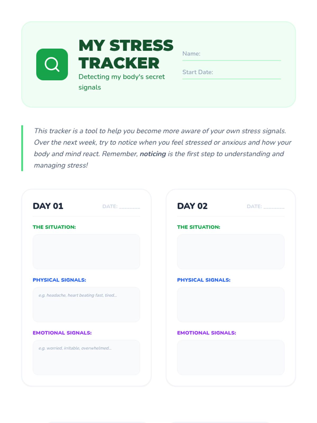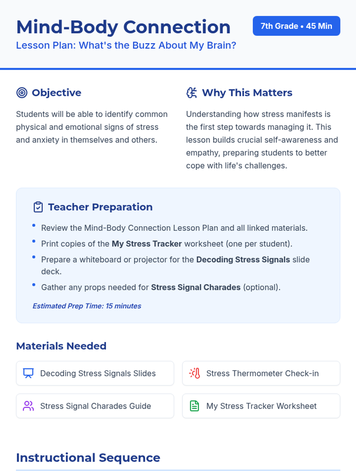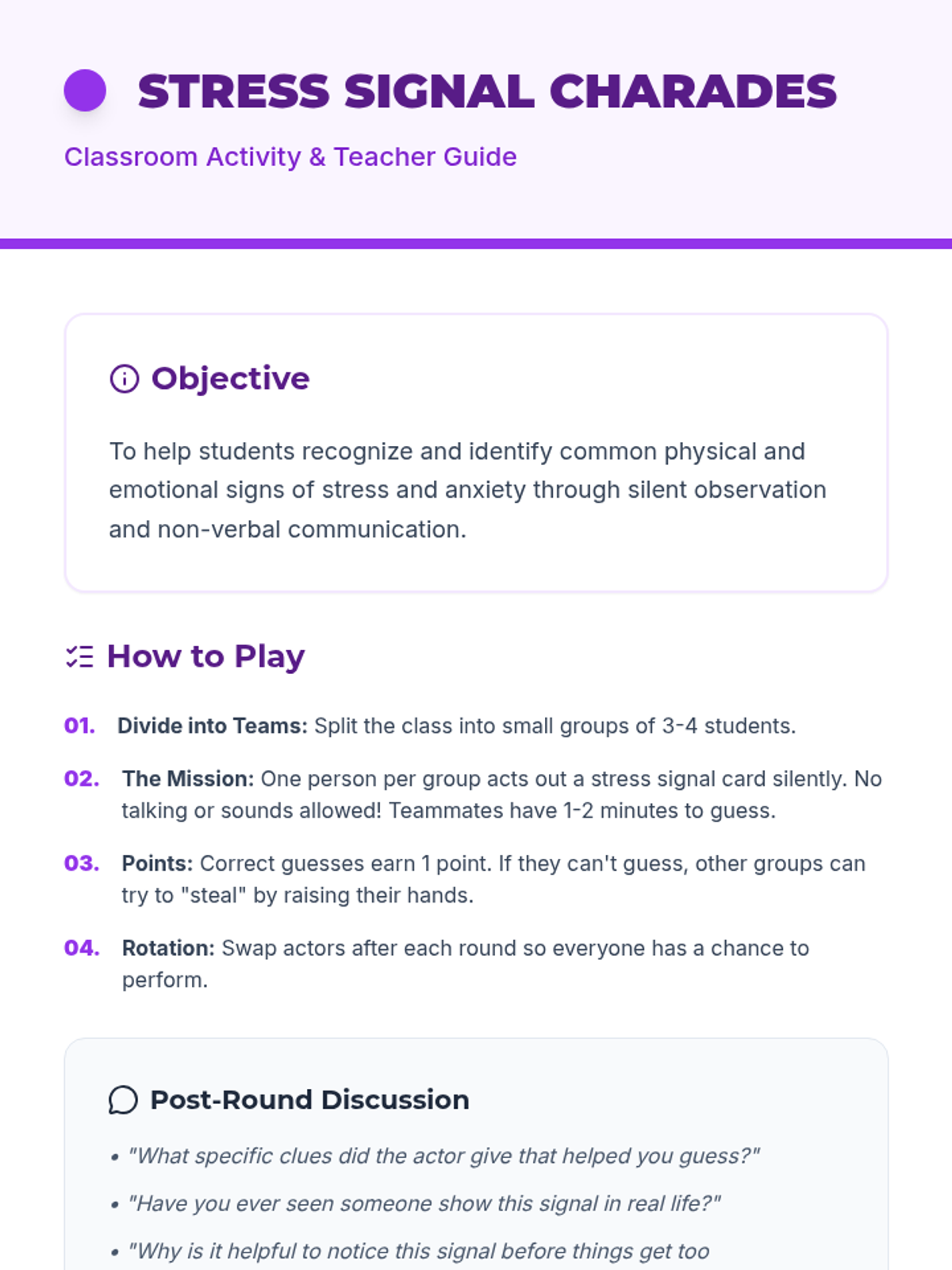 This lesson helps students identify physical and emotional signs of stress and anxiety, fostering self-awareness and empathy through interactive discussion and activities.