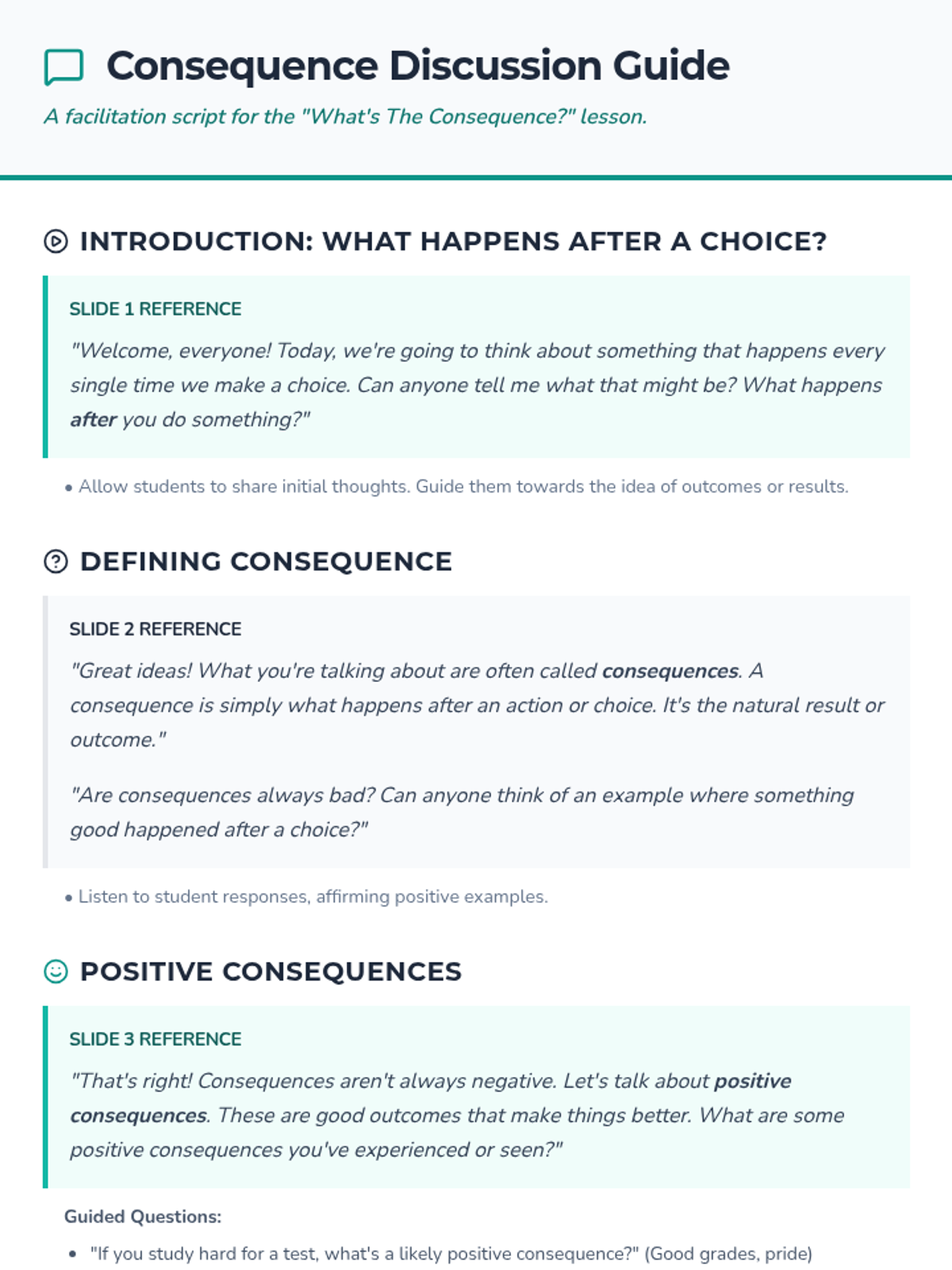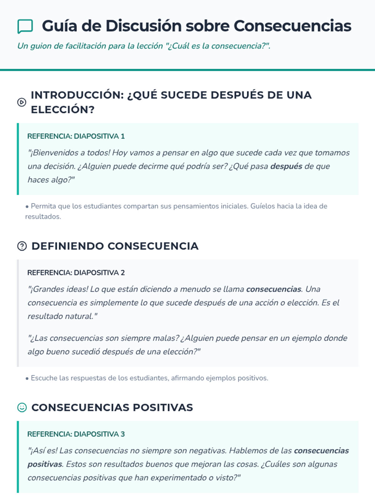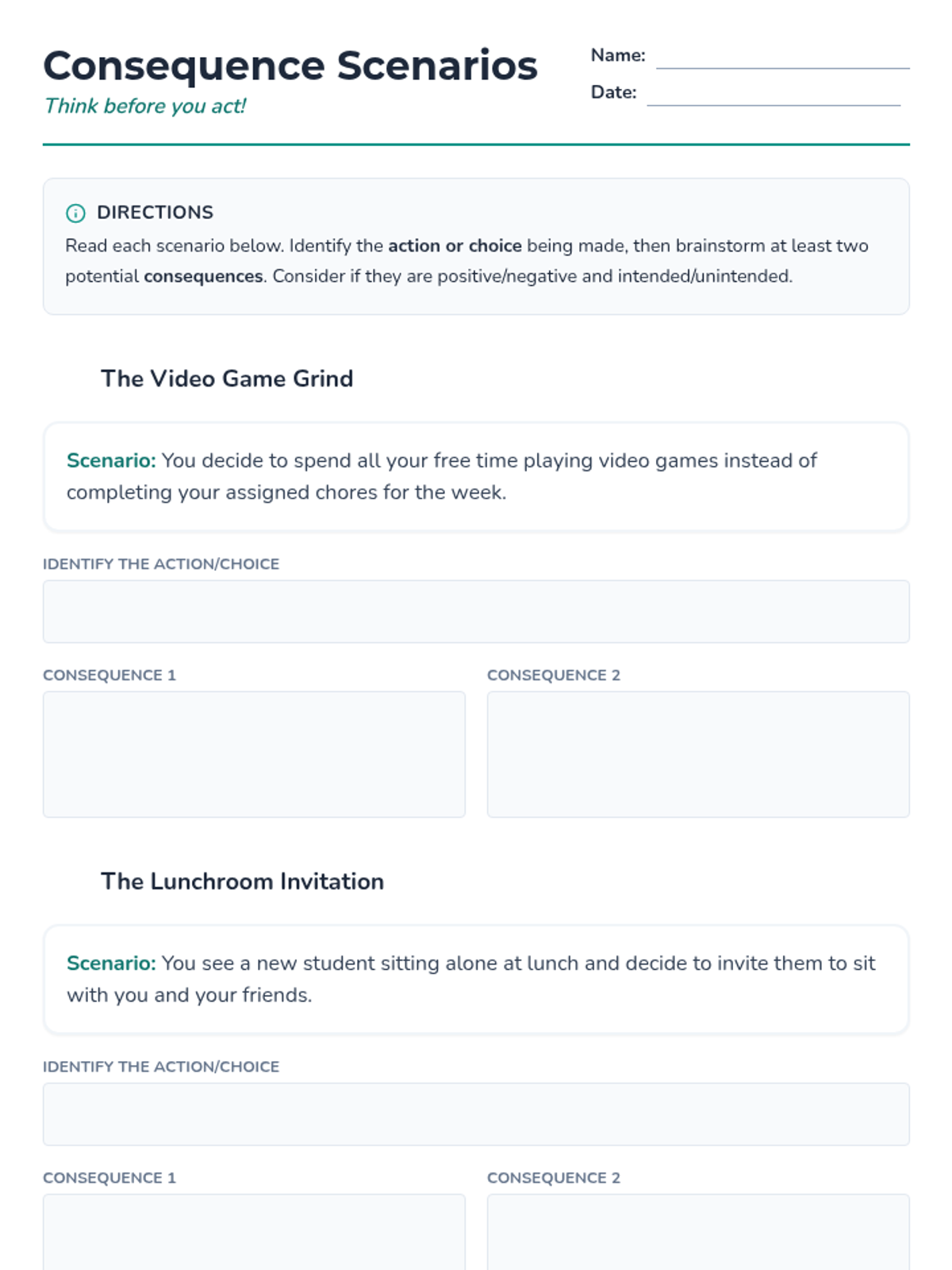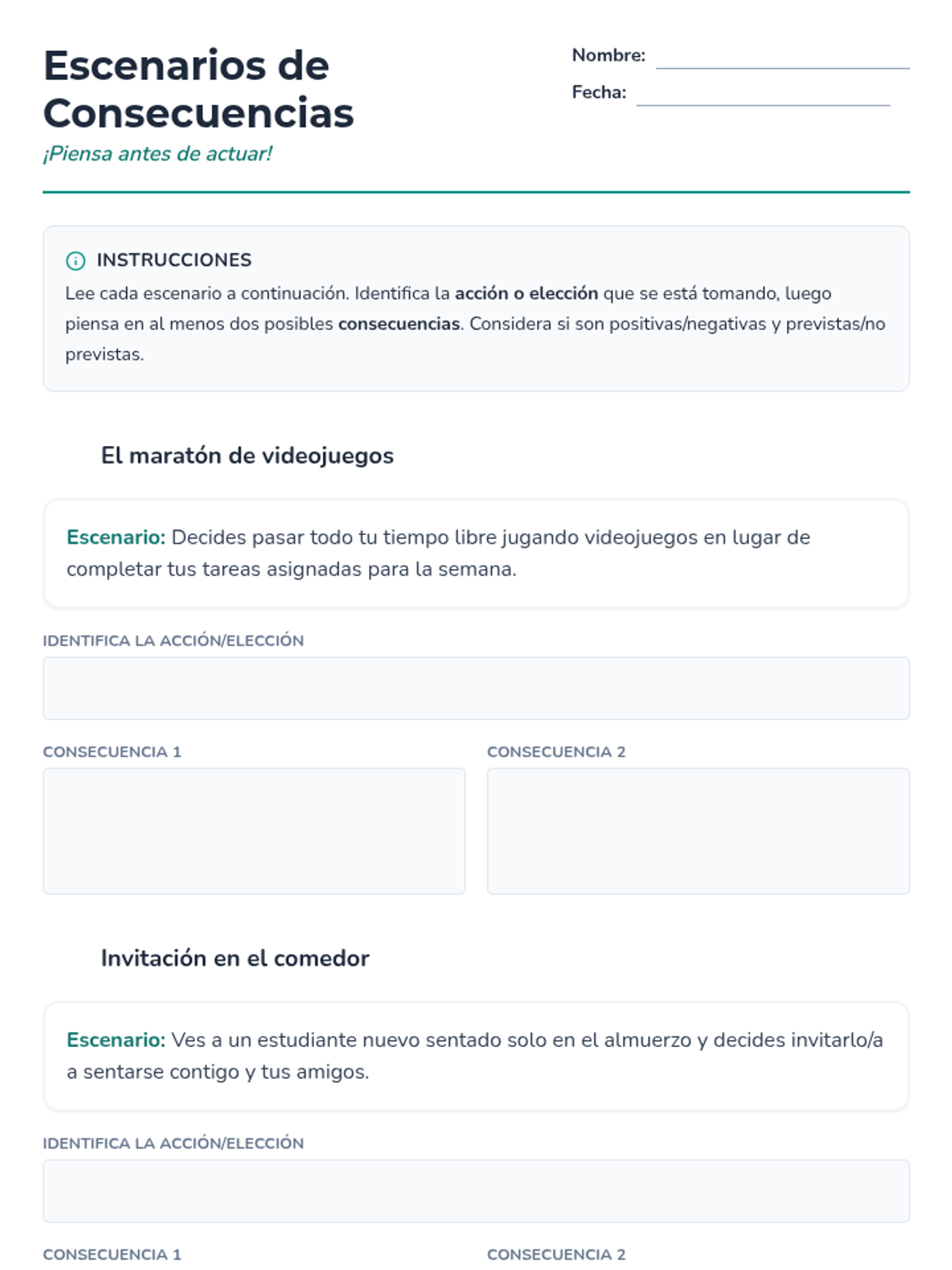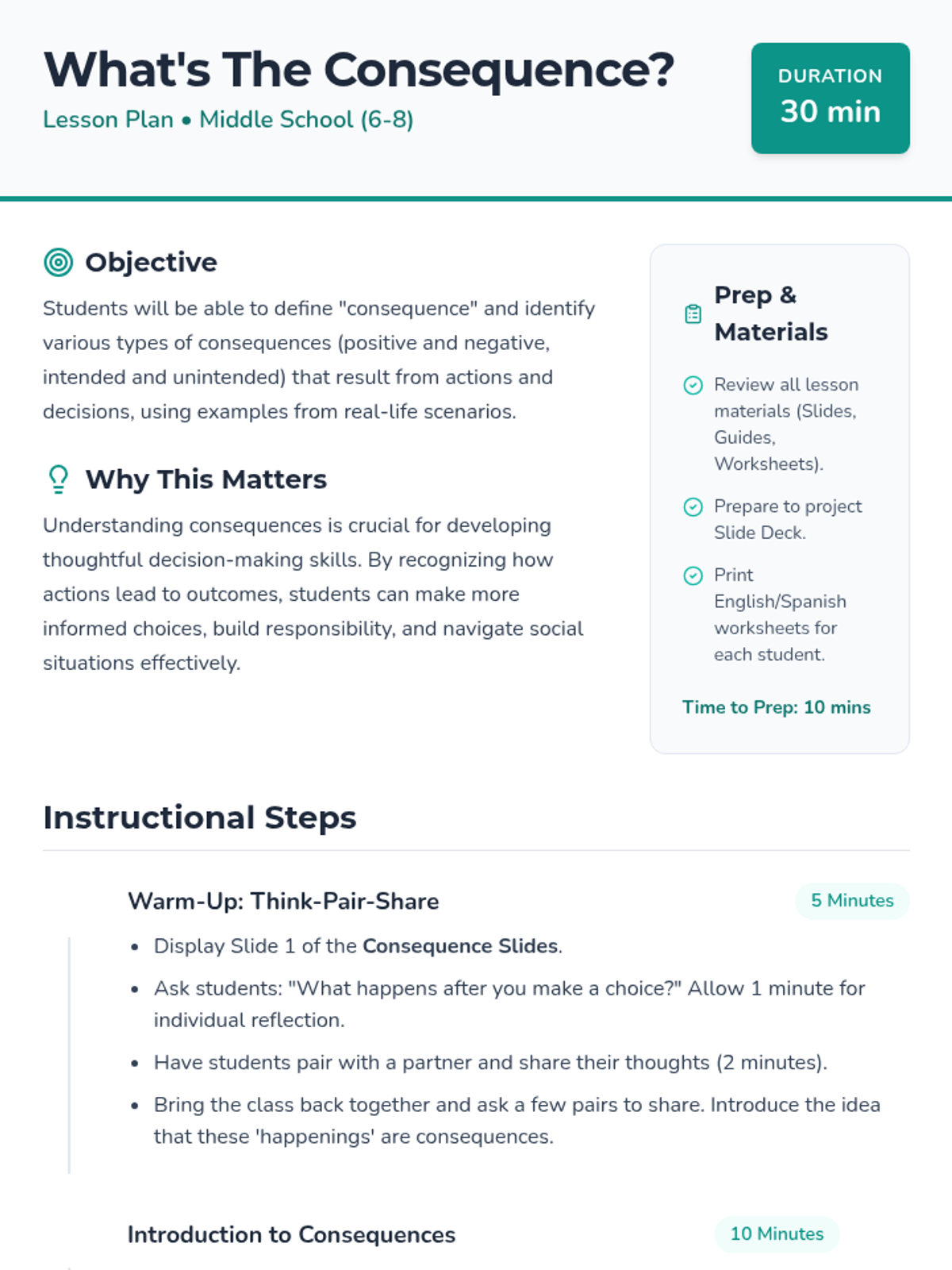 A 30-minute session for middle schoolers to explore how choices lead to outcomes, covering positive, negative, intended, and unintended consequences. Includes bilingual materials in English and Spanish.
