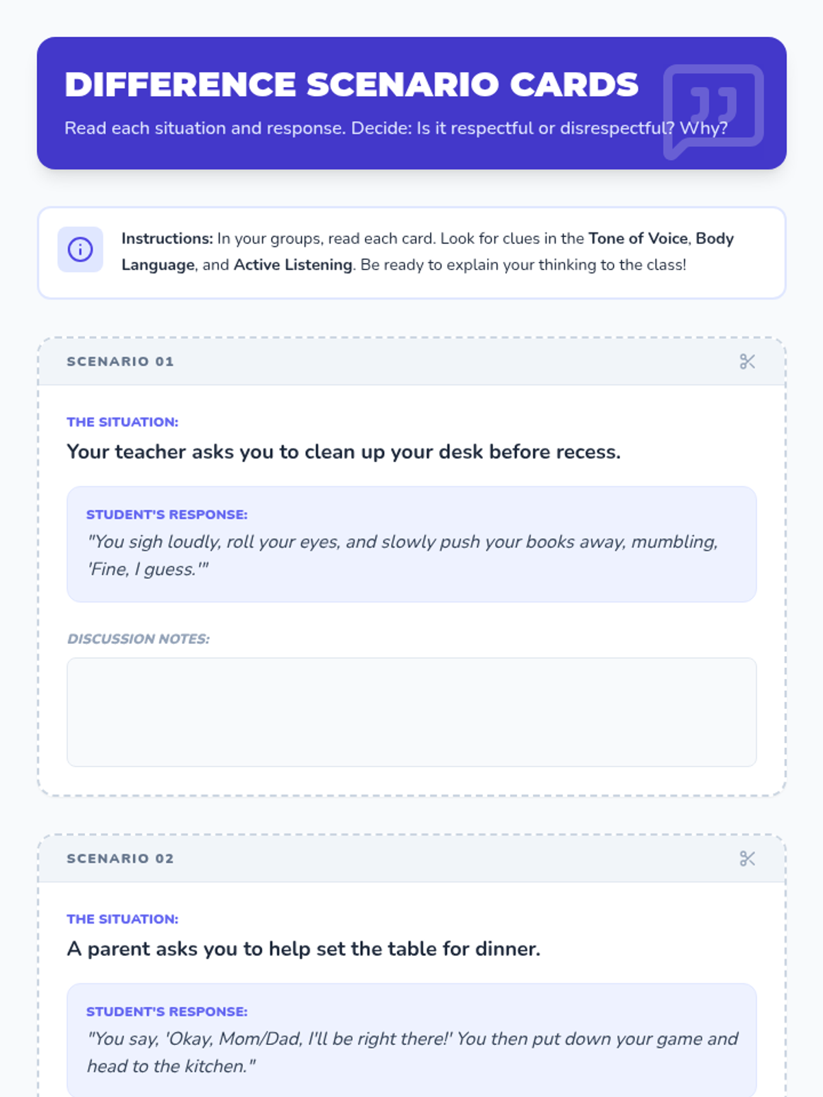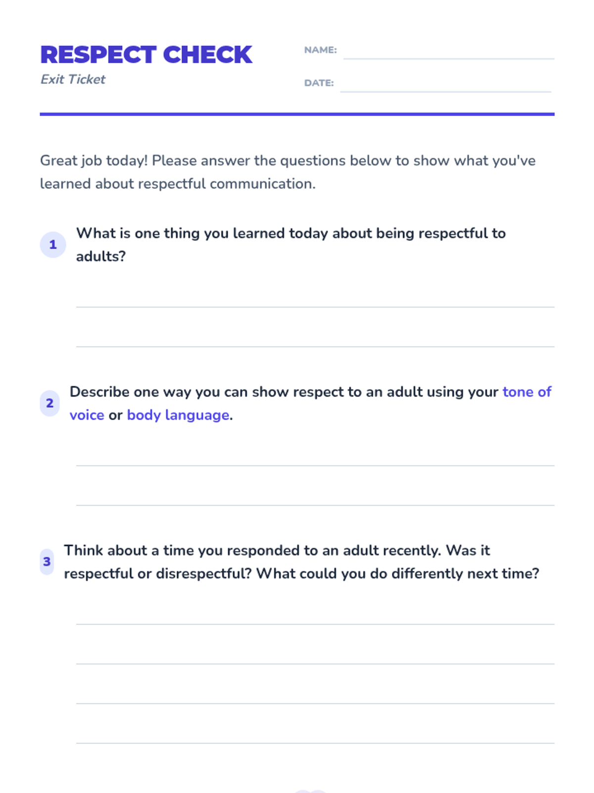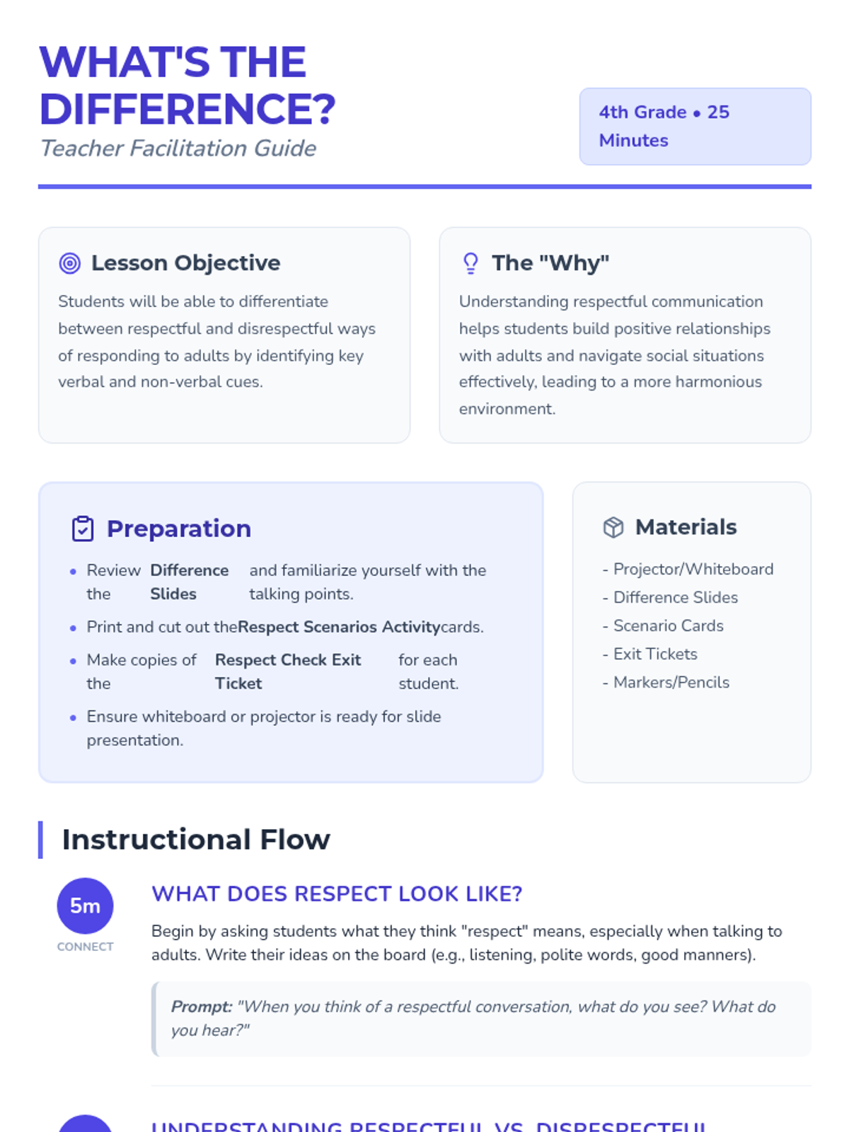 A 25-minute lesson for 4th graders on identifying and practicing respectful verbal and non-verbal communication with adults through scenarios and discussion.