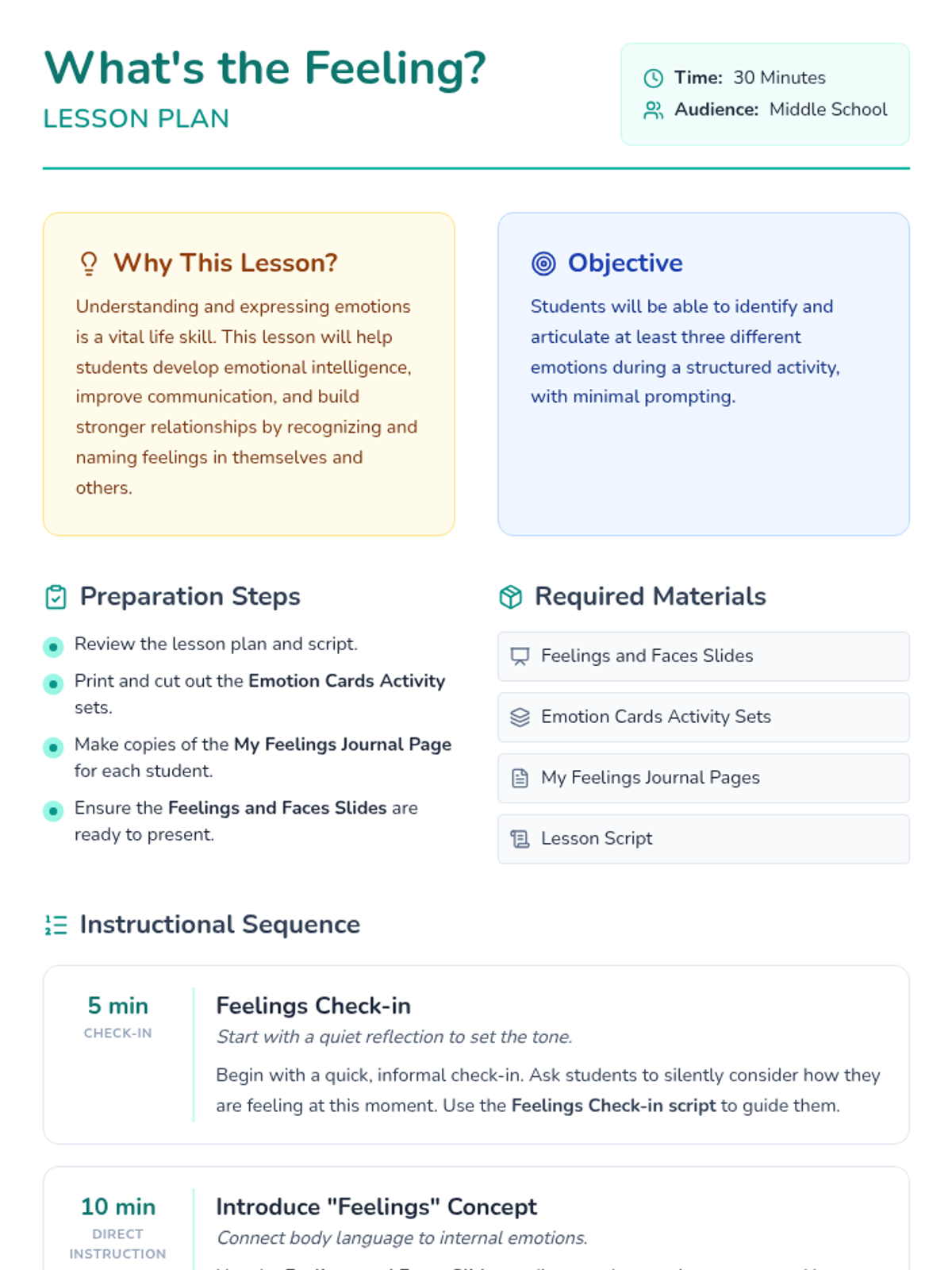 A 30-minute introductory lesson for middle schoolers on identifying emotions through body language and practicing "I feel" statements for better communication.