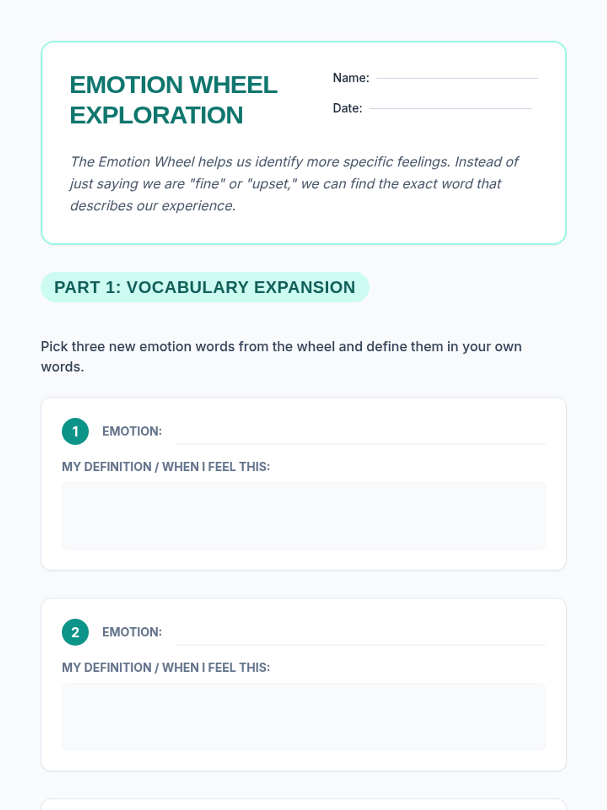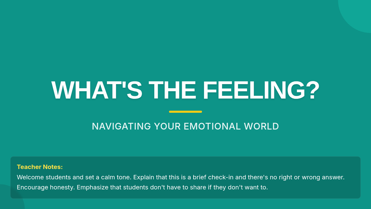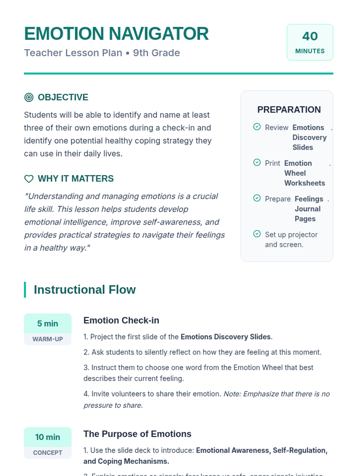 A 40-minute lesson for 9th graders focusing on identifying emotions using an emotion wheel and learning healthy coping strategies. Students engage in self-reflection, journaling, and group discussion to build emotional intelligence.