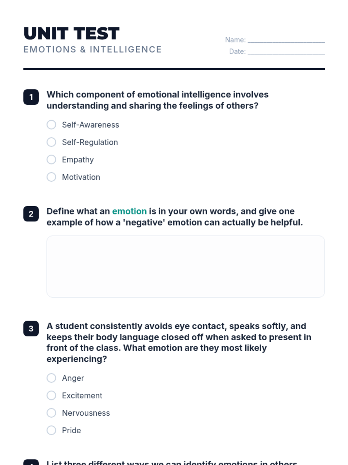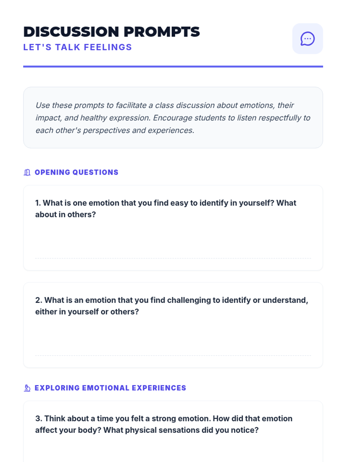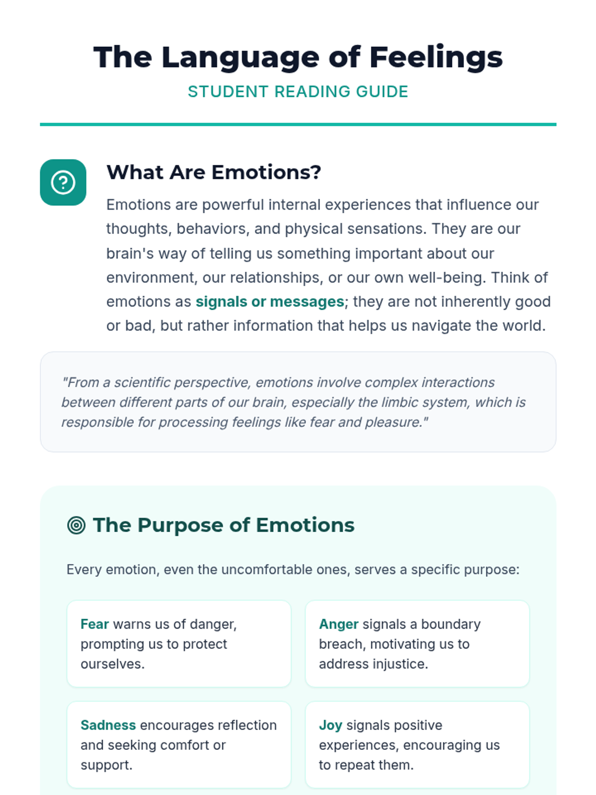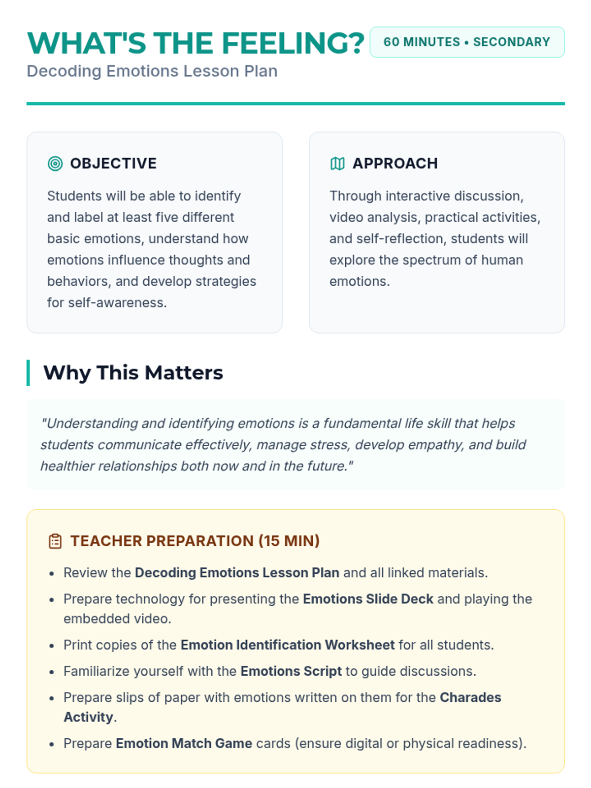 A comprehensive 60-minute lesson designed for secondary students to explore, identify, and understand a wide range of human emotions. Students develop emotional literacy through interactive activities, a slide presentation, and reflective exercises.