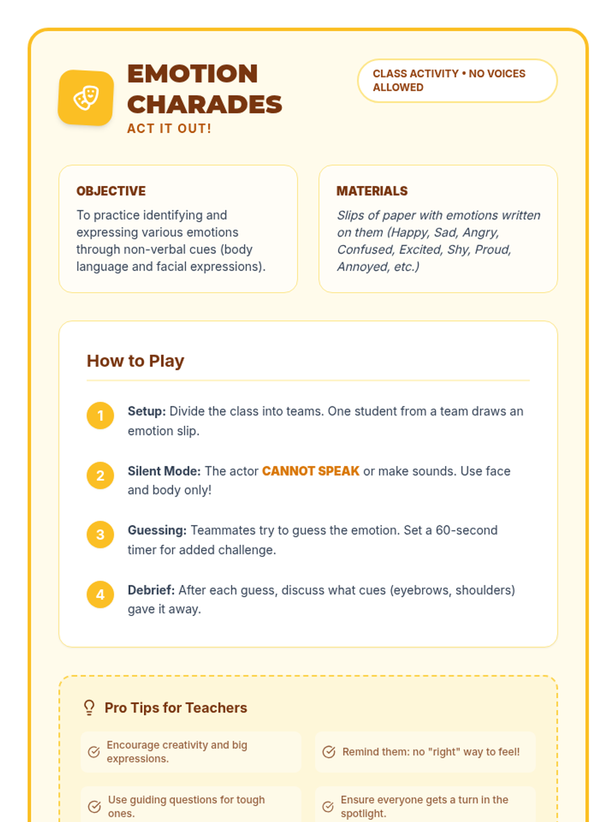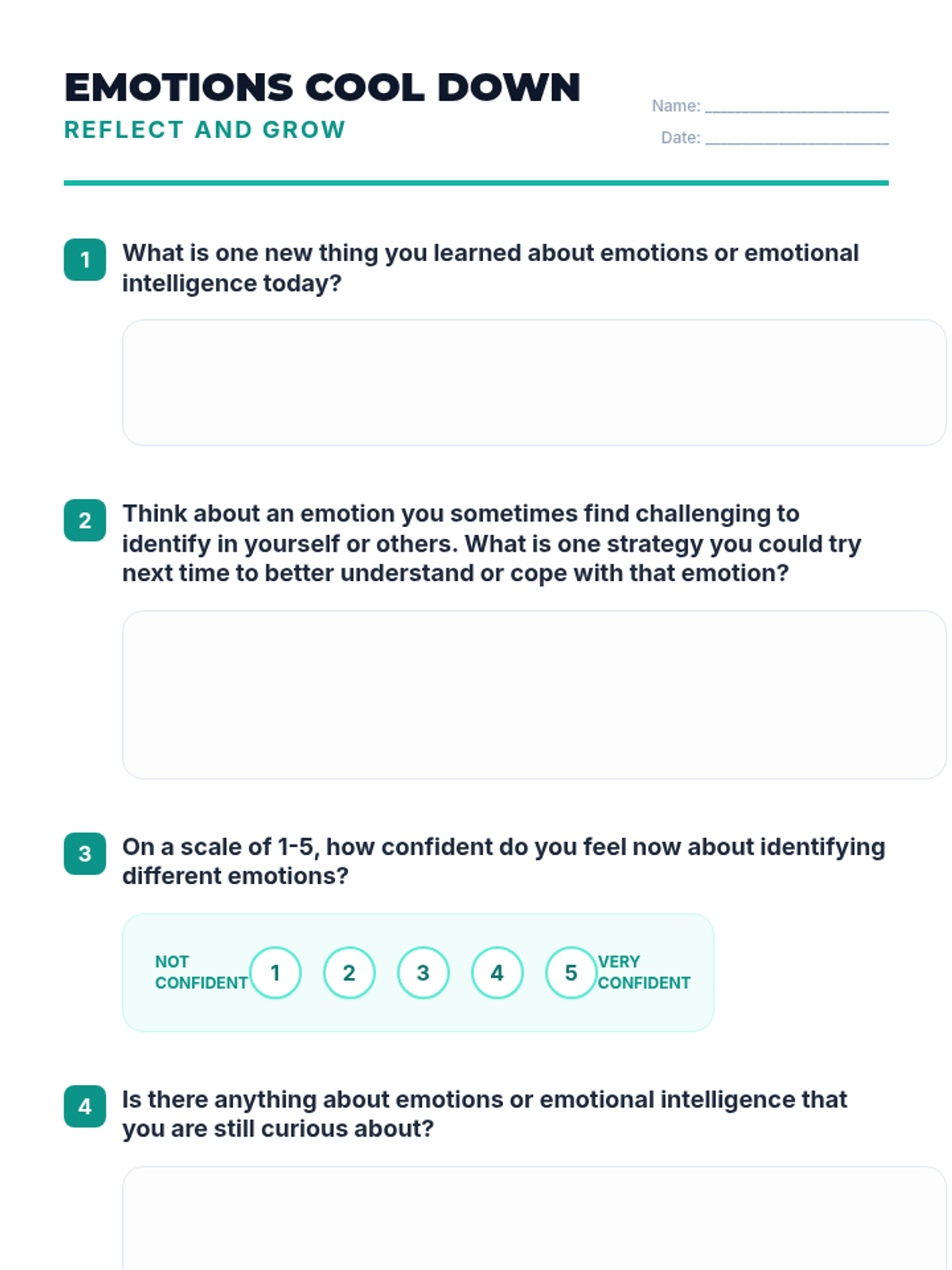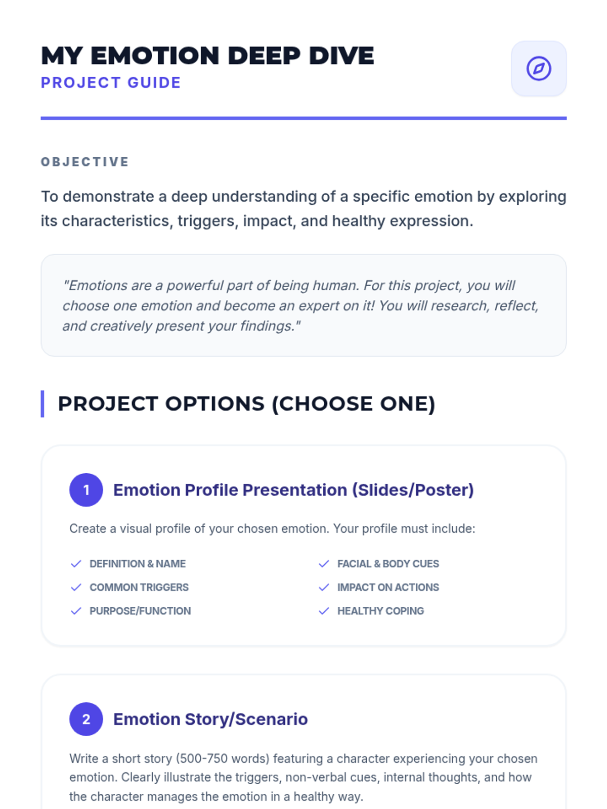 A comprehensive 60-minute lesson designed for secondary students to explore, identify, and understand a wide range of human emotions. Students develop emotional literacy through interactive activities, a slide presentation, and reflective exercises.