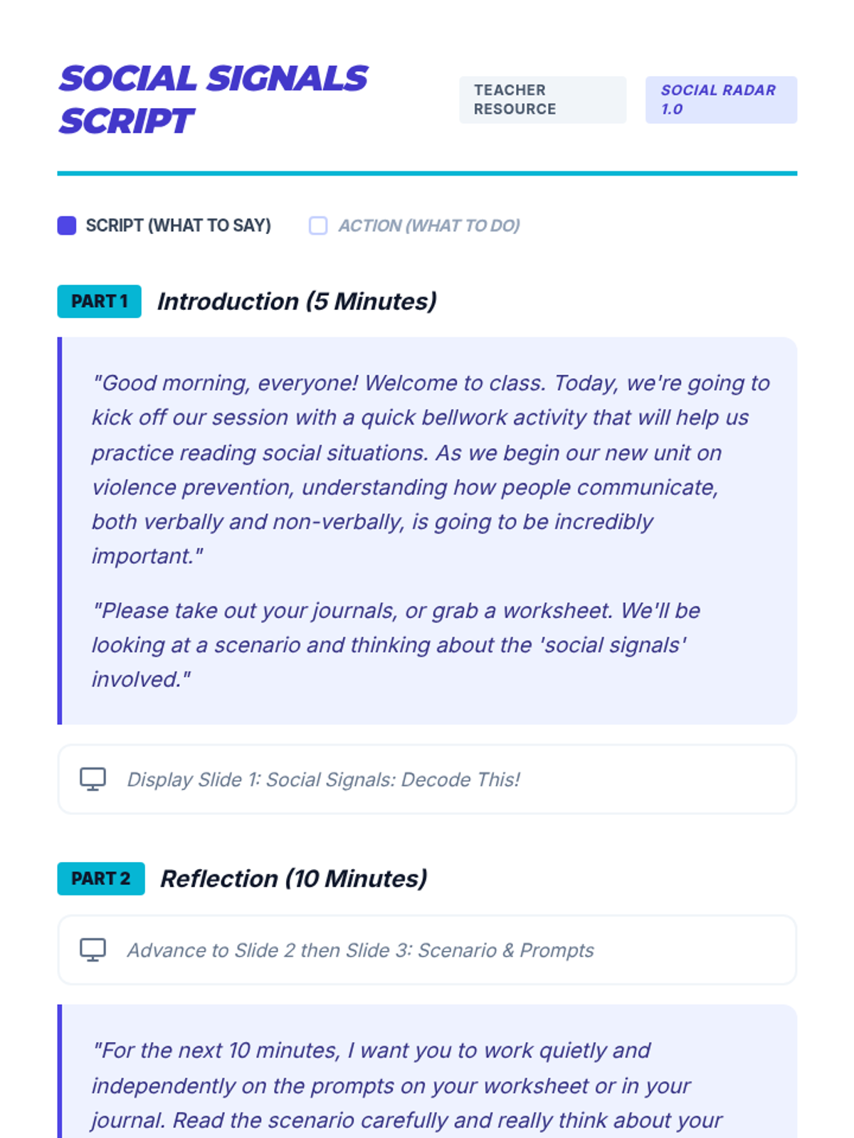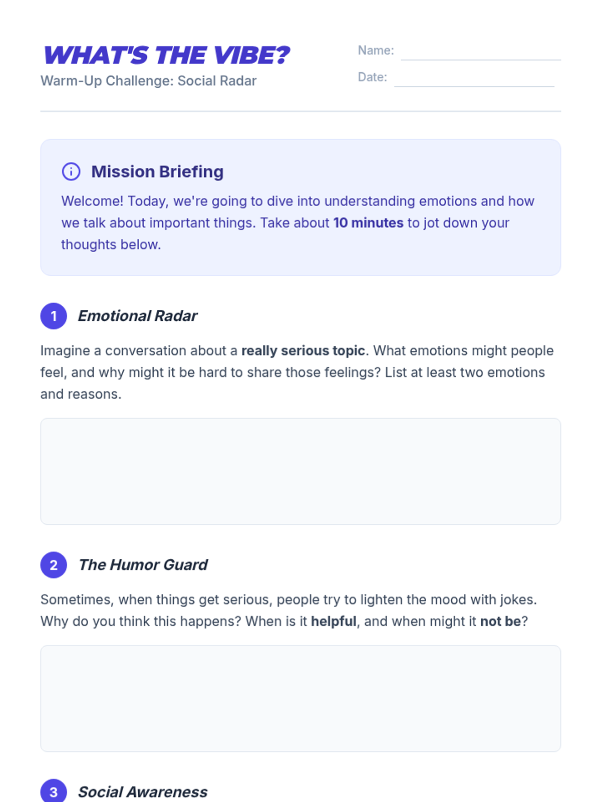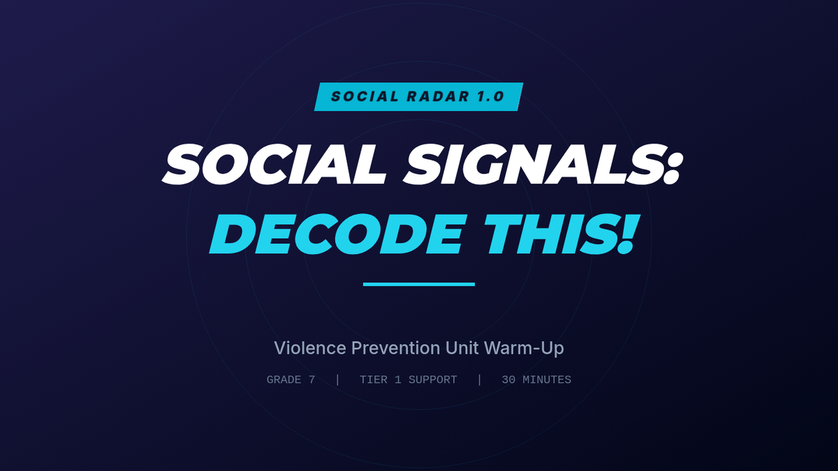 A 30-minute Tier 1 SEL lesson for 7th graders focused on social awareness, emotional literacy, and non-verbal communication as a foundation for violence prevention. Students analyze a social scenario to decode unspoken signals and reflect on the role of humor in serious conversations.