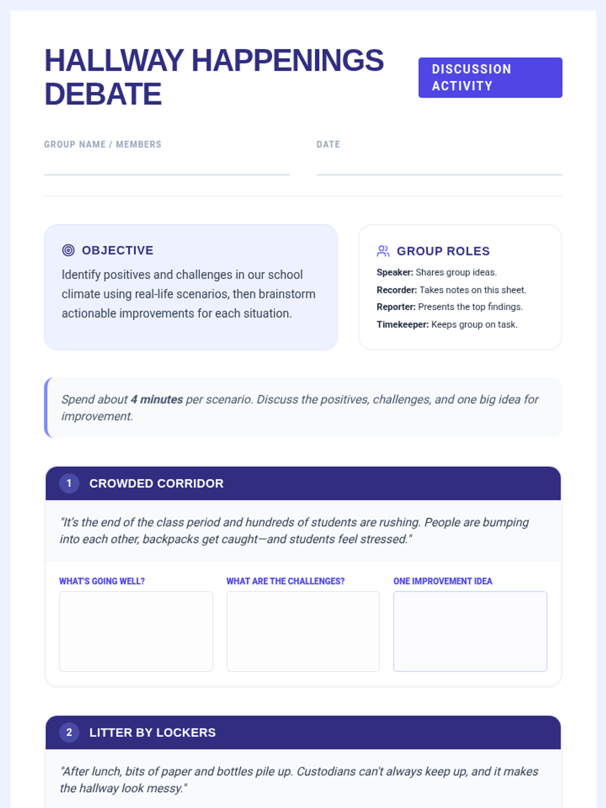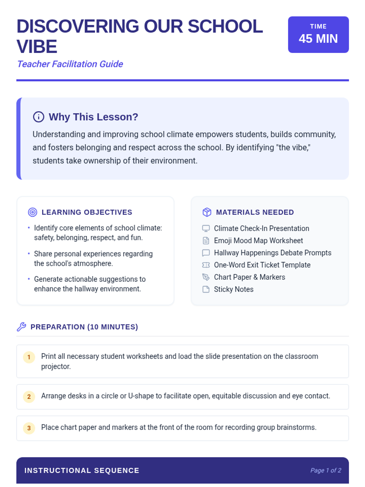 A 45-minute Tier 1 lesson for 6th graders to explore, define, and improve their school's climate through interactive activities and discussions.