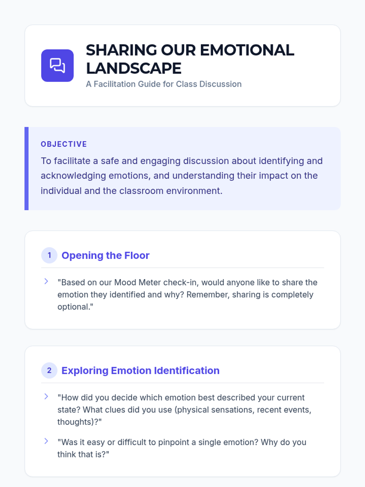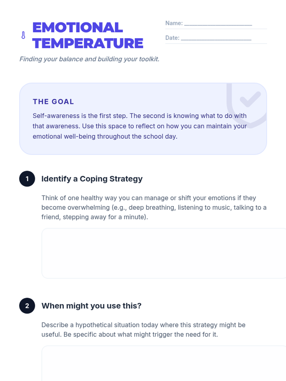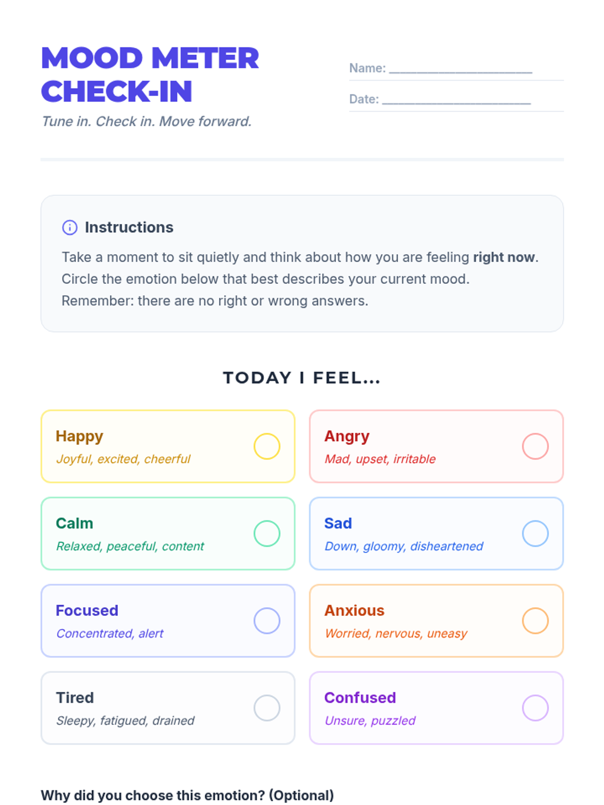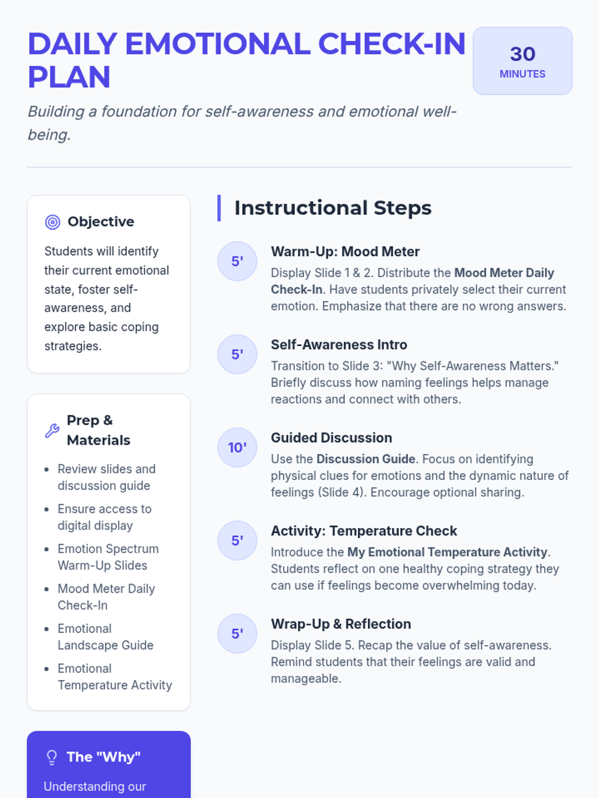 A 30-minute introductory session for 10th graders to practice emotional self-awareness through a mood meter check-in and discussion on coping strategies.
