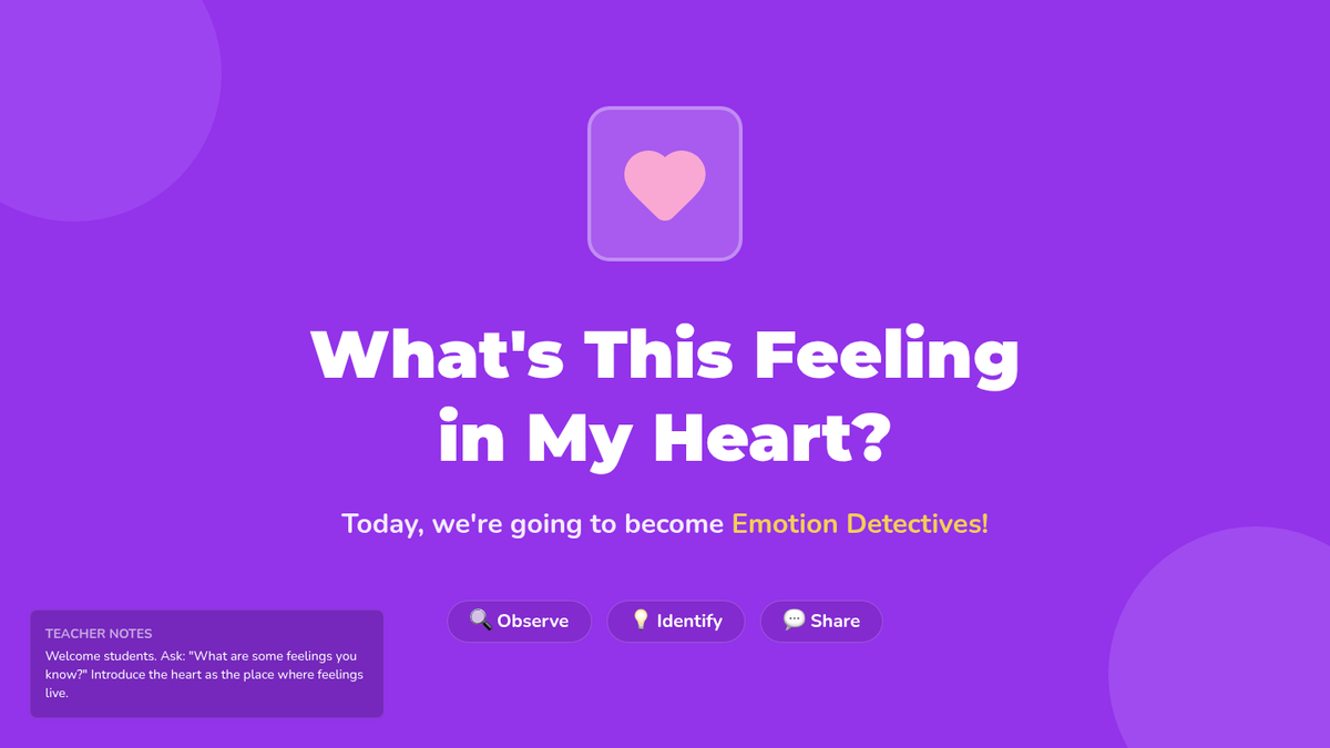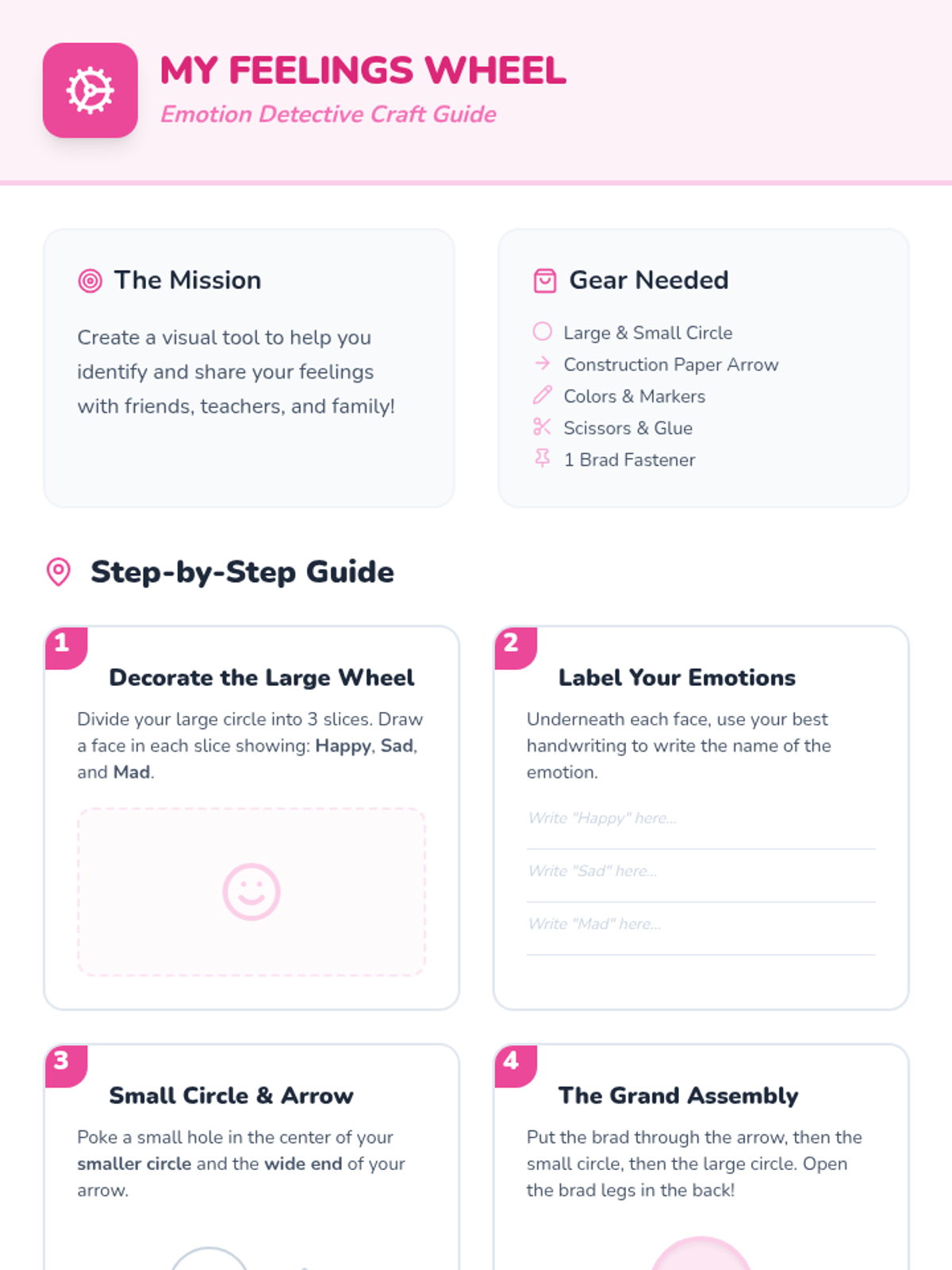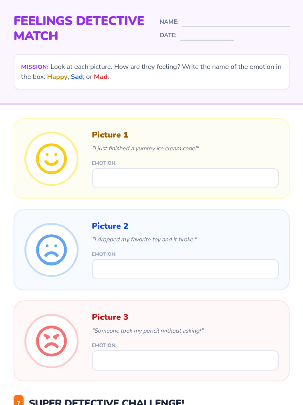 A 30-minute lesson for 2nd graders to identify and name basic emotions (happy, sad, mad) through videos, a hands-on craft, and reflective practice.