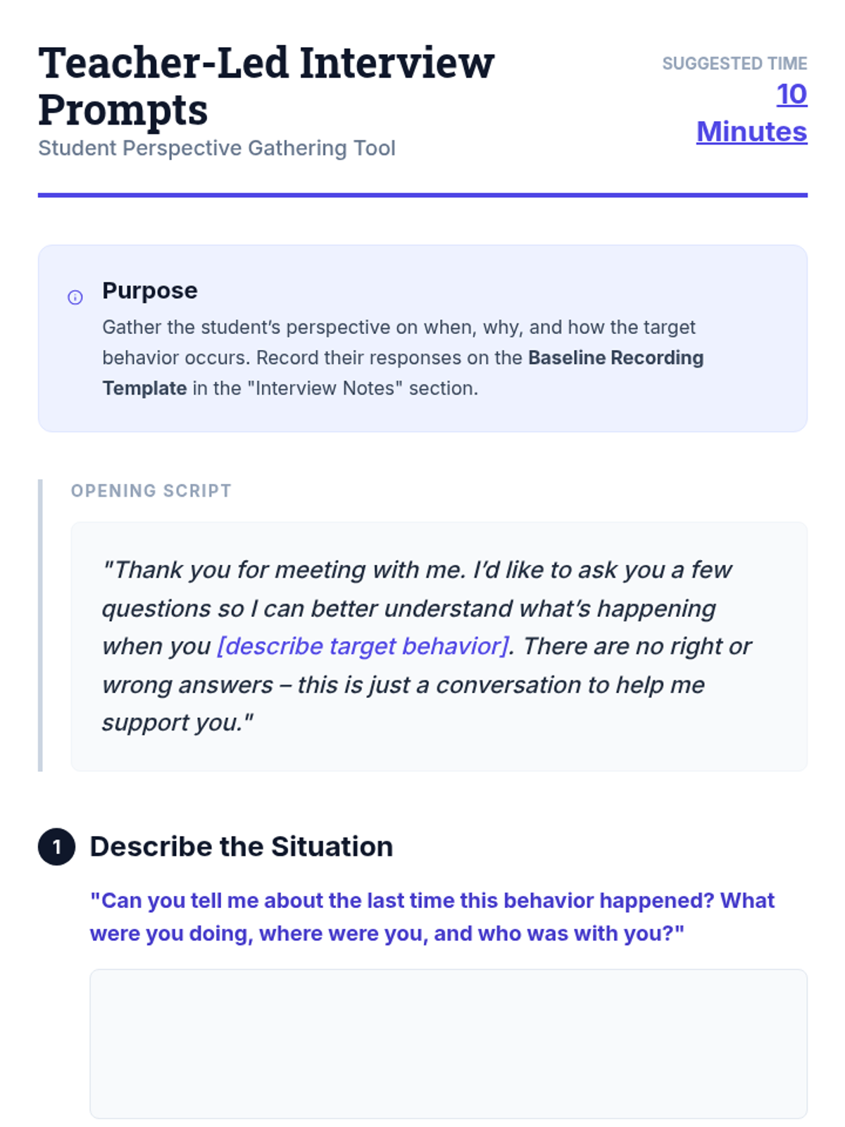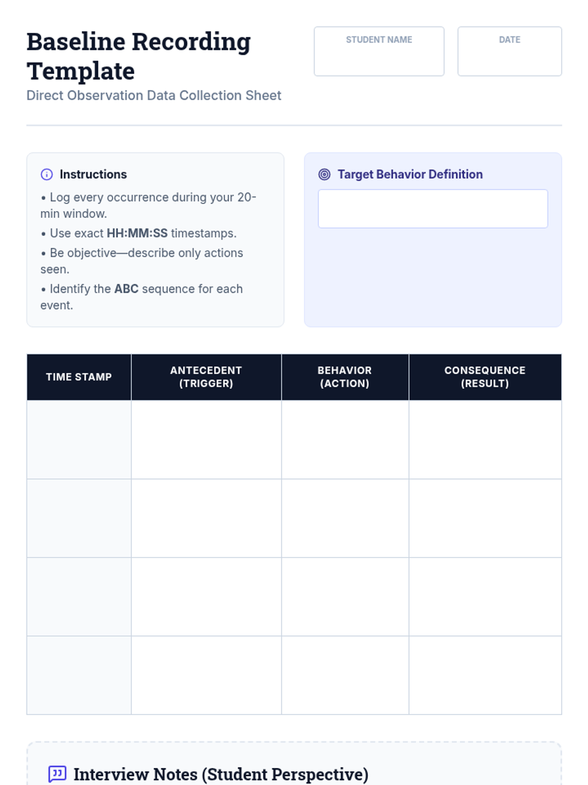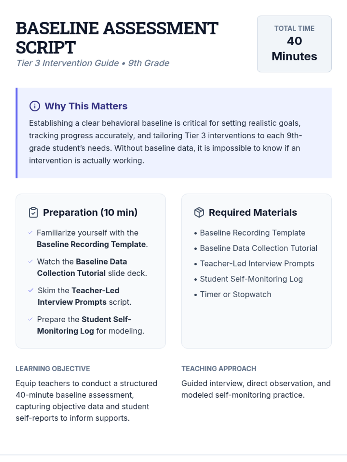 An individualized guide for Tier 3 teachers to establish specific behavioral baselines for 9th-grade students with intensive needs. Teachers learn to assess, record, and monitor behavior effectively using the ABC method and student interviews.