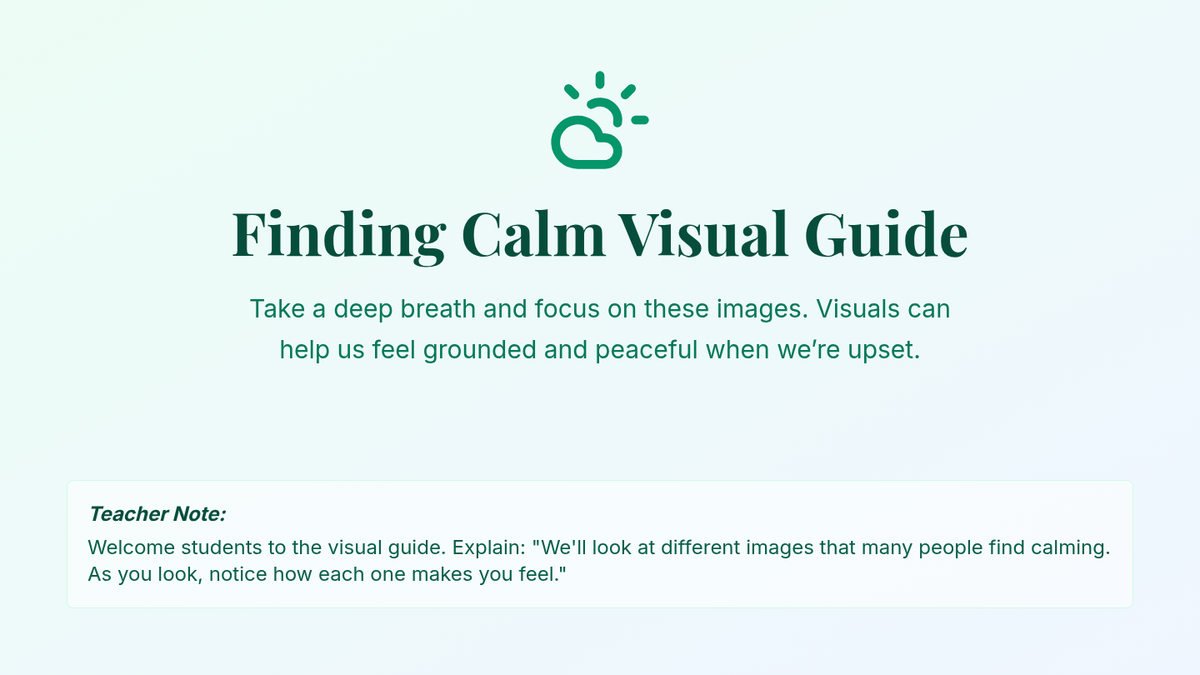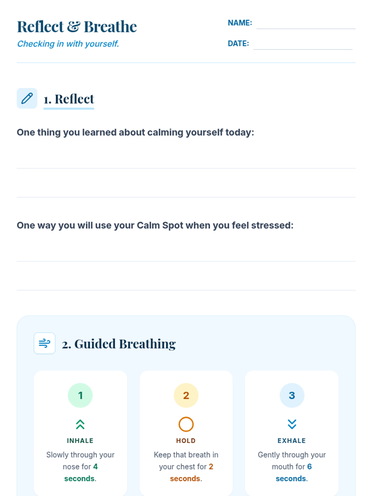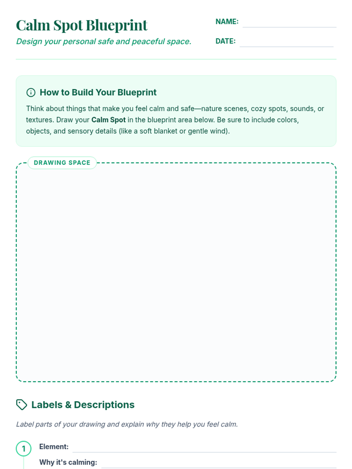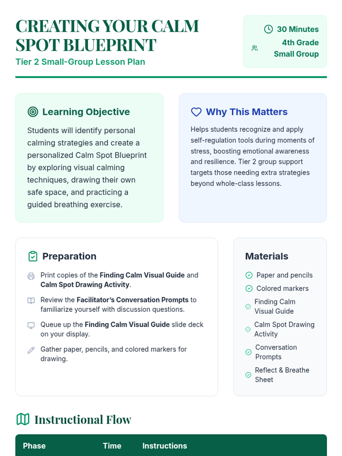 A Tier 2 small-group lesson for 4th graders focused on identifying and practicing personal calming strategies. Students explore visual calming techniques, create a Calm Spot Blueprint, and practice guided breathing to improve emotional regulation.