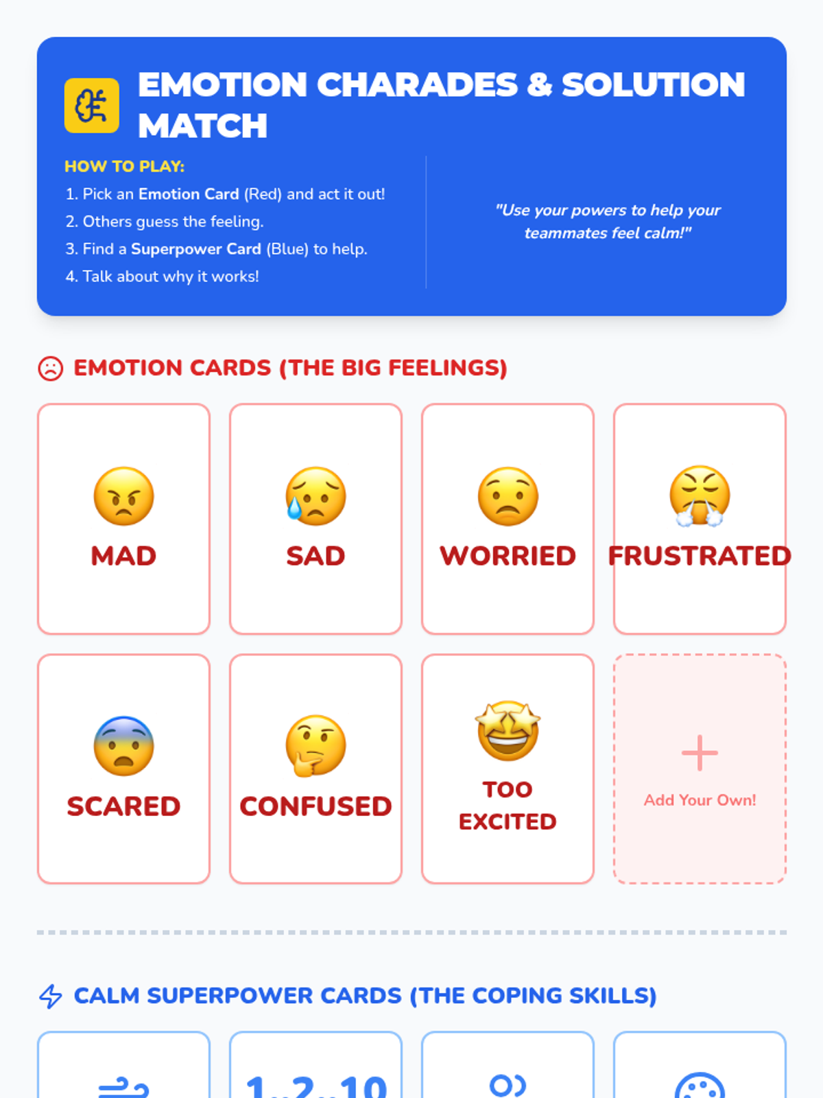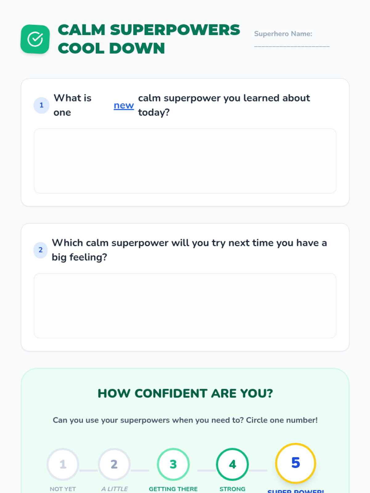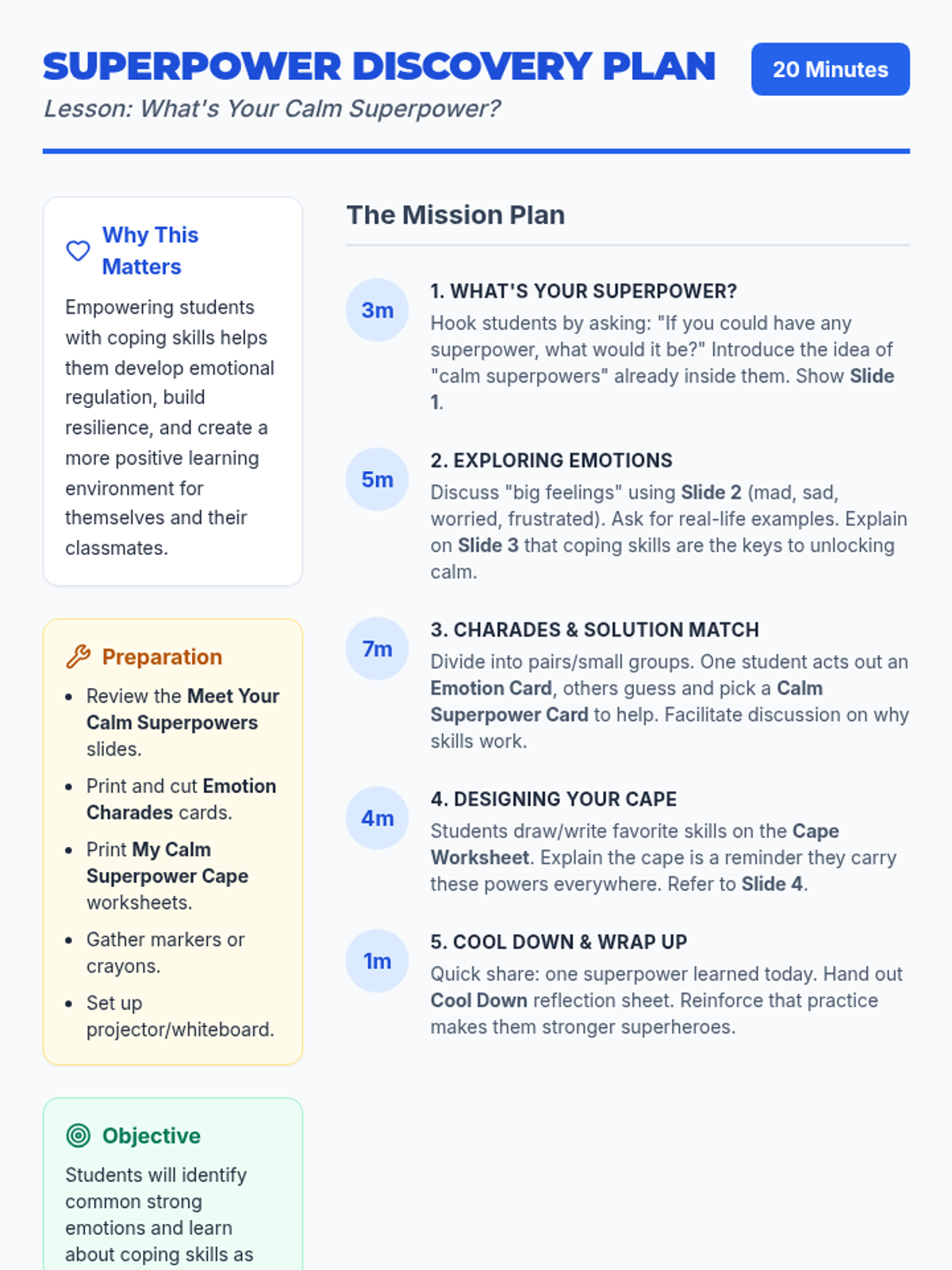 An interactive SEL lesson for 2nd graders to discover and practice coping skills as 'calm superpowers' to manage big emotions.