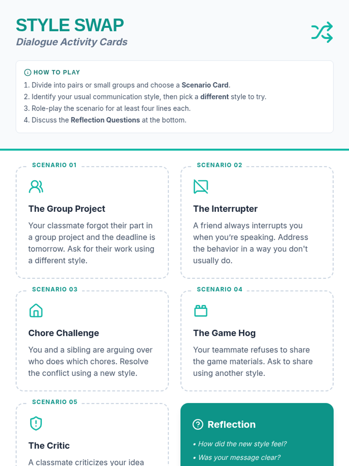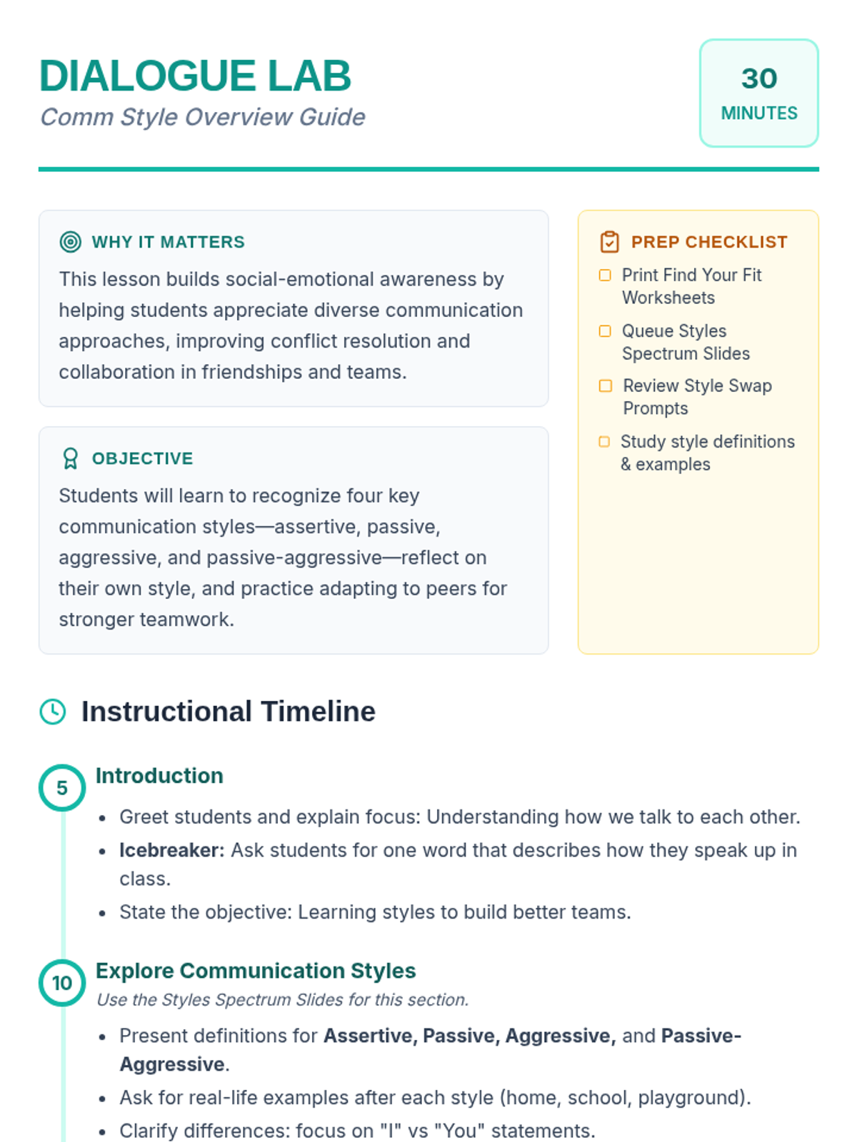 In this 30-minute small-group lesson, 5th graders explore four key communication styles (assertive, passive, aggressive, and passive-aggressive) to improve their social-emotional awareness and collaboration skills.