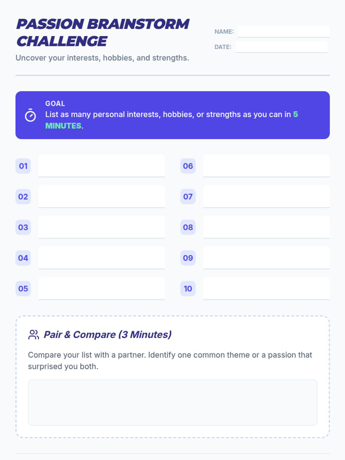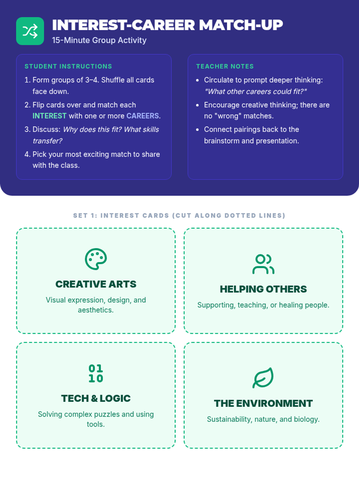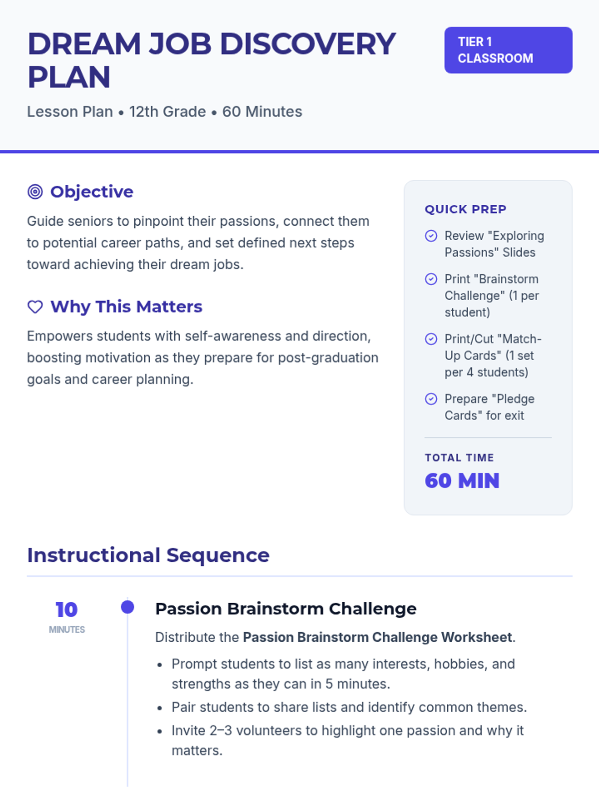 A comprehensive 60-minute lesson designed for 12th graders to explore their personal passions and map them to potential career paths through brainstorming, matching activities, and structured reflection.