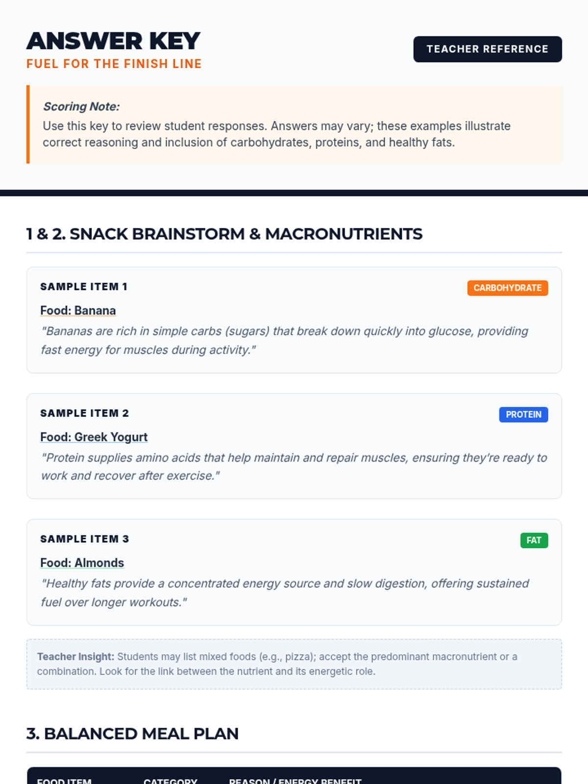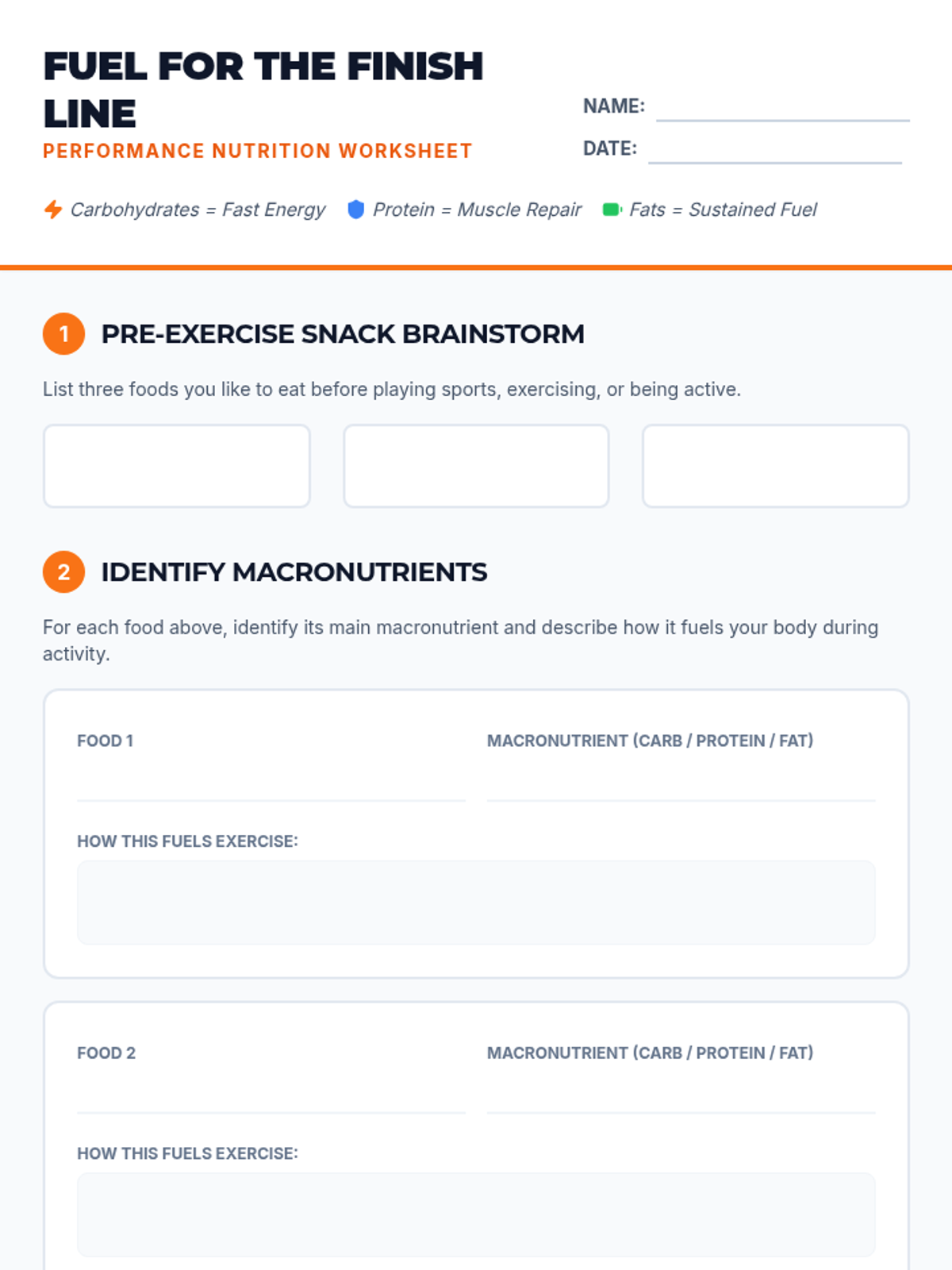 A 30-minute lesson for 7th graders exploring how macronutrients fuel physical activity and performance. Students will analyze food groups and design a balanced meal to optimize their energy for exercise.