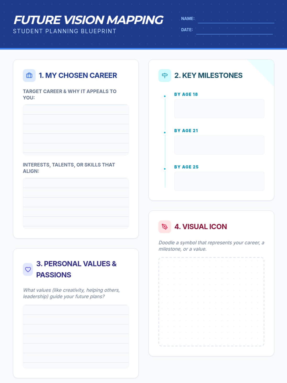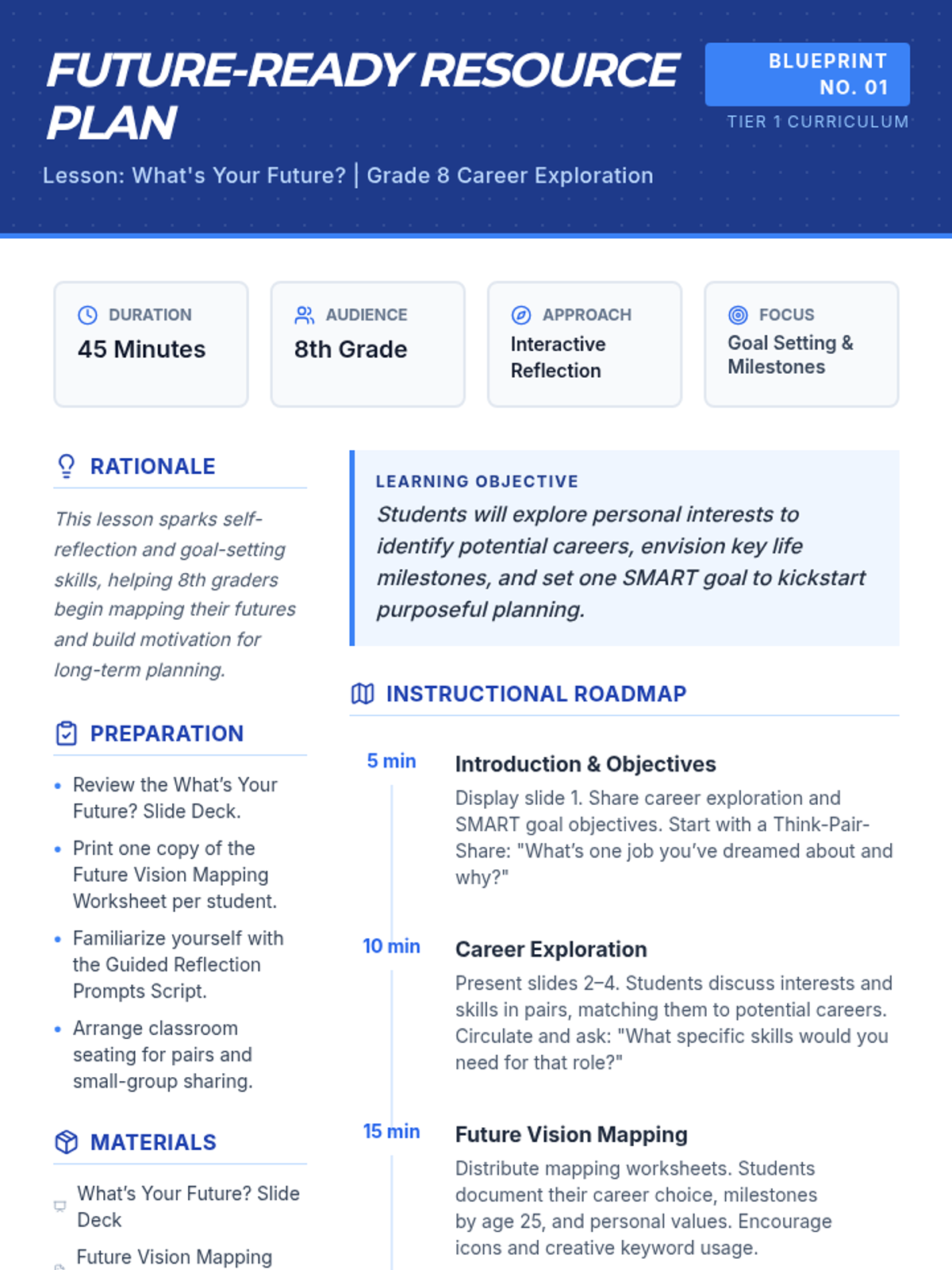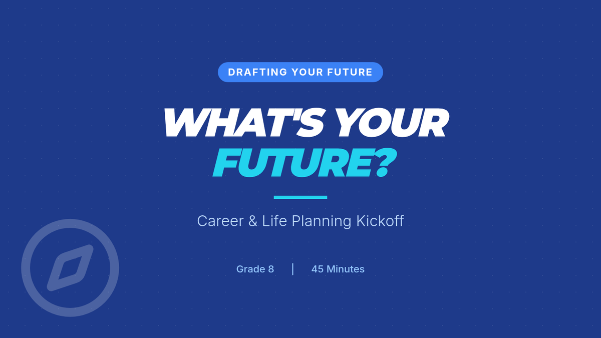 A single-session, 45-minute Tier 1 lesson for 8th graders that sparks self-reflection on career and life goals. Students explore interests, envision milestones, and set a SMART goal.