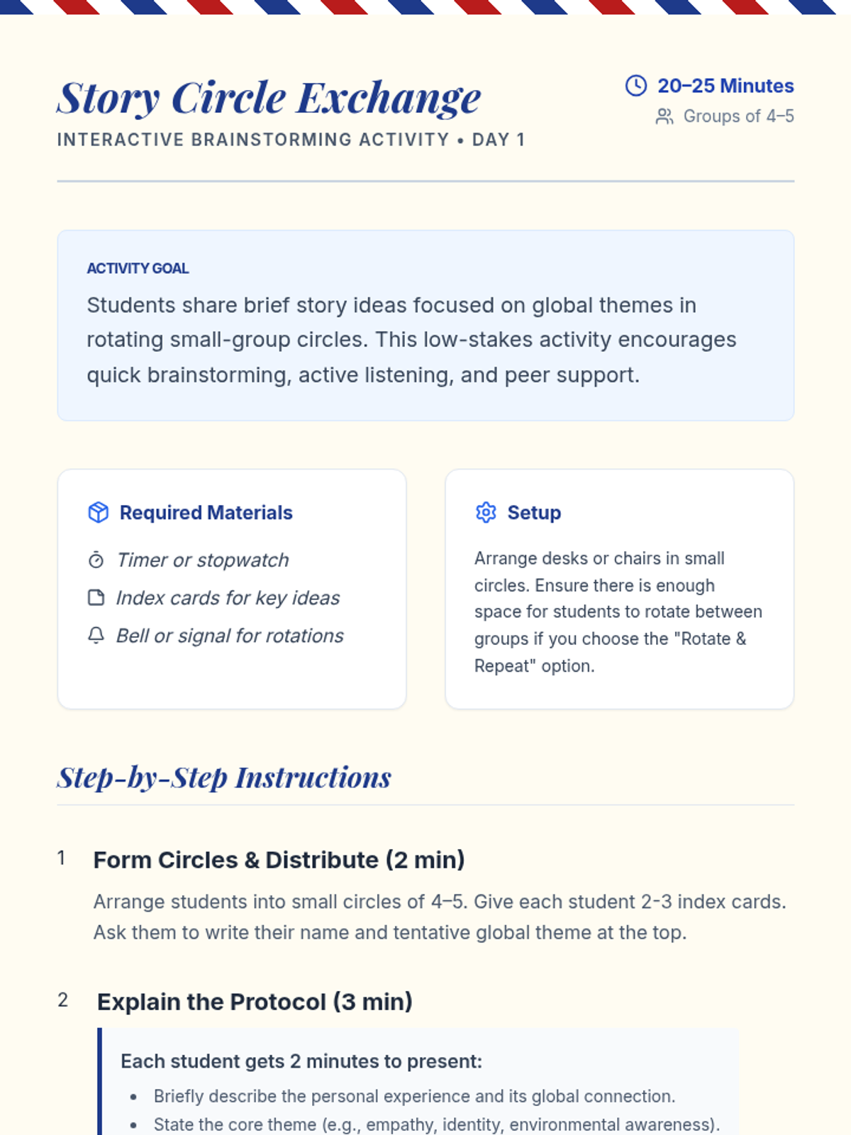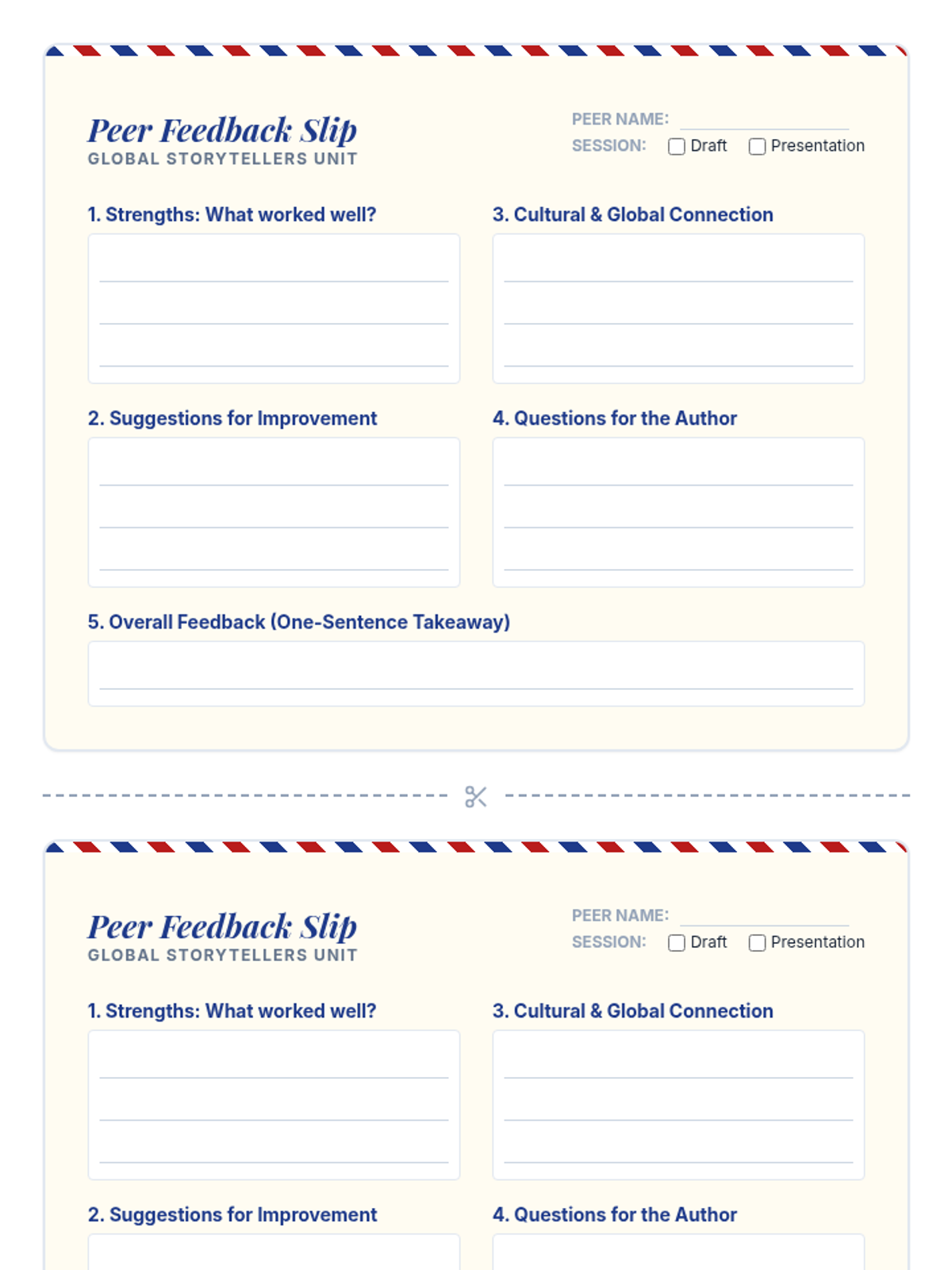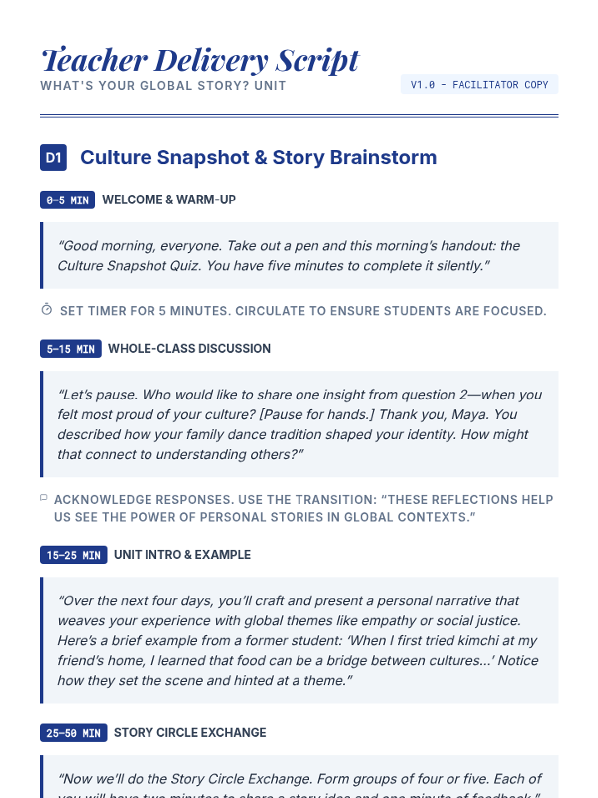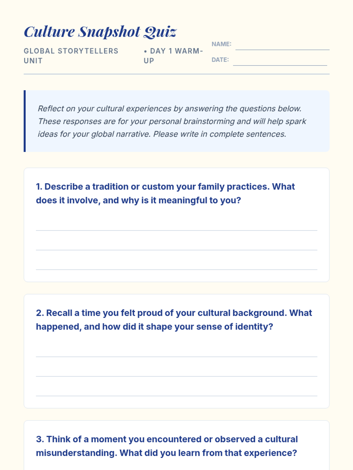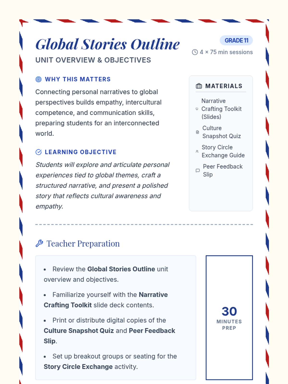 A comprehensive 4-session unit where students craft personal global narratives, moving from cultural reflection to polished presentations.