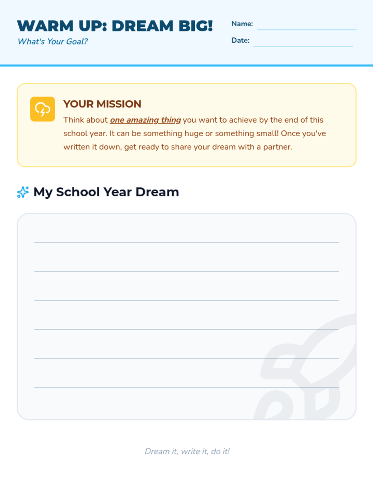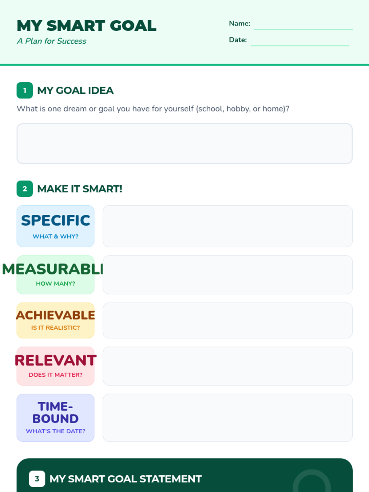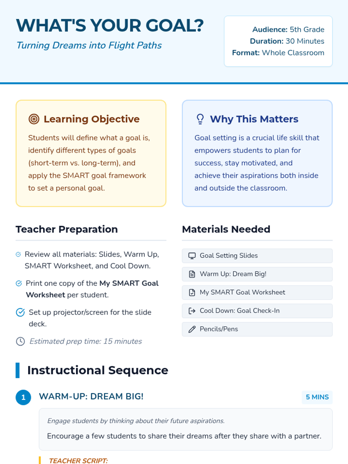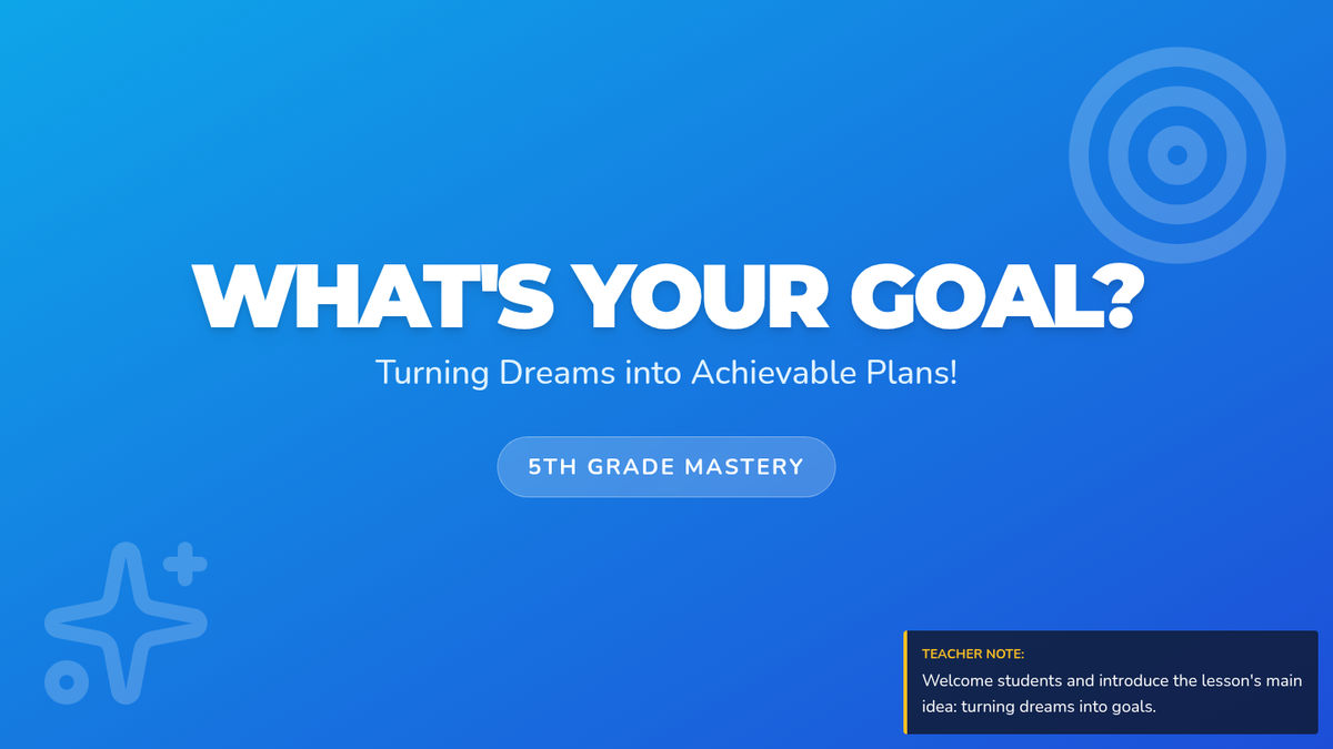 A 30-minute interactive lesson for 5th graders to master the SMART goal-setting framework and turn their dreams into actionable plans.