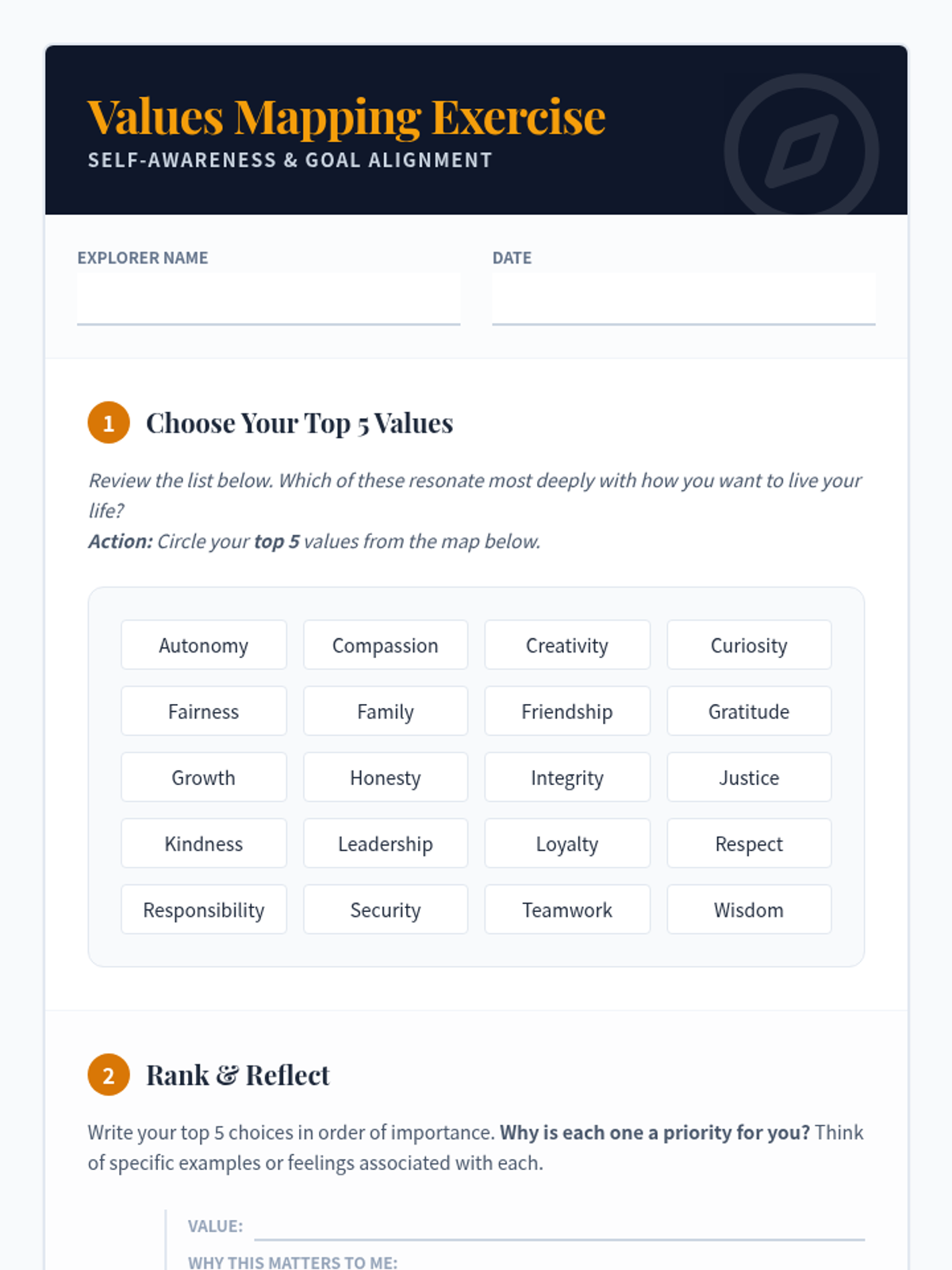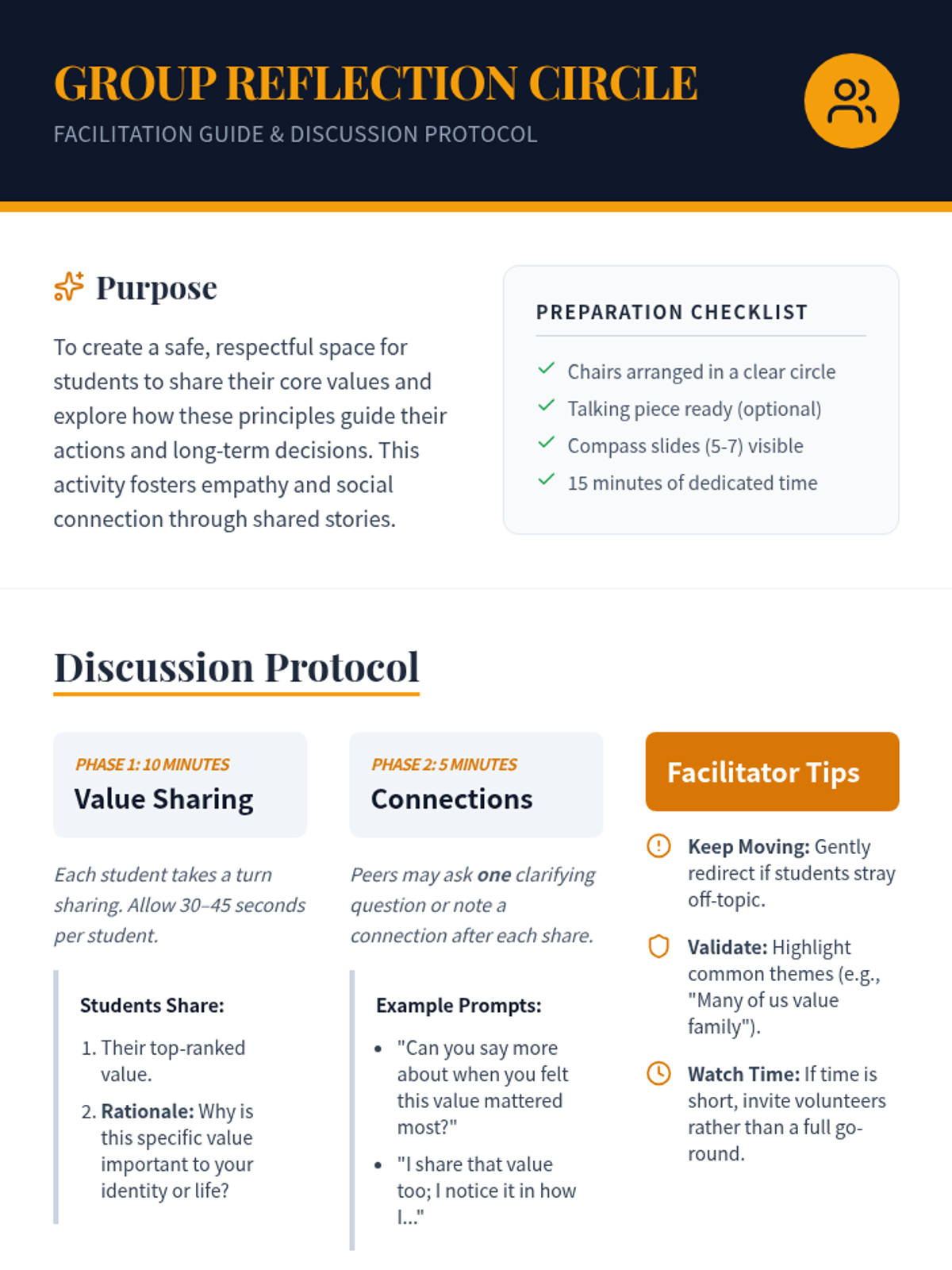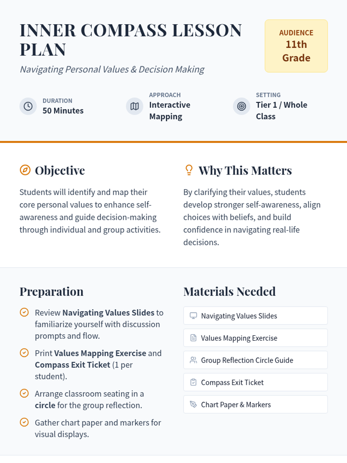 A 50-minute Tier 1 lesson for 11th graders focused on identifying personal values and mapping them to daily actions and long-term decisions. Students engage in individual reflection and group discussion to build self-awareness.