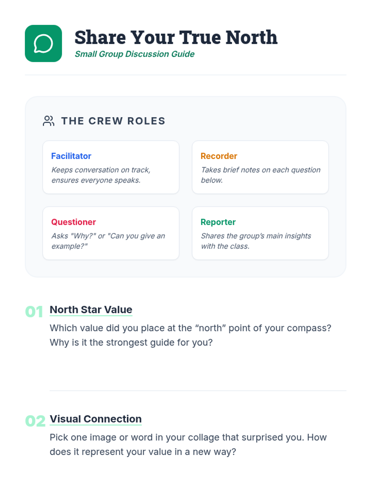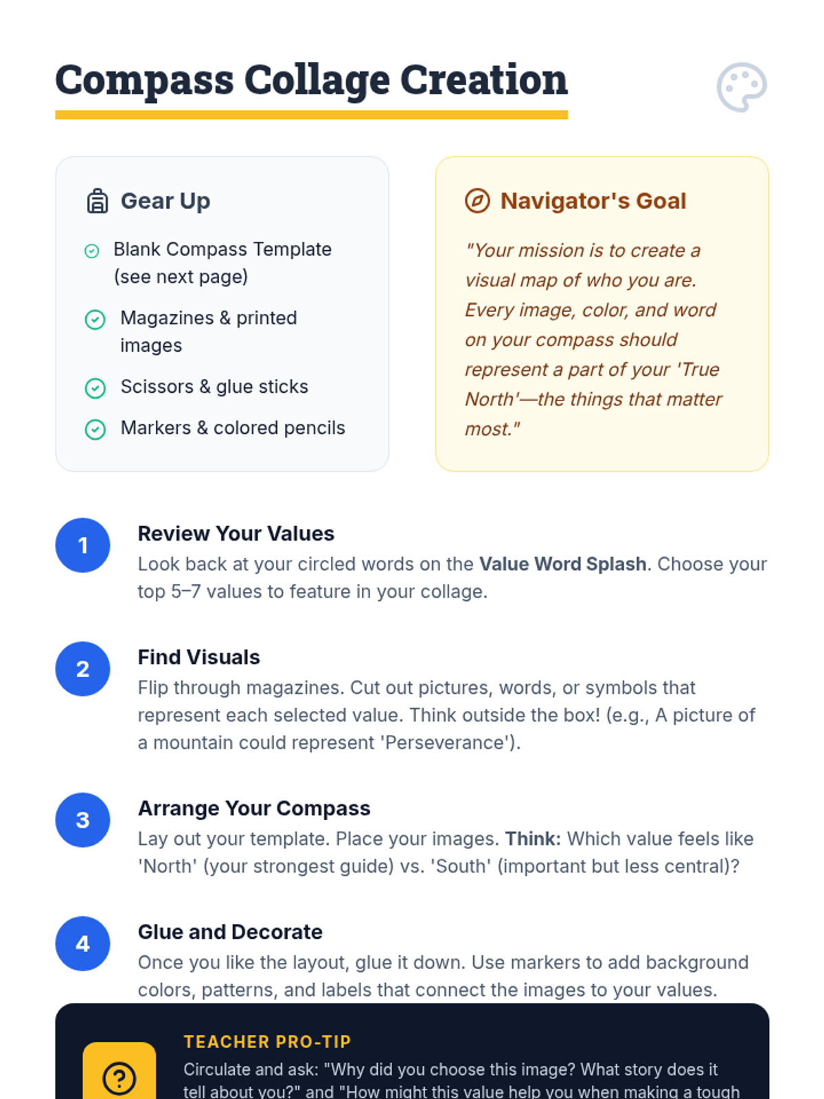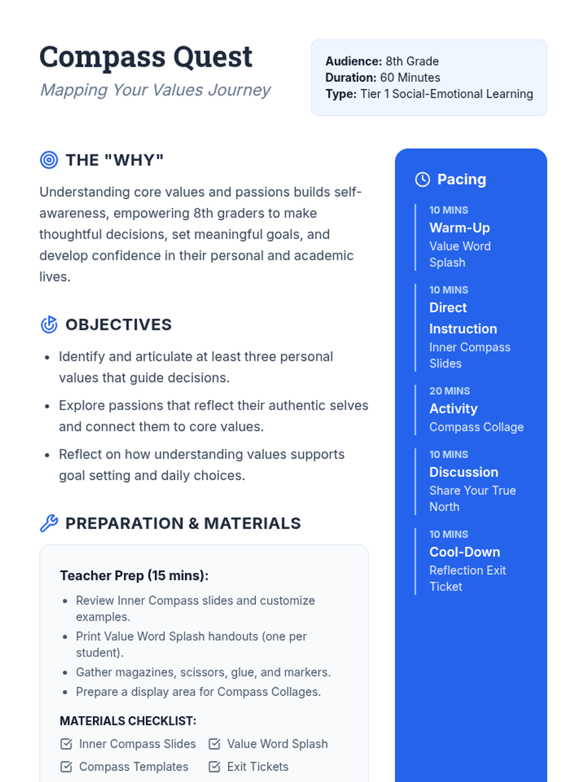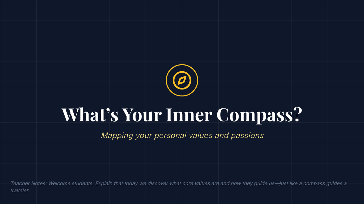 A 60-minute Tier 1 classroom lesson designed for 8th graders to explore their personal values and passions through interactive discussion and creative collage-making. Students identify their 'True North' to help guide future decision-making and goal-setting.