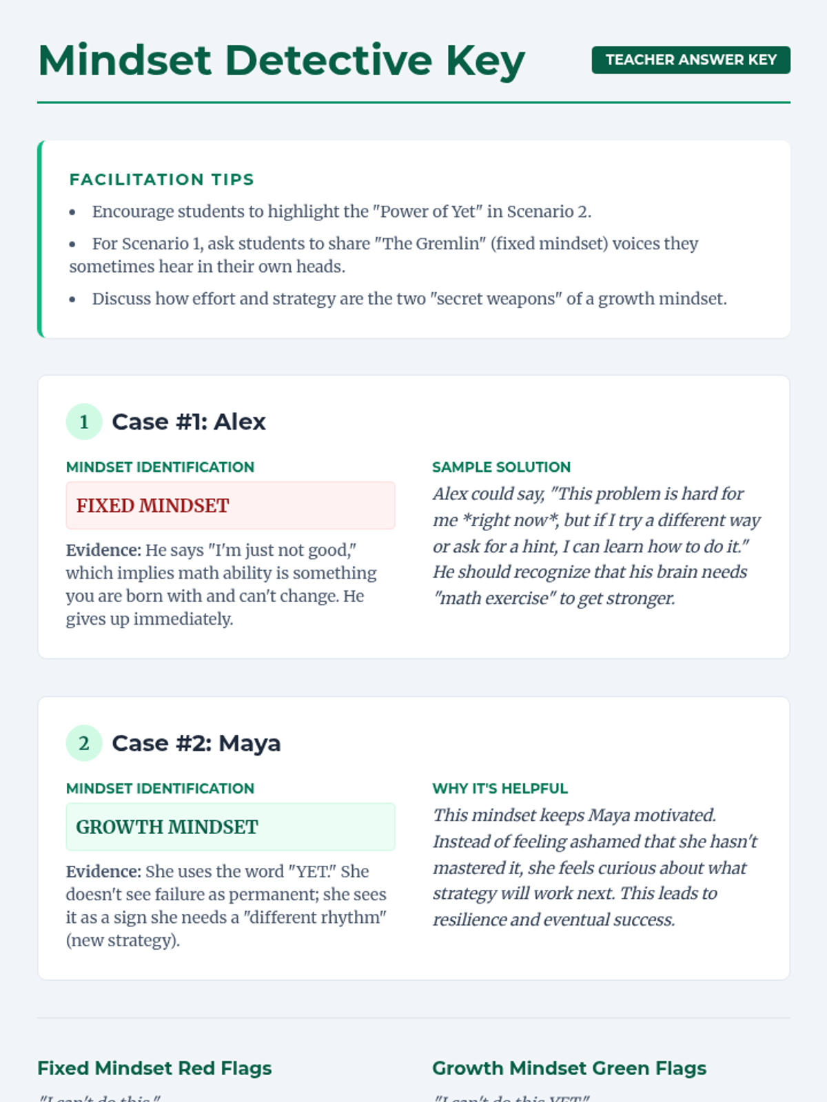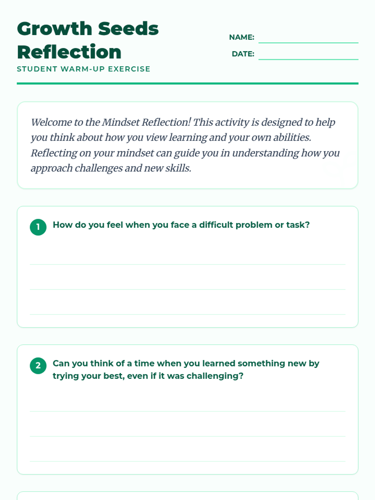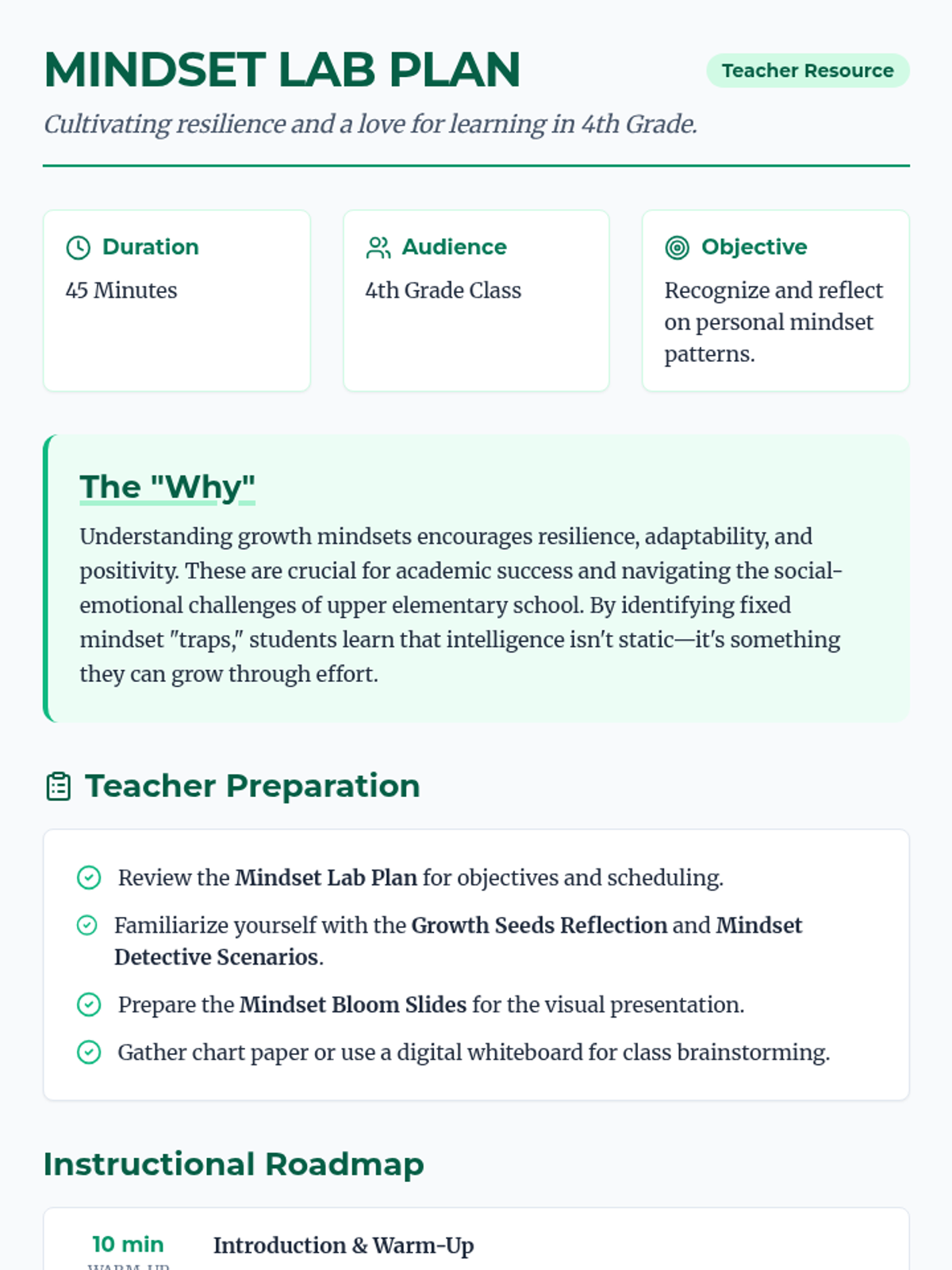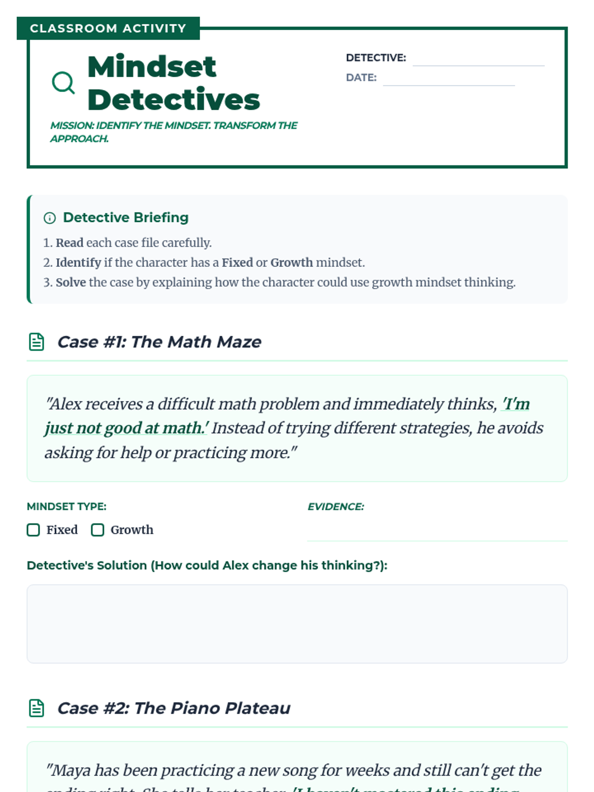 Introduce students to the concept of a growth mindset by exploring the difference between fixed and growth mindsets through engaging activities. This lesson will empower students to recognize their own mindset and understand how it can impact their learning and behavior.