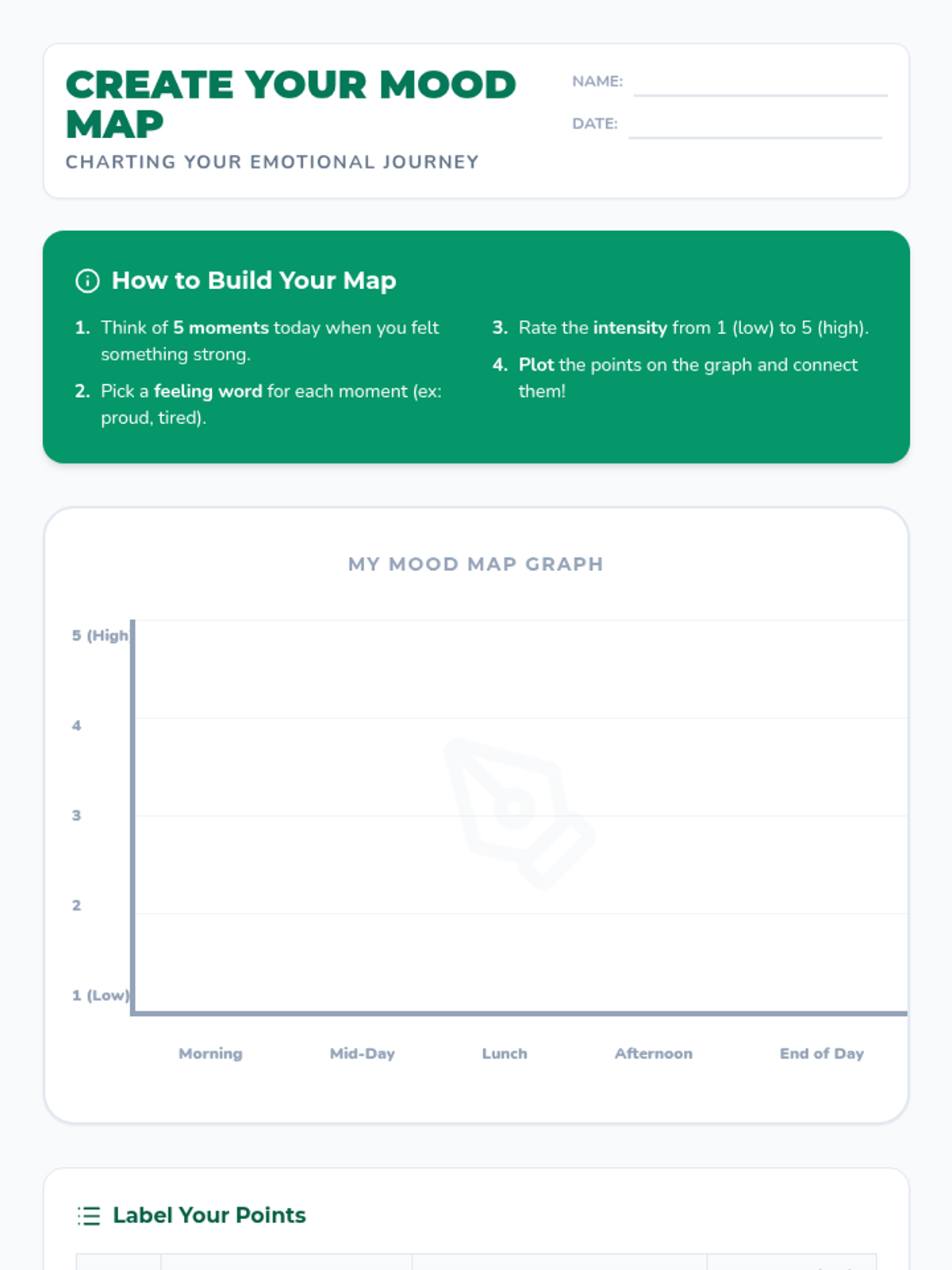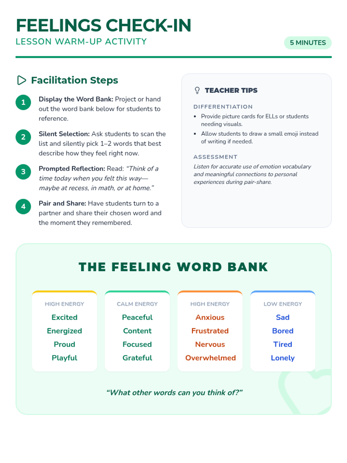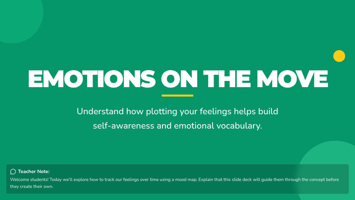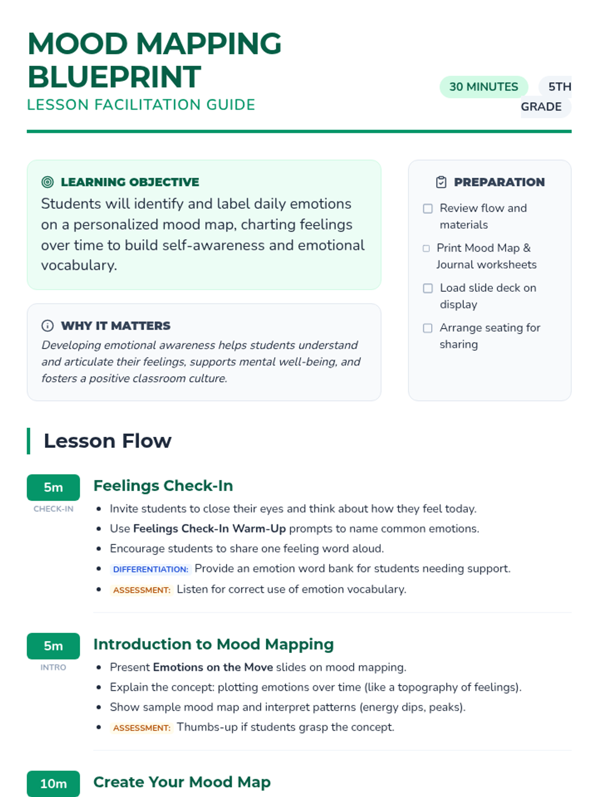 A 30-minute Tier 1 SEL lesson where 5th graders build emotional self-awareness by plotting their daily feelings on a personalized mood map. Students learn to identify intensity, recognize patterns, and expand their emotional vocabulary.