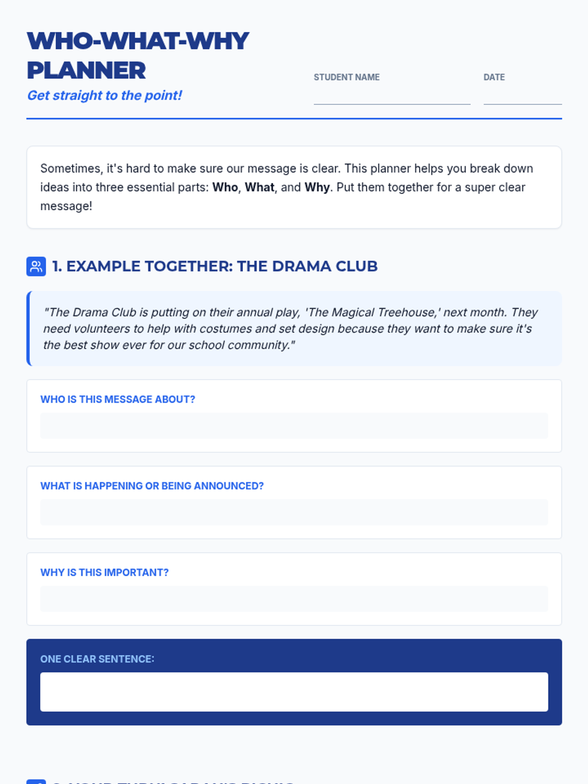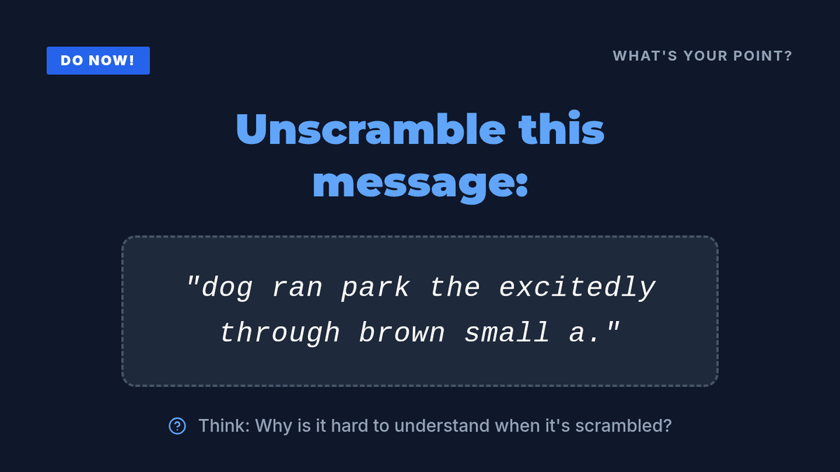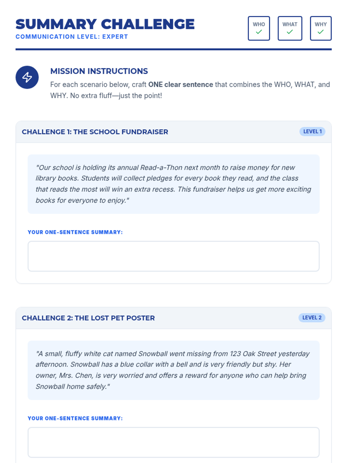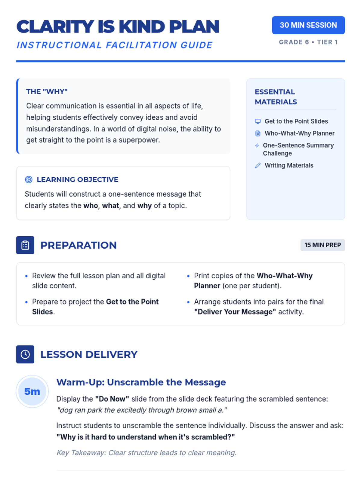 A 30-minute lesson for 6th graders on the 'Who-What-Why' method for crafting clear, concise messages. Students learn to identify and combine the subject, action, and purpose to avoid misunderstandings.
