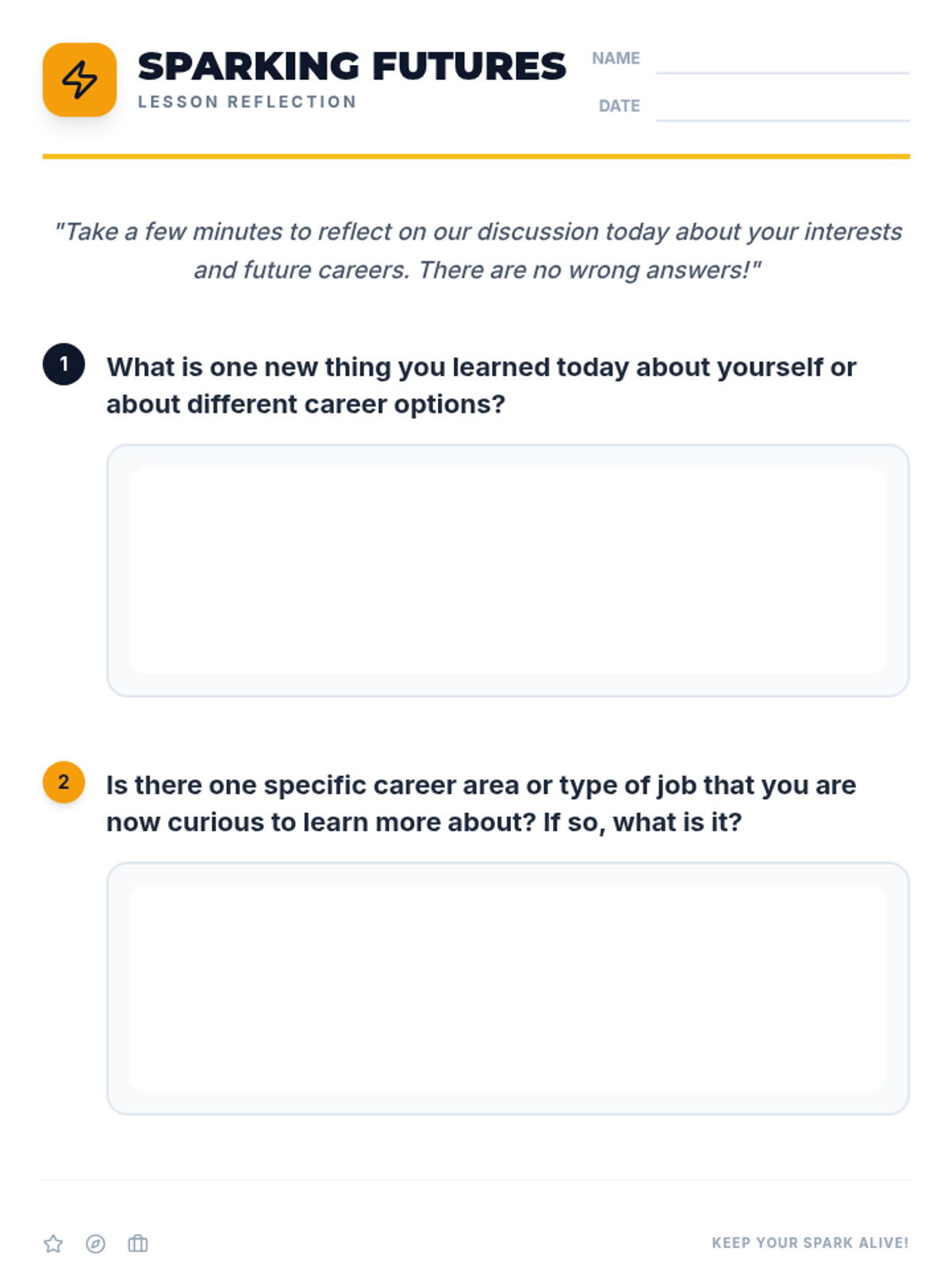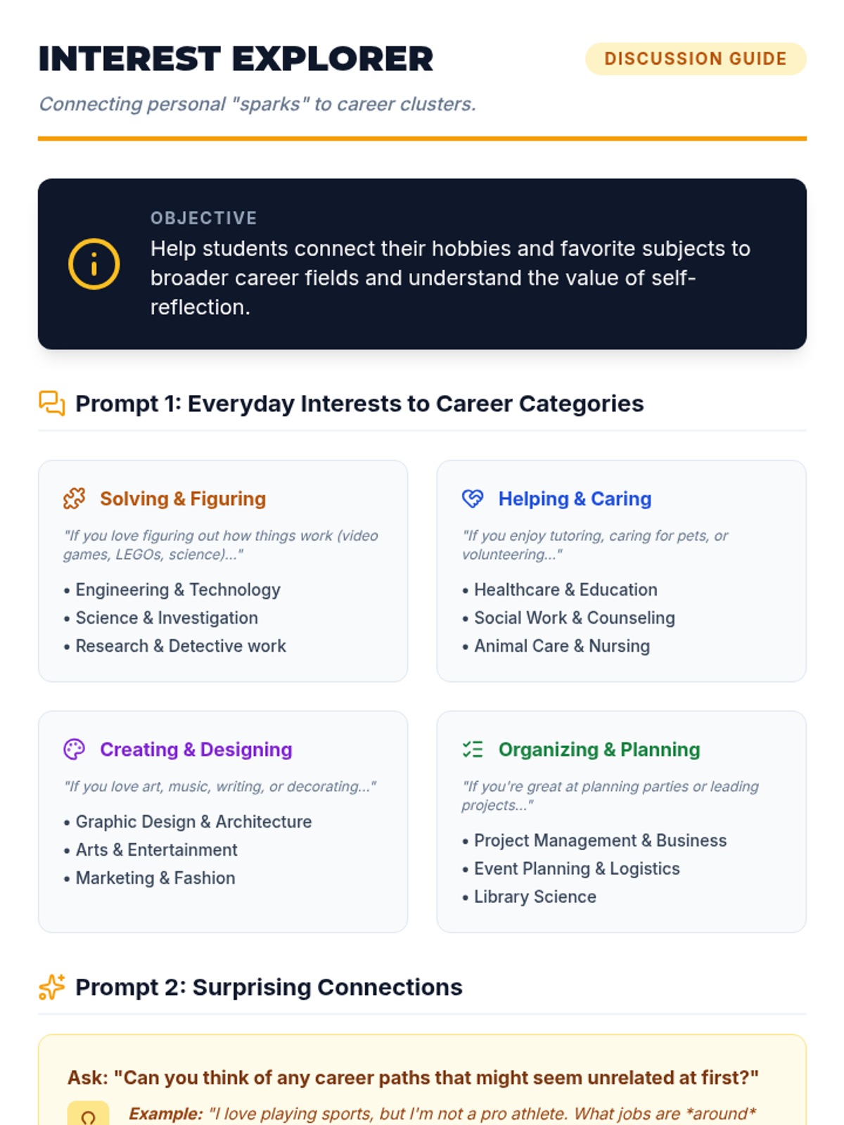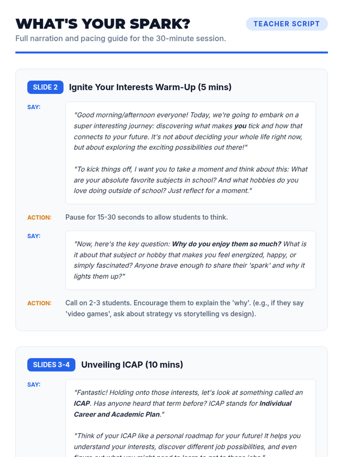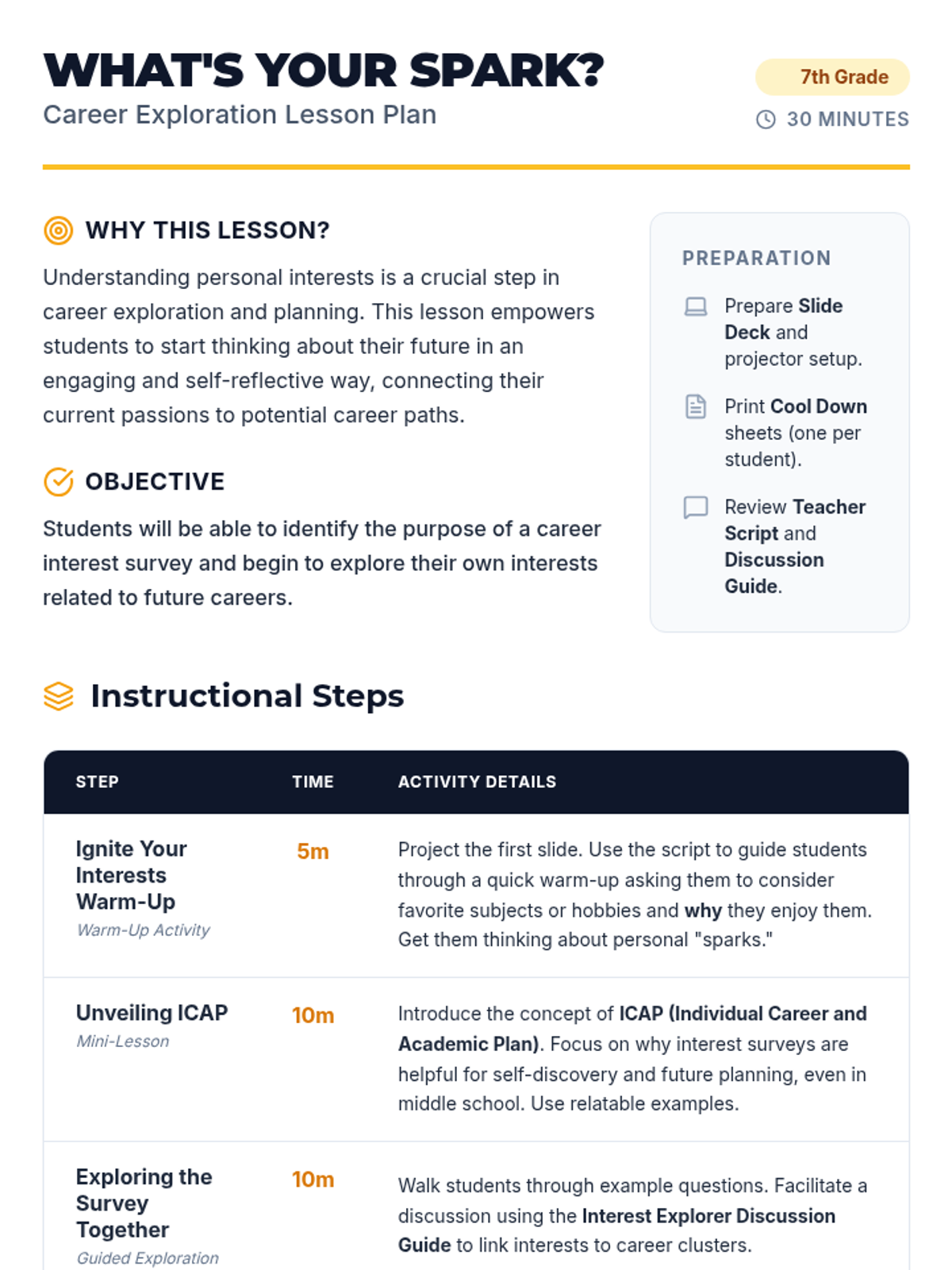 A 30-minute introductory lesson for 7th graders to explore their career interests through the ICAP (Individual Career and Academic Plan) framework, focusing on self-discovery and the 'spark' of personal passions.