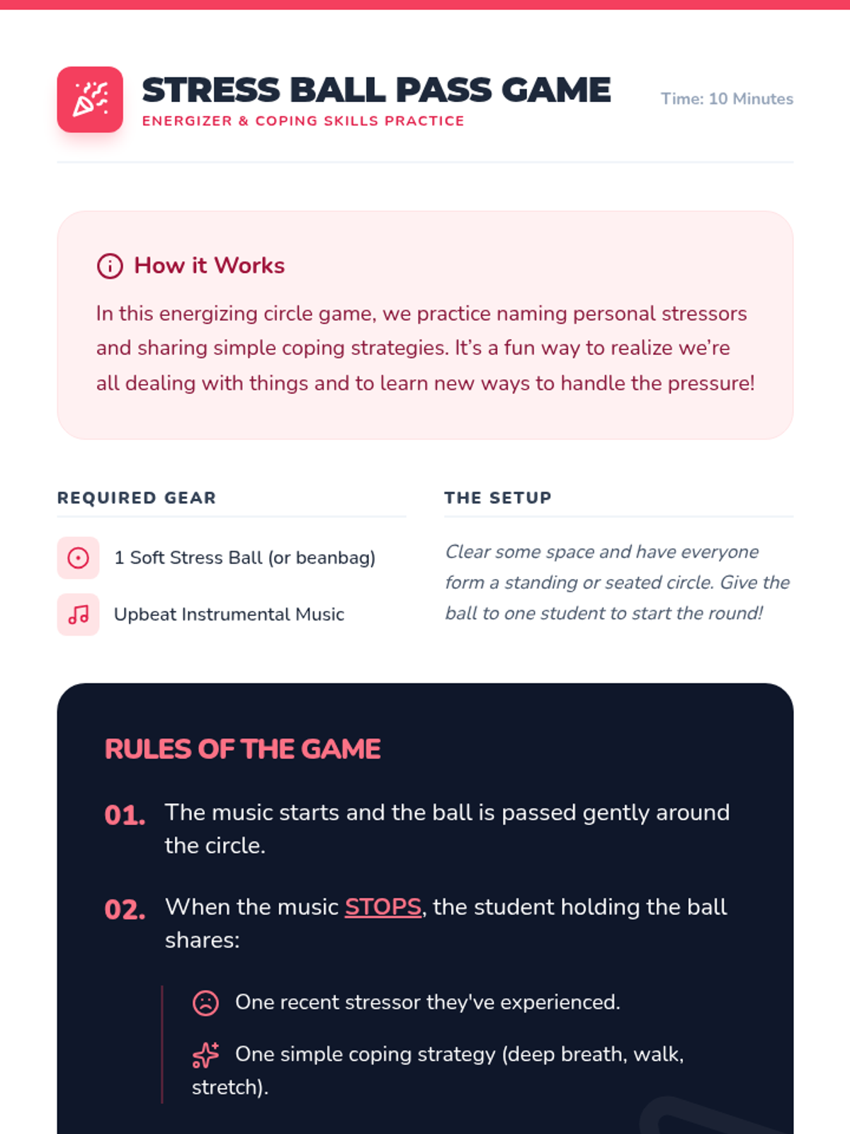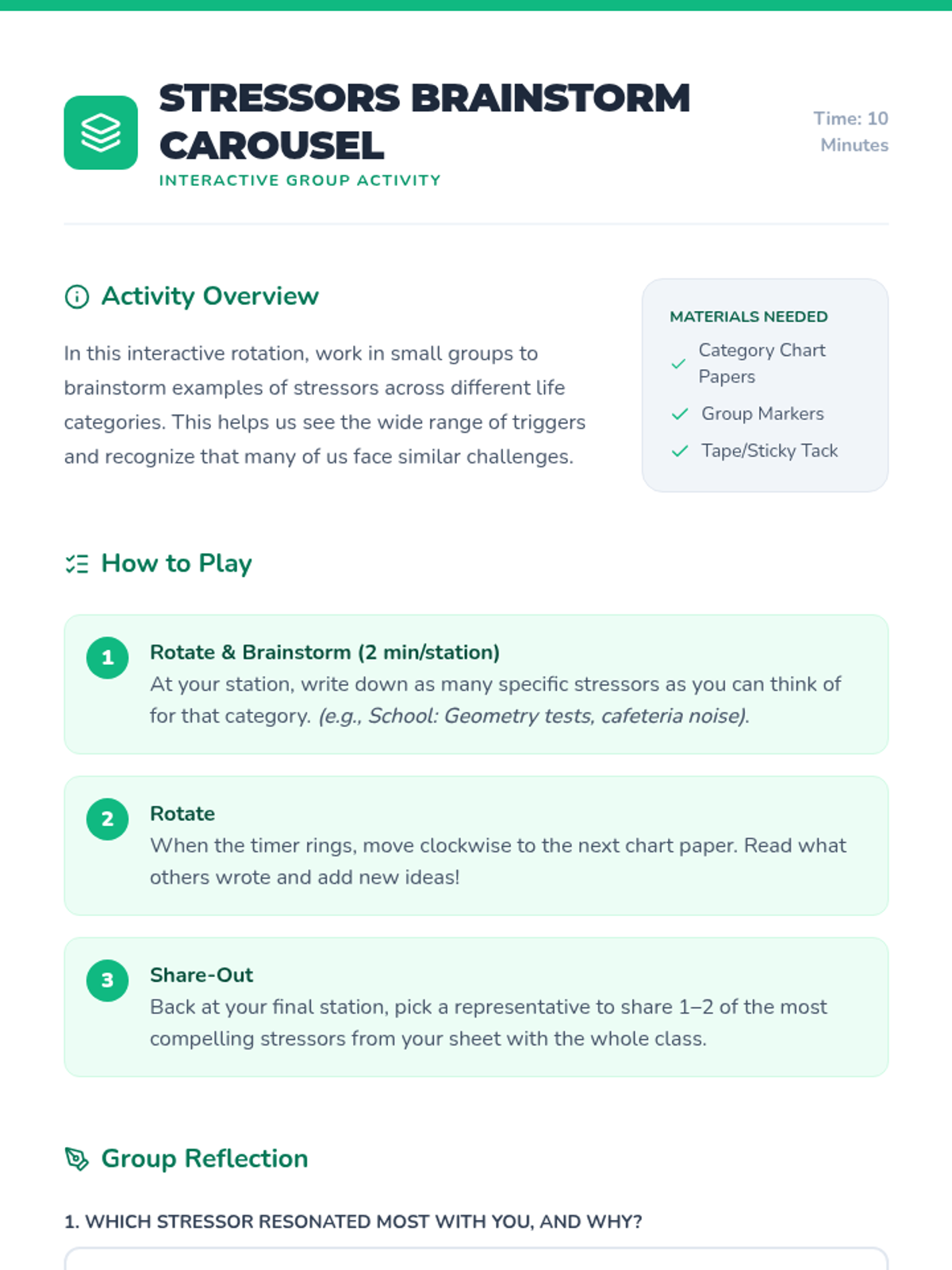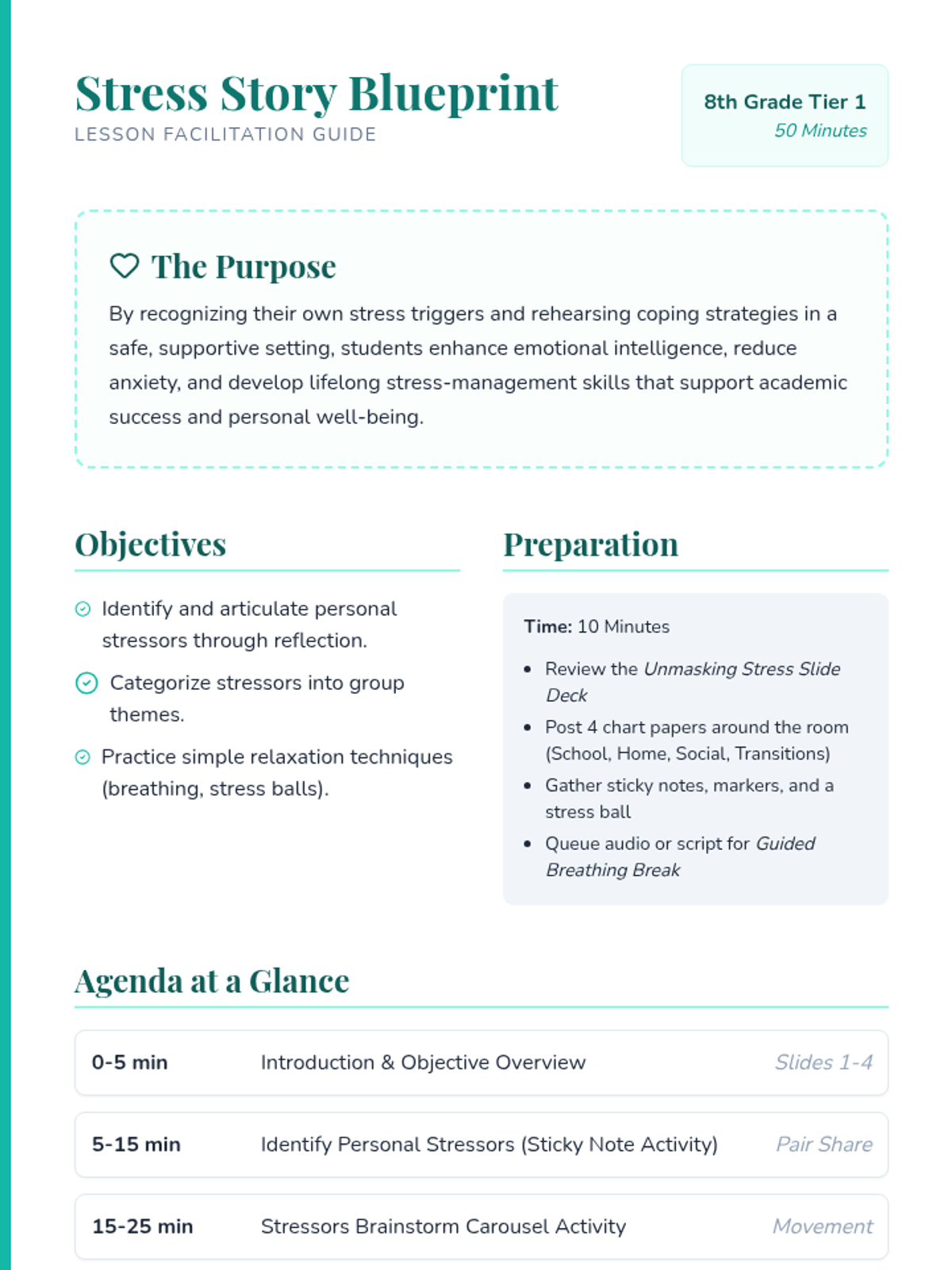 A 50-minute Tier 1 counseling lesson for 8th graders to identify stressors and practice relaxation techniques. Students explore personal triggers through interactive activities and a guided breathing session.