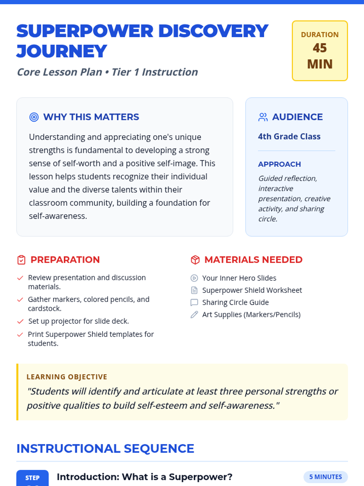 A 45-minute lesson for 4th graders to identify and celebrate their unique personal strengths and positive qualities through a superhero-themed creative activity.