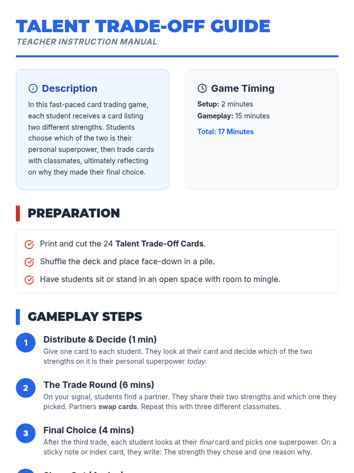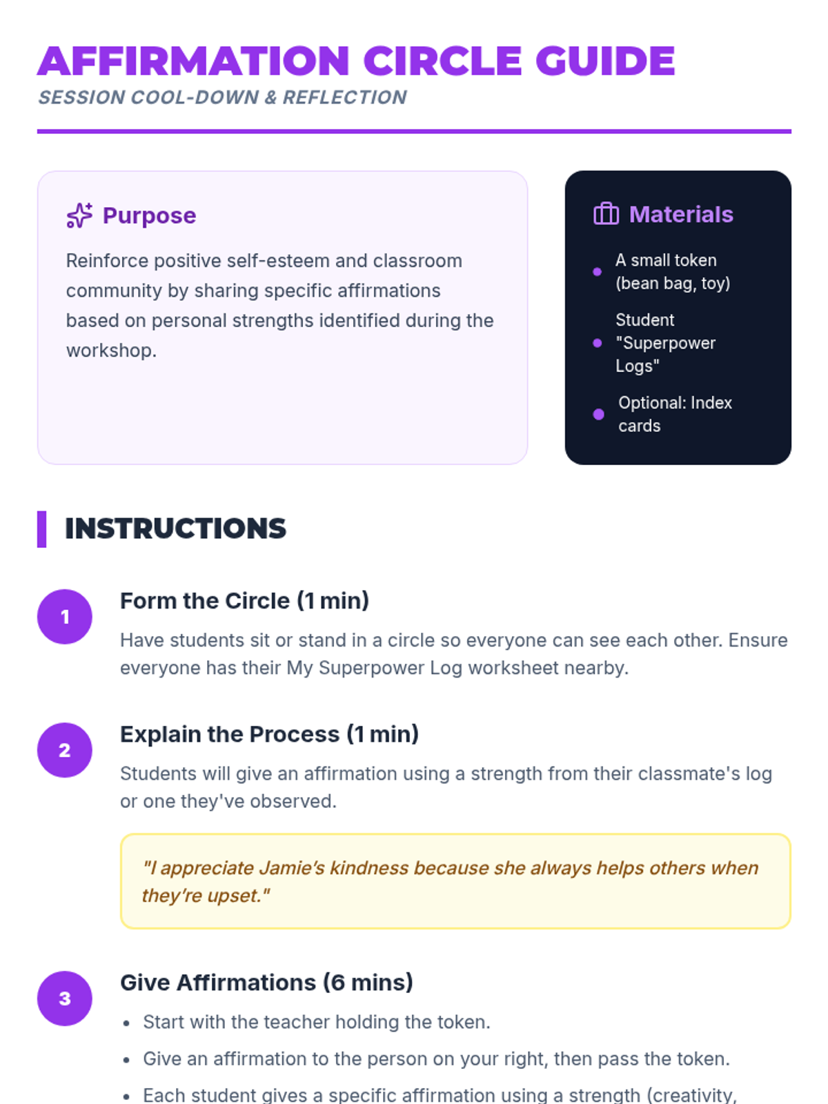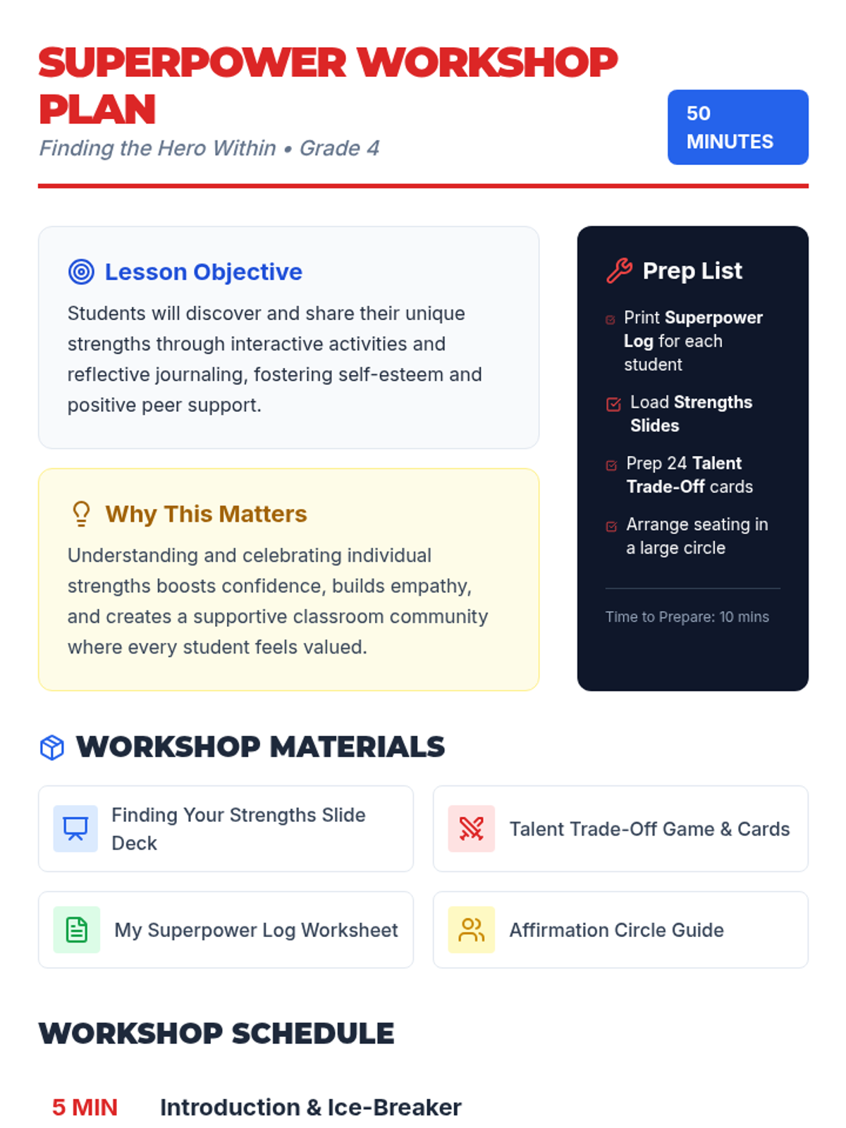 A 50-minute Tier 1 session for 4th graders to identify and celebrate personal strengths through interactive games and reflection, building self-esteem and community.