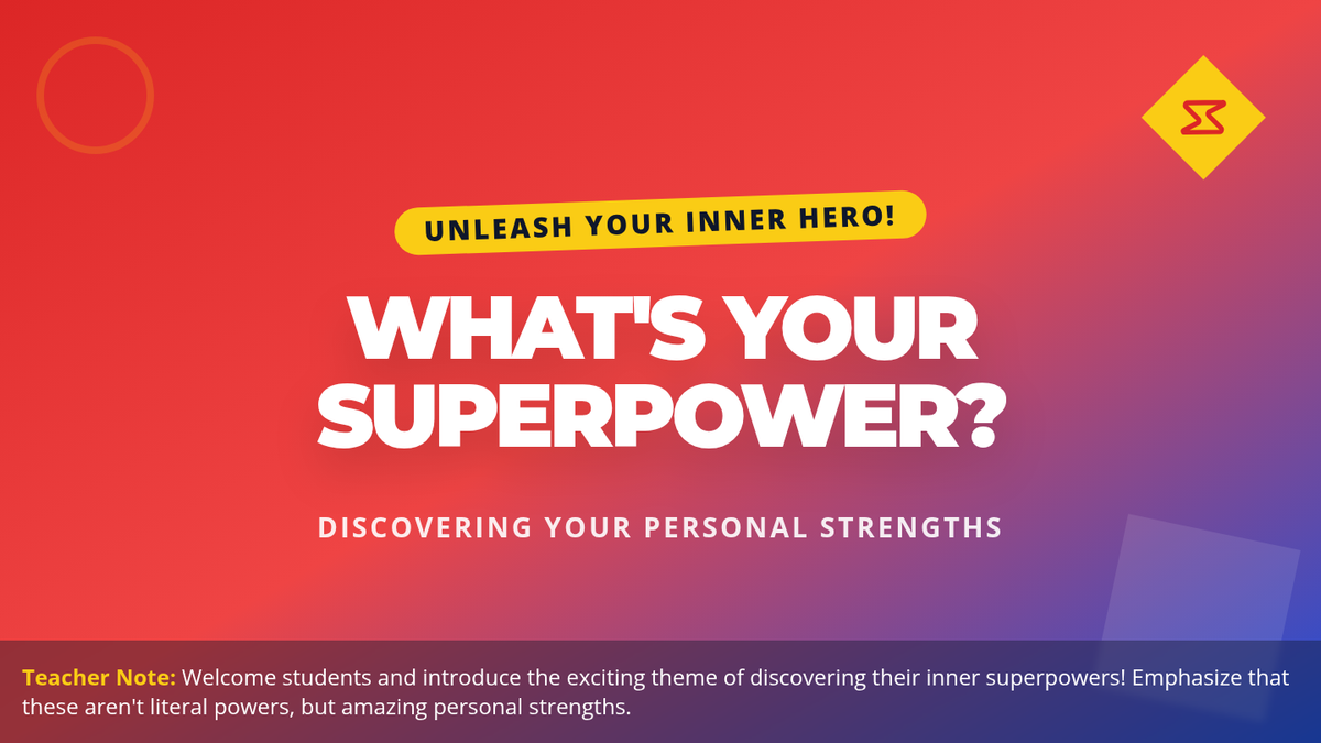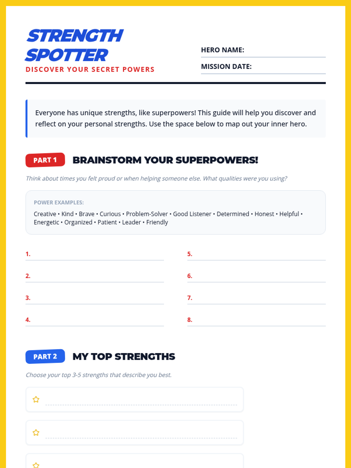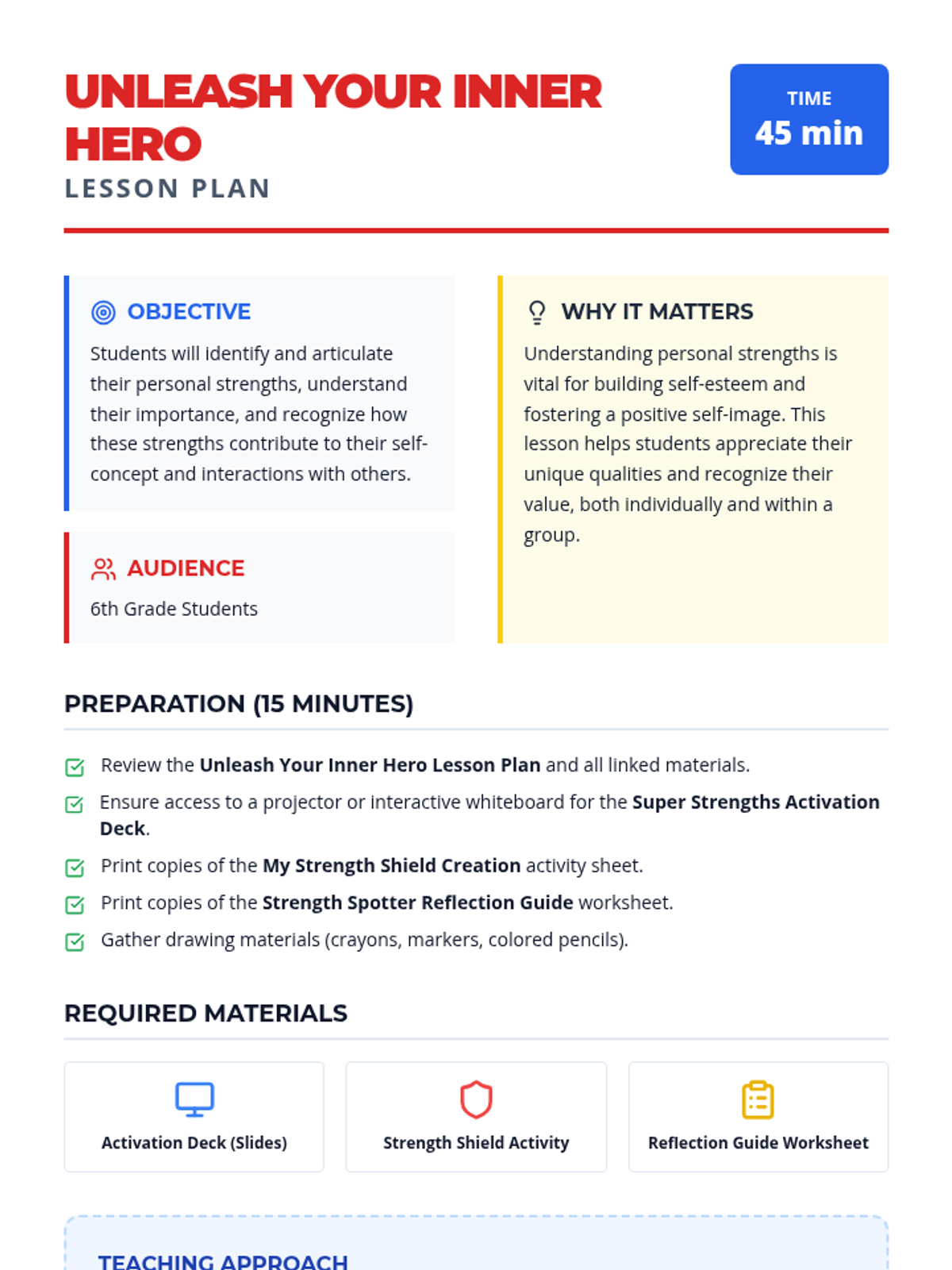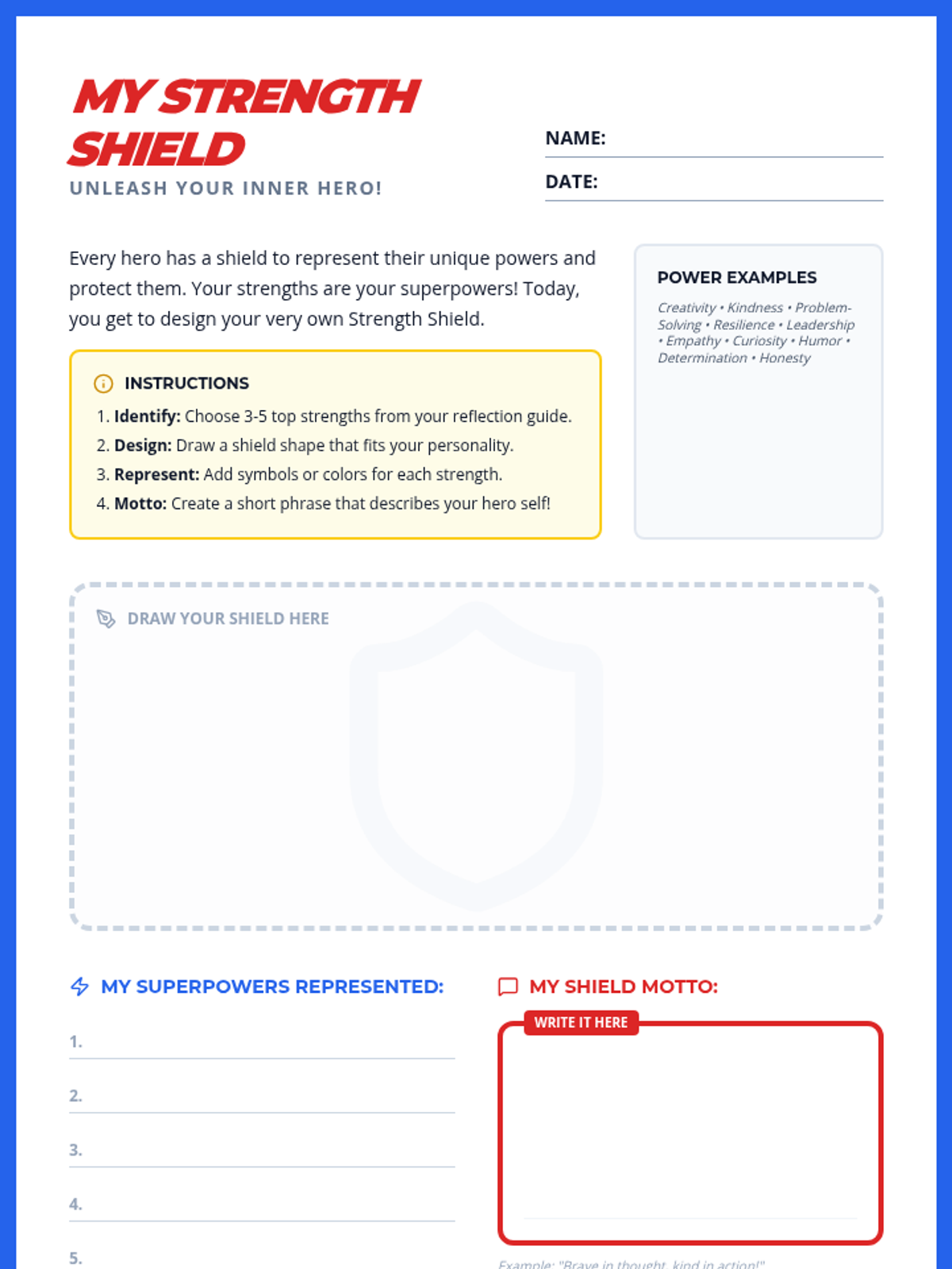 A 45-minute lesson for 6th-grade students to discover and articulate their personal strengths using a 'superhero' theme. Students brainstorm their strengths, design a personal 'Strength Shield,' and reflect on how these qualities contribute to their success and relationships.