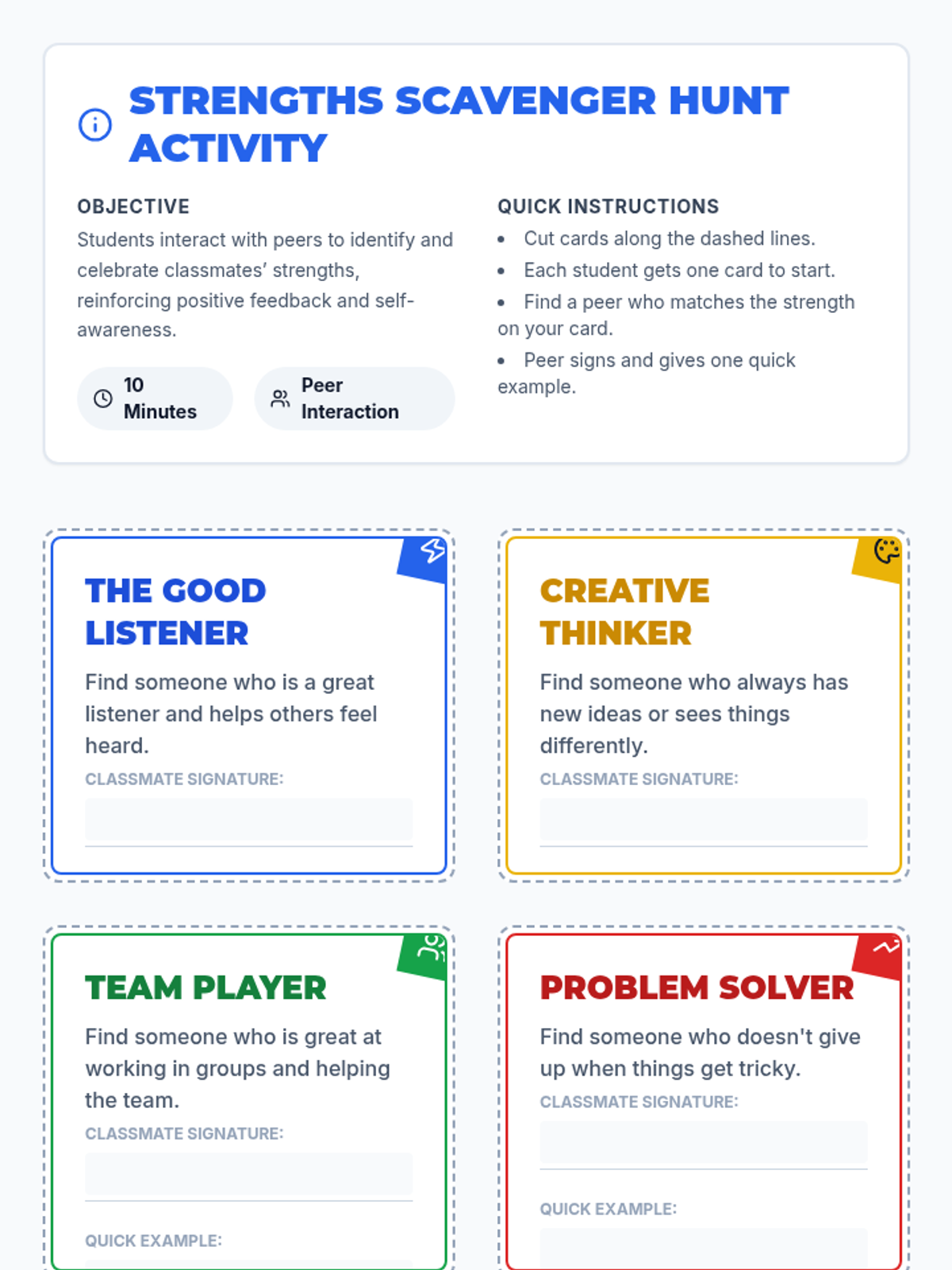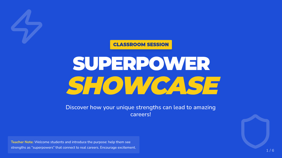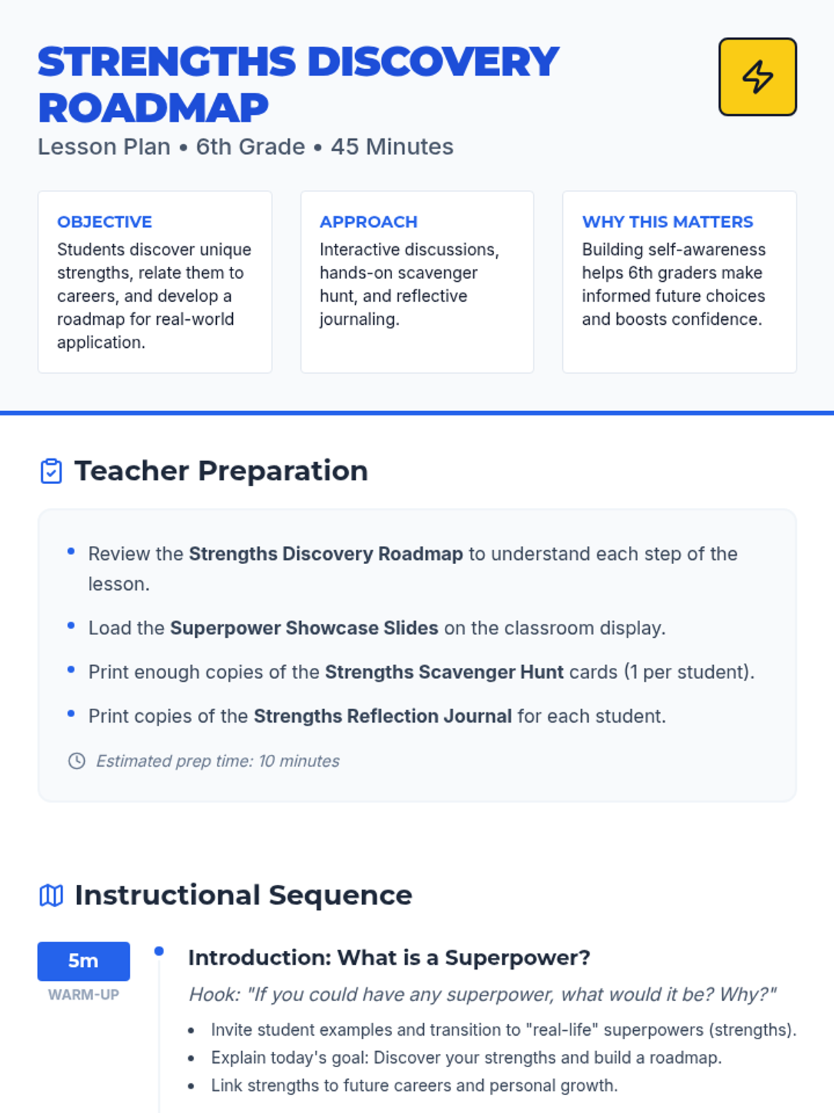 An interactive 45-minute lesson for 6th graders to discover their unique strengths, connect them to future careers, and create a personal growth roadmap.