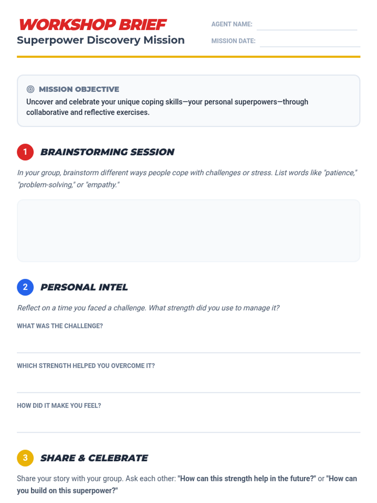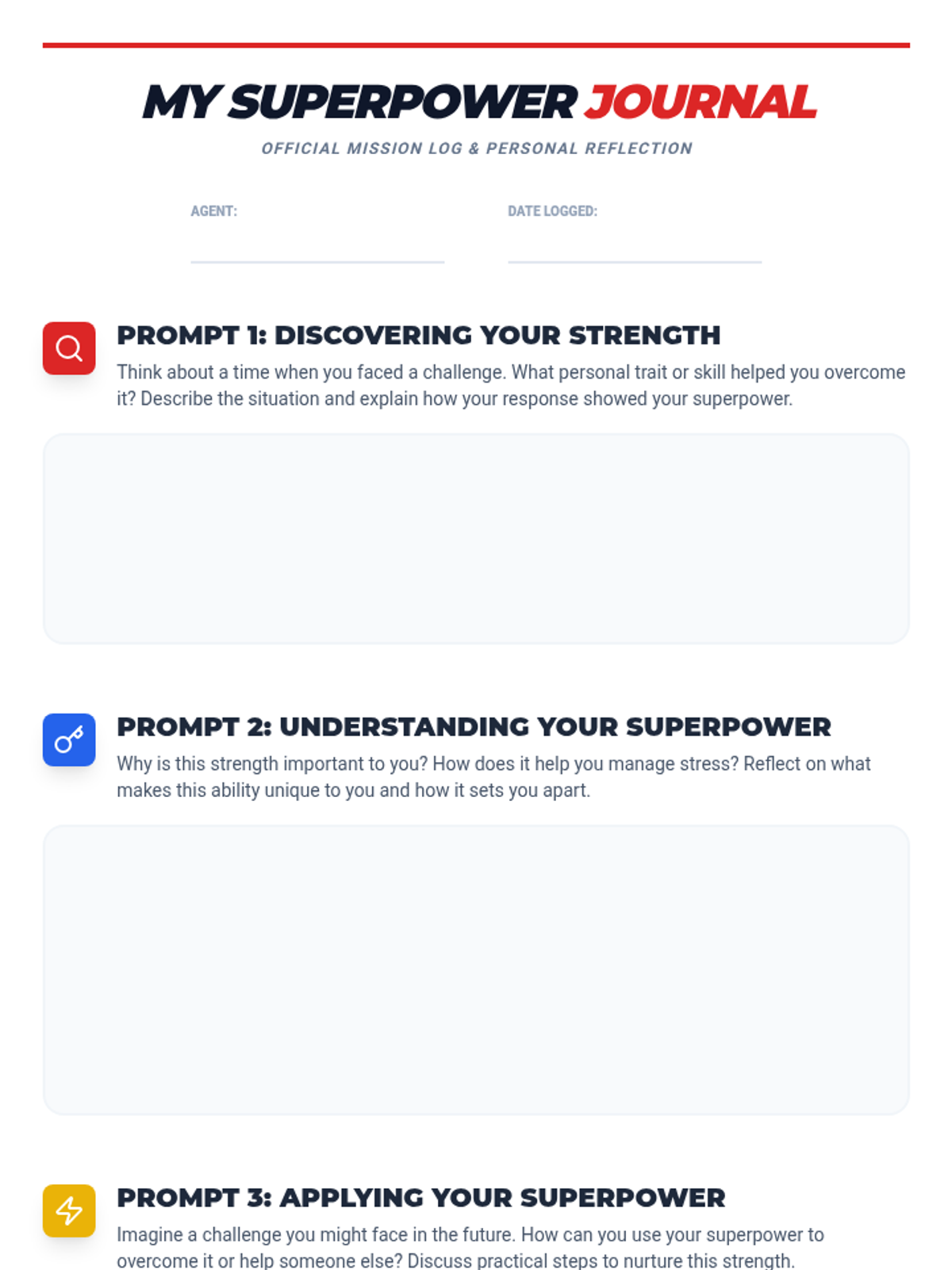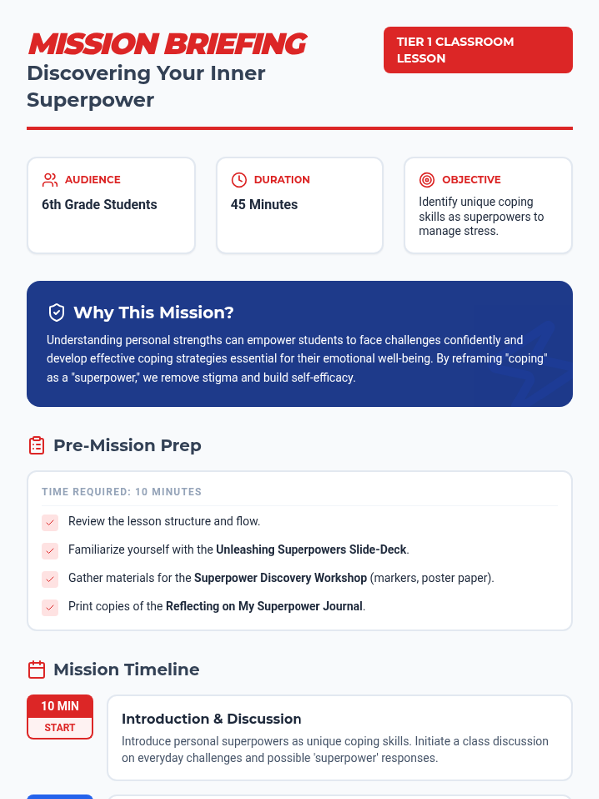A dynamic 45-minute lesson where 6th-grade students reframe their coping skills as unique superpowers. Through interactive workshops and personal reflection, students identify their inner strengths and learn how to deploy them against everyday stress and challenges.