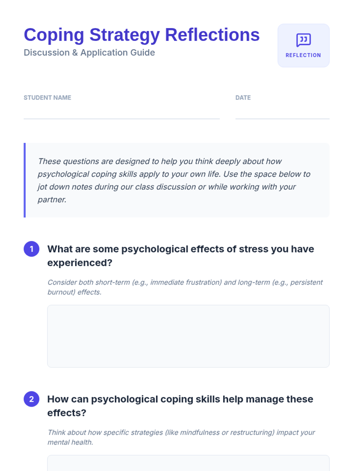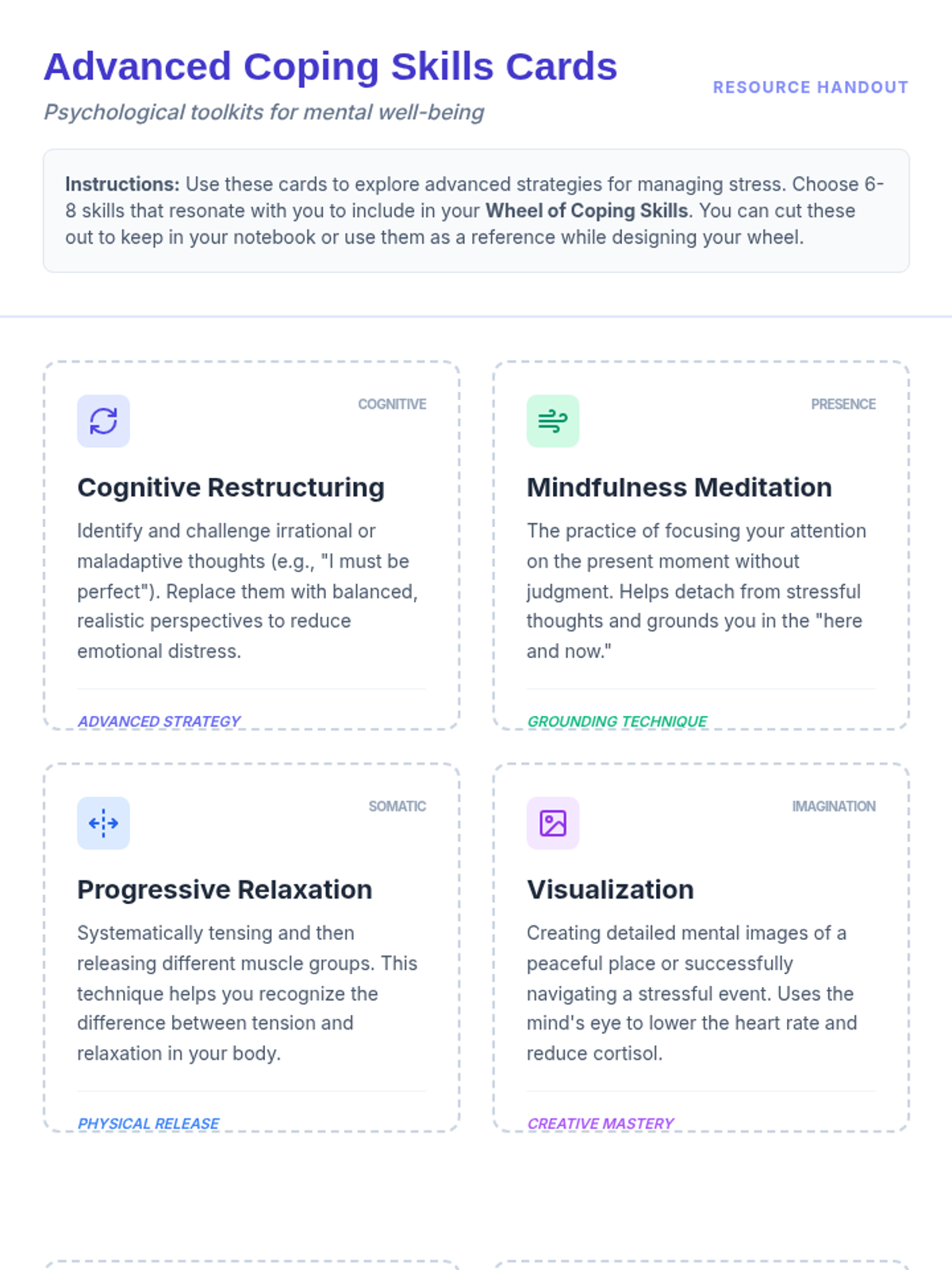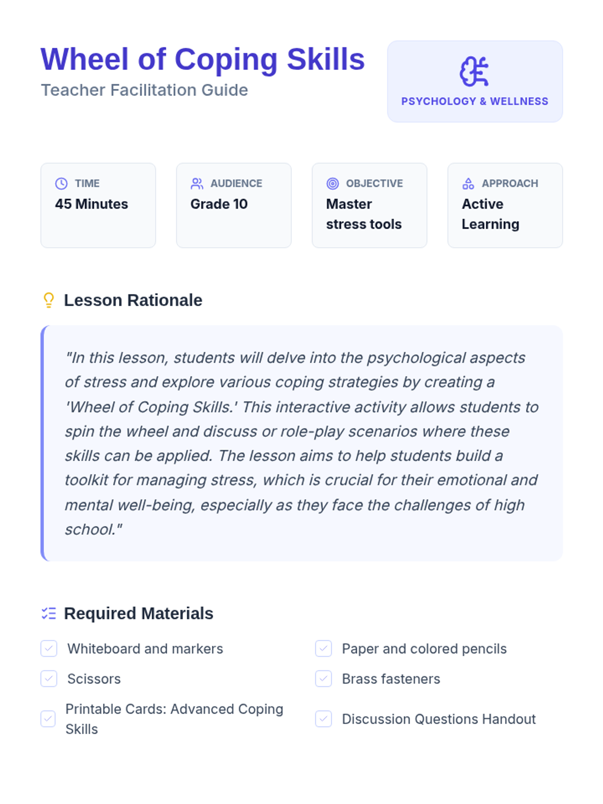 In this lesson, Grade 10 students explore the psychological impact of stress and build a personalized 'Wheel of Coping Skills'. Through hands-on creation and role-playing, they develop a toolkit of advanced strategies like cognitive restructuring and mindfulness to support their mental well-being.