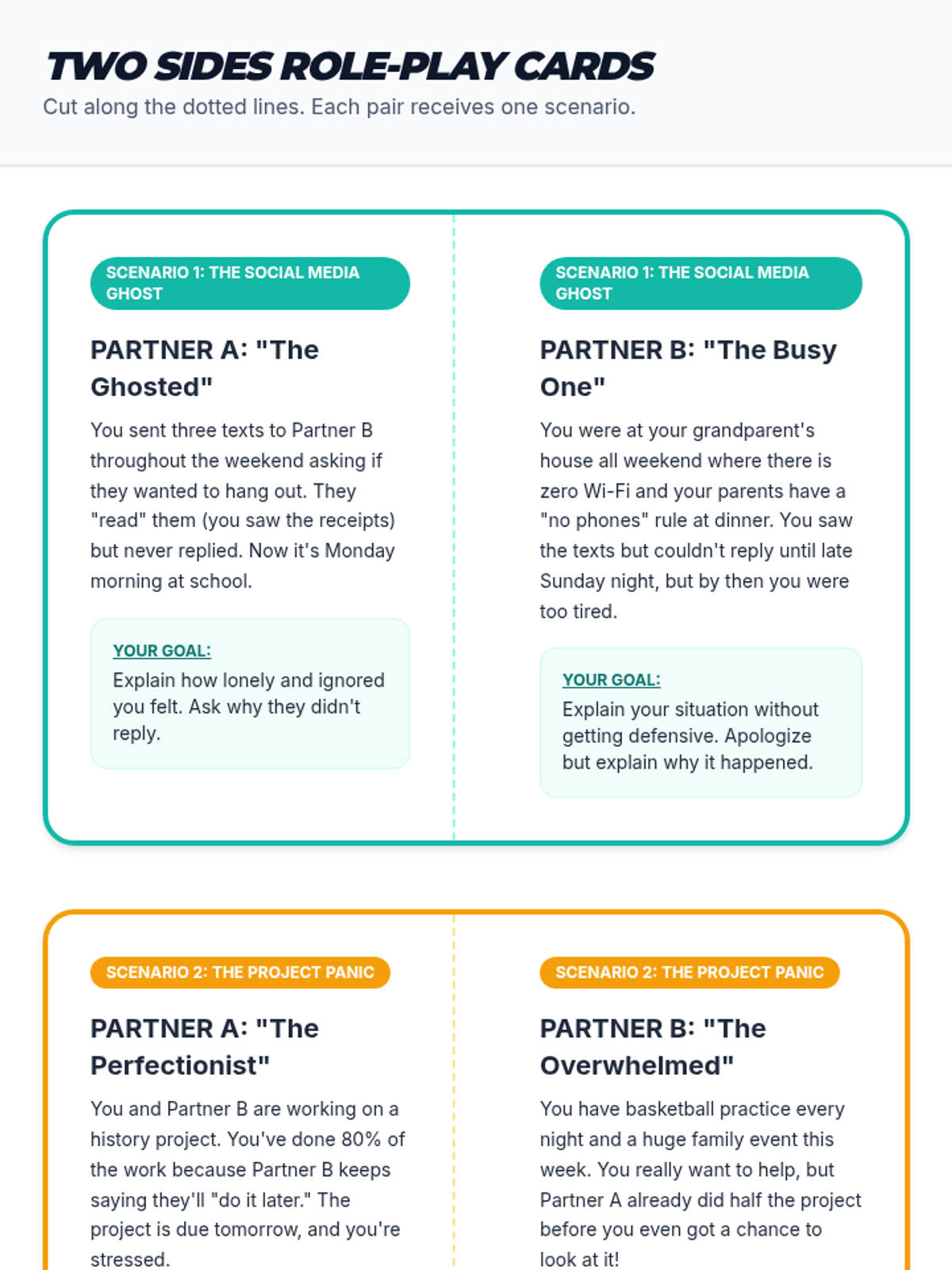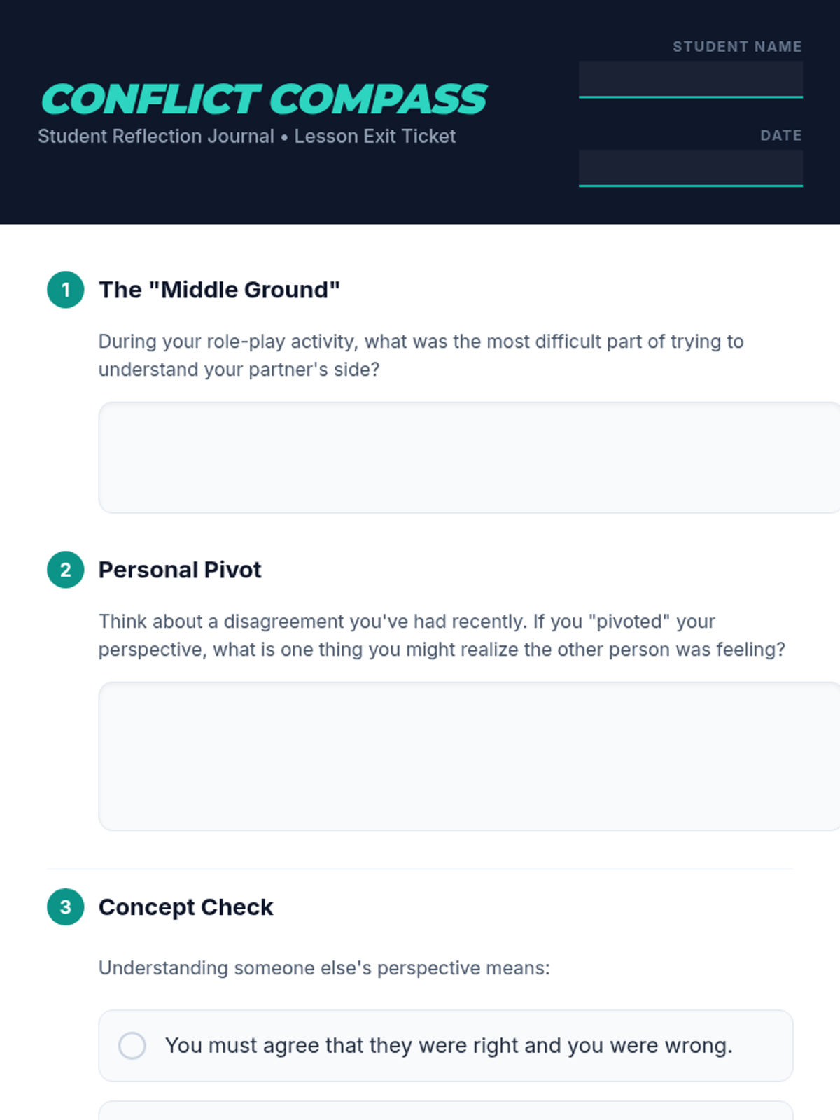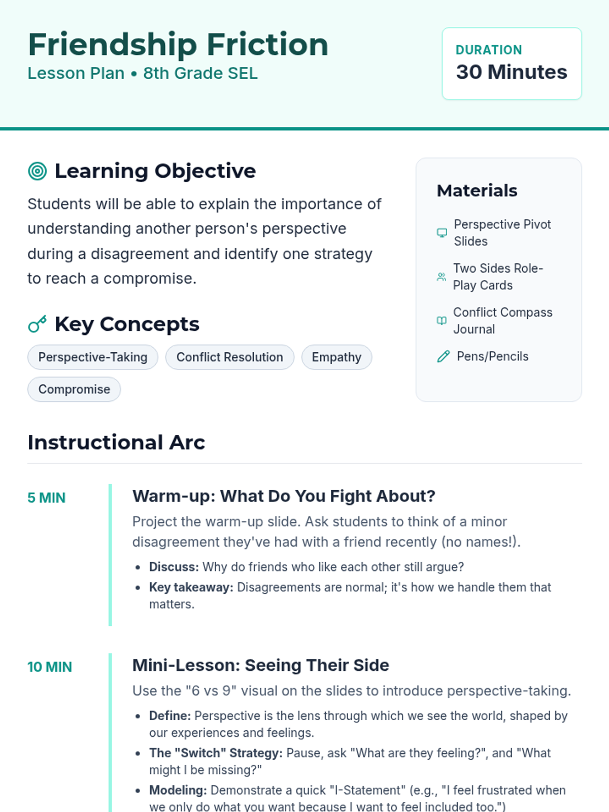 A 30-minute social-emotional learning lesson for 8th graders focused on conflict resolution through perspective-taking. Students will explore why friends disagree and practice seeing situations from multiple viewpoints to reach compromises.