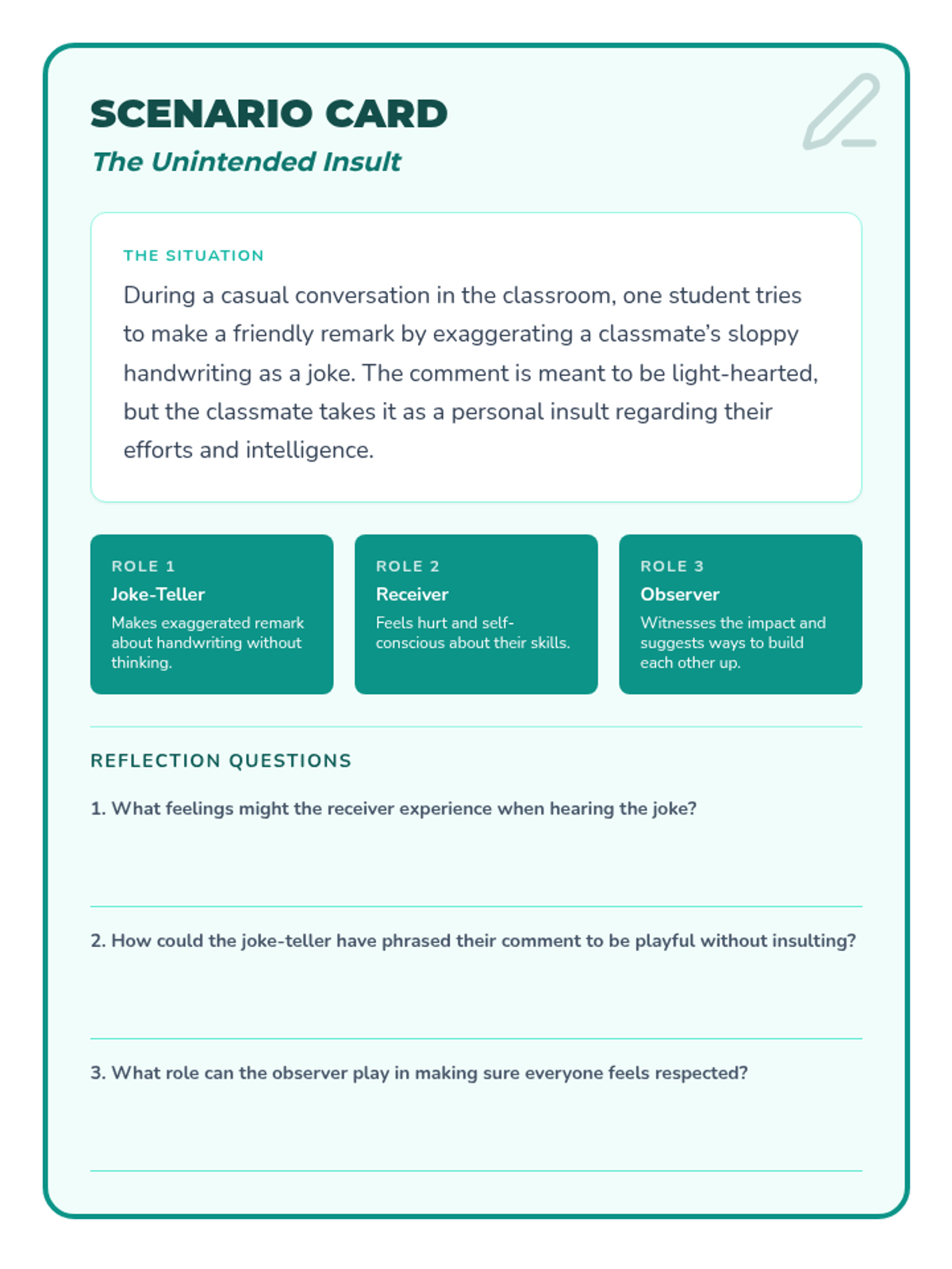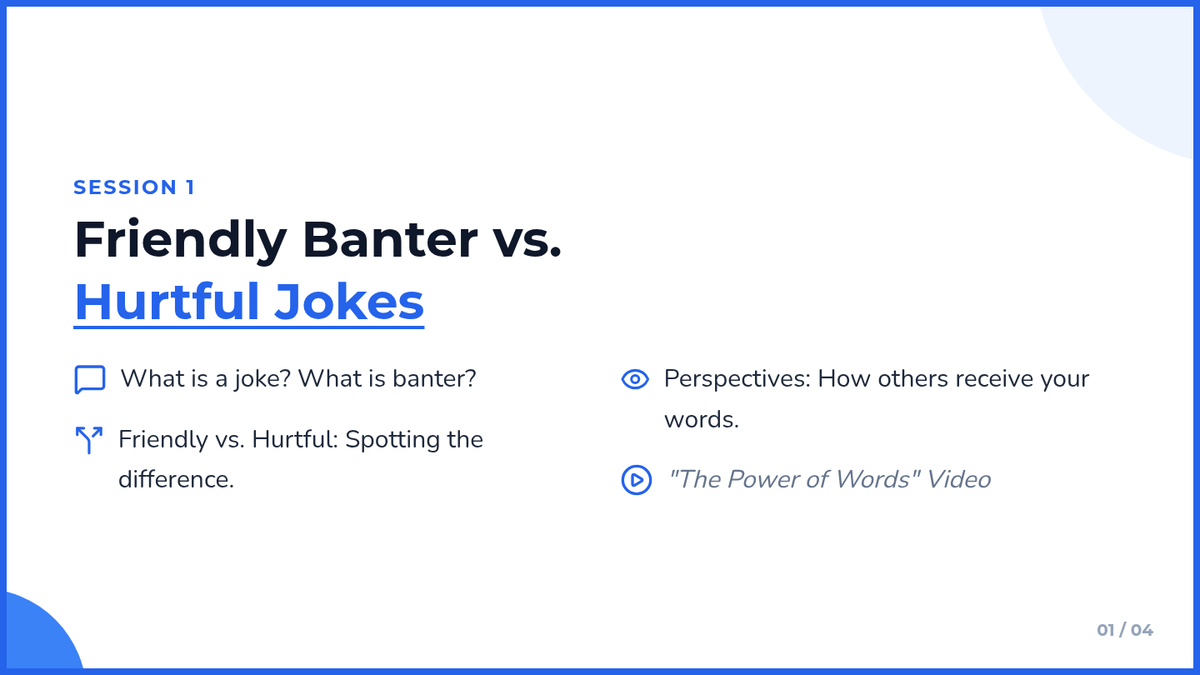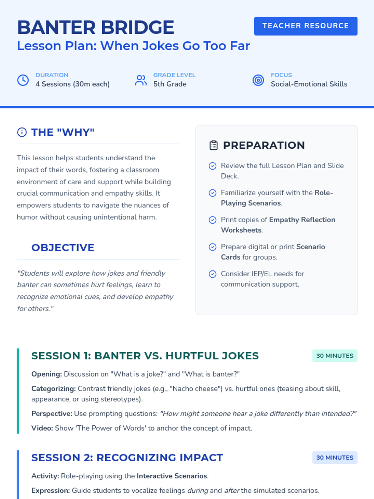 This lesson explores how friendly banter and jokes can unintentionally hurt friends' feelings, helping students develop empathy and recognize emotional cues.