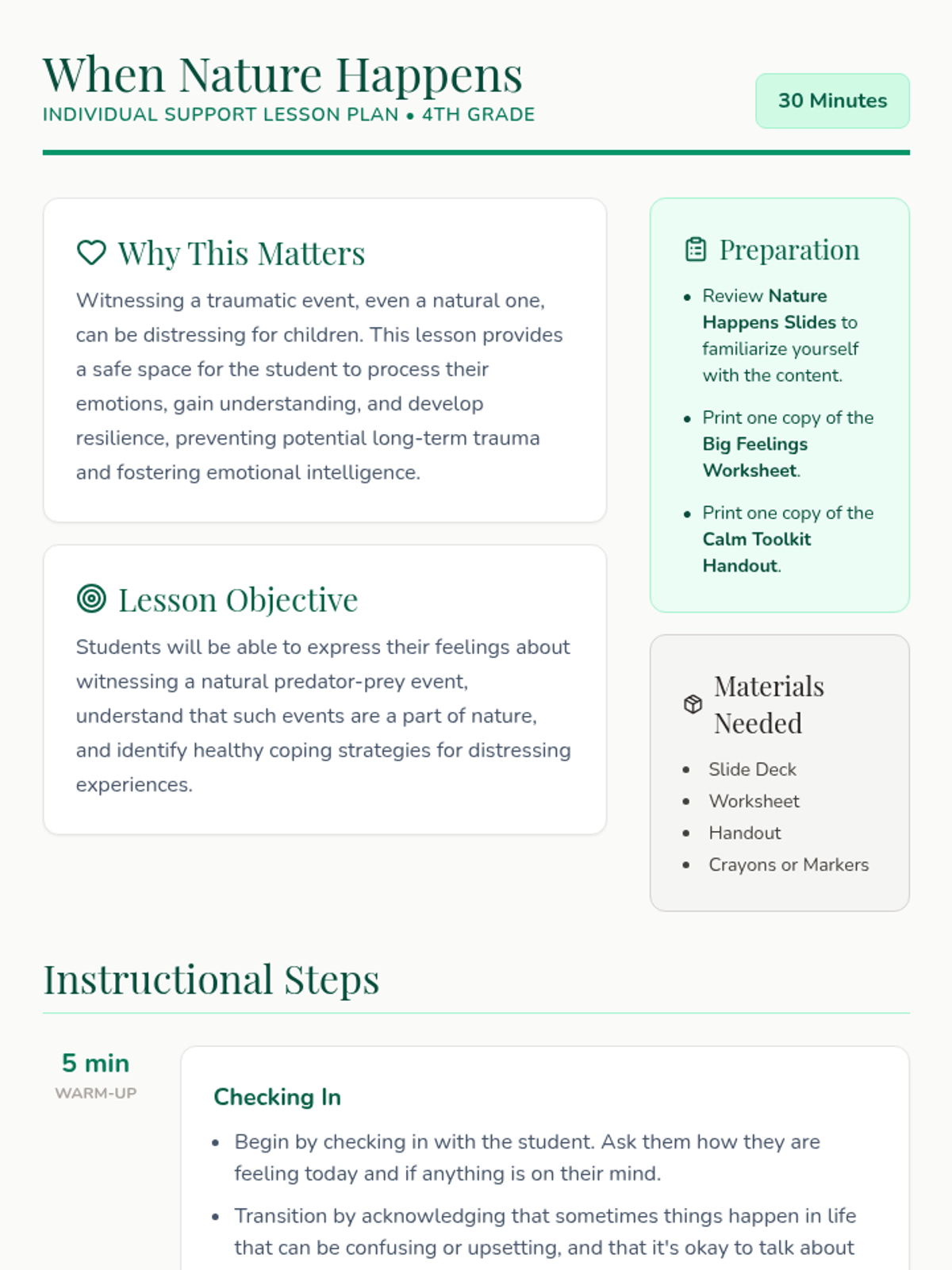 A Tier 3 individual counseling lesson designed for a 4th-grade student who has witnessed a traumatic predator-prey event. The lesson focuses on processing emotions, normalizing natural animal instincts, and developing healthy coping strategies.