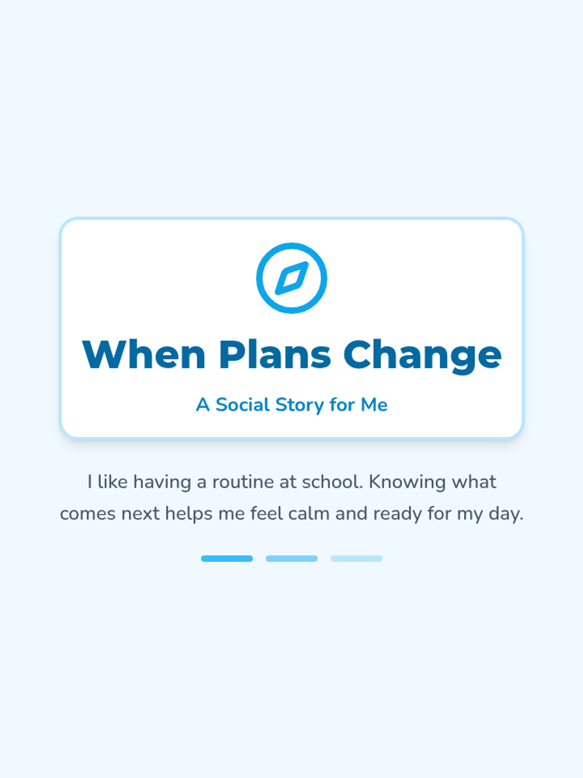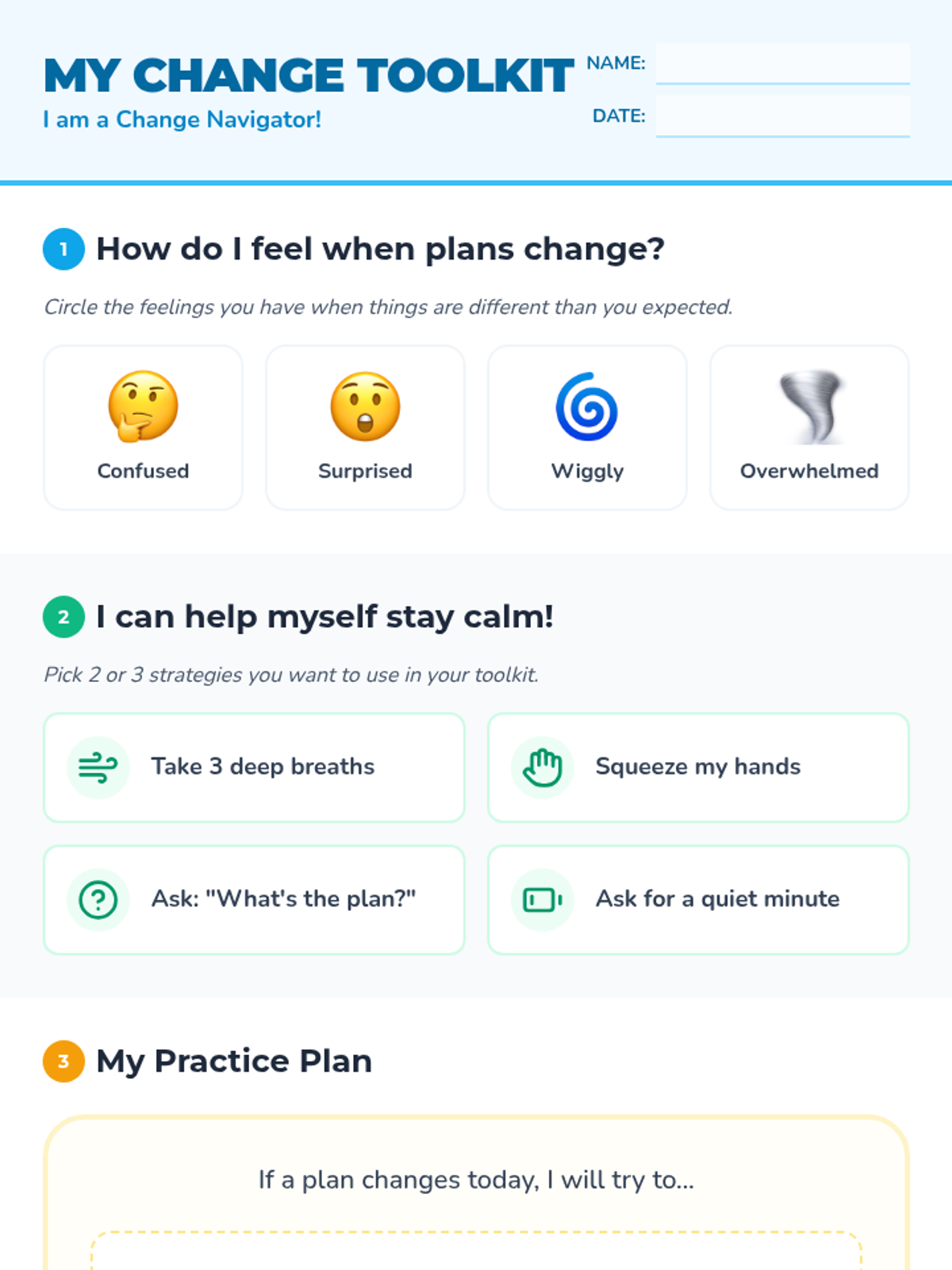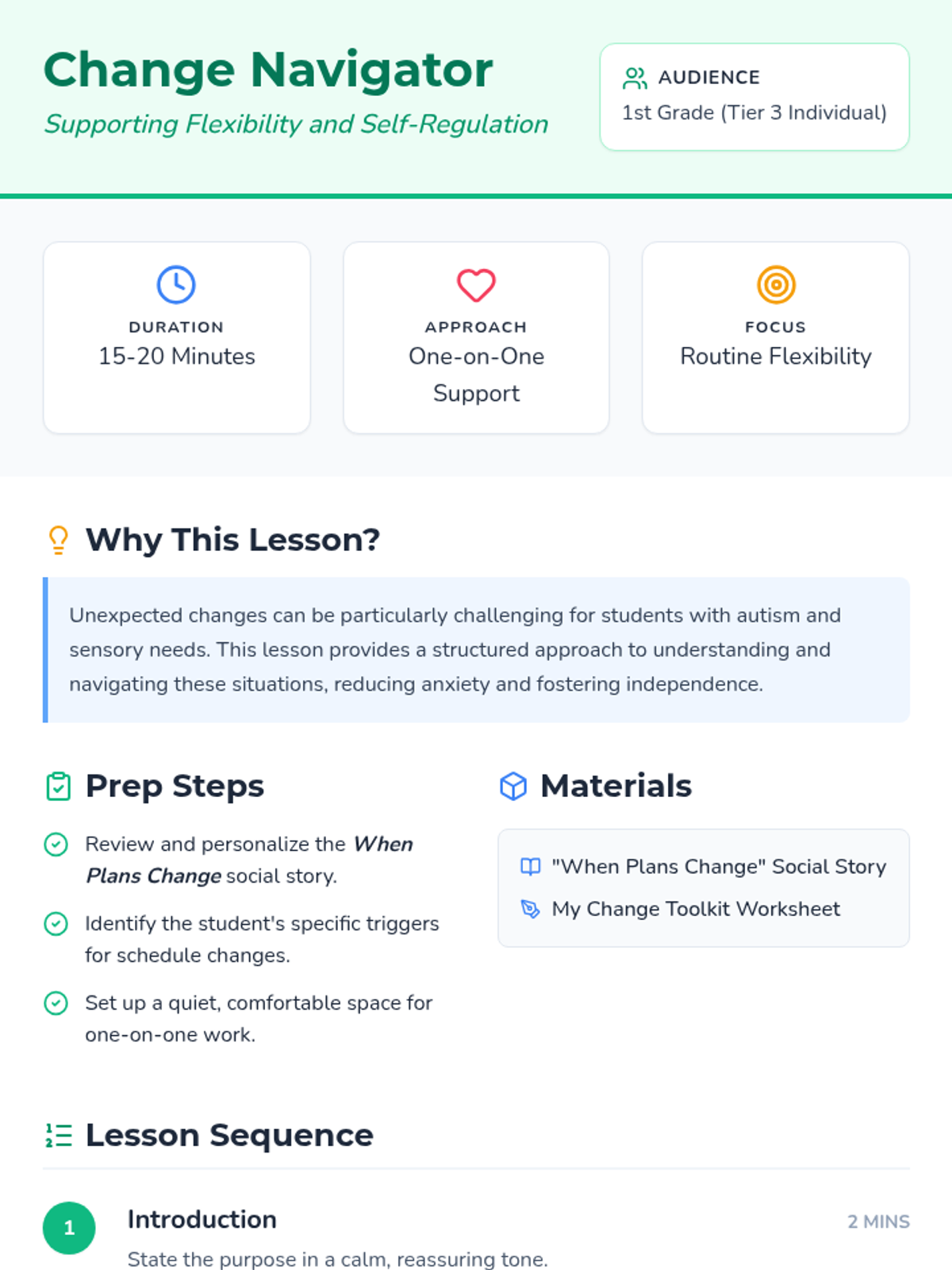 A personalized one-on-one lesson designed to help a 1st-grade student navigate unexpected changes in their routine using a social story and coping strategies.