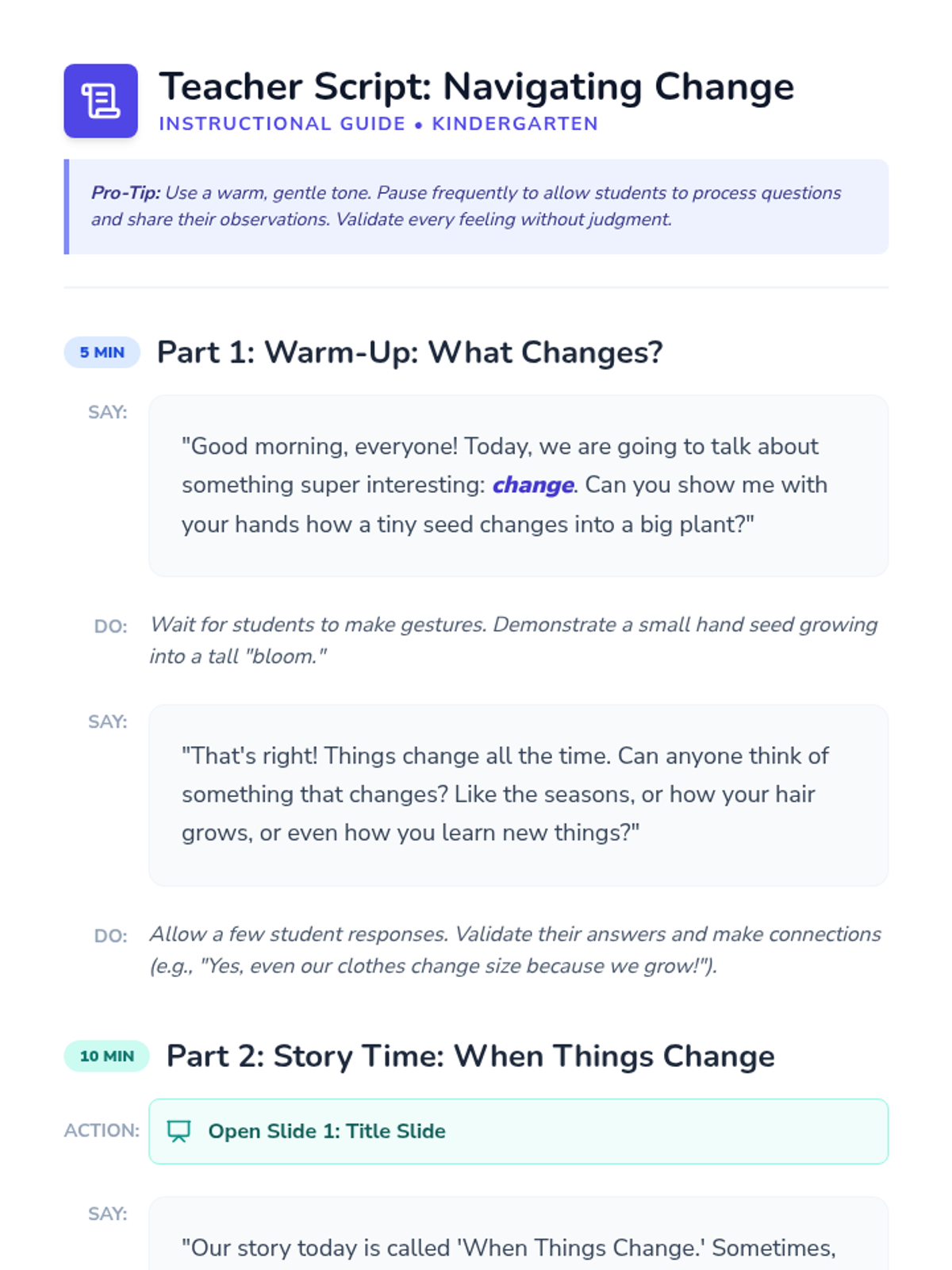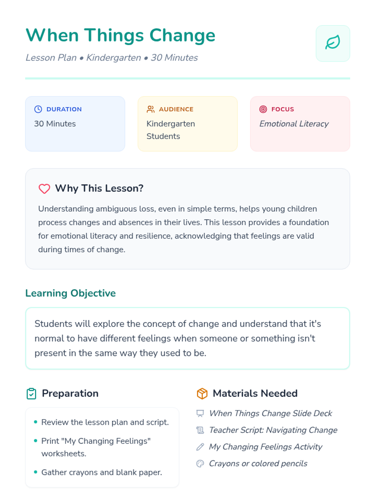 A gentle introduction for Kindergarten students to the concept of change and ambiguous loss, helping them identify and validate feelings when things or people aren't present in the same way.