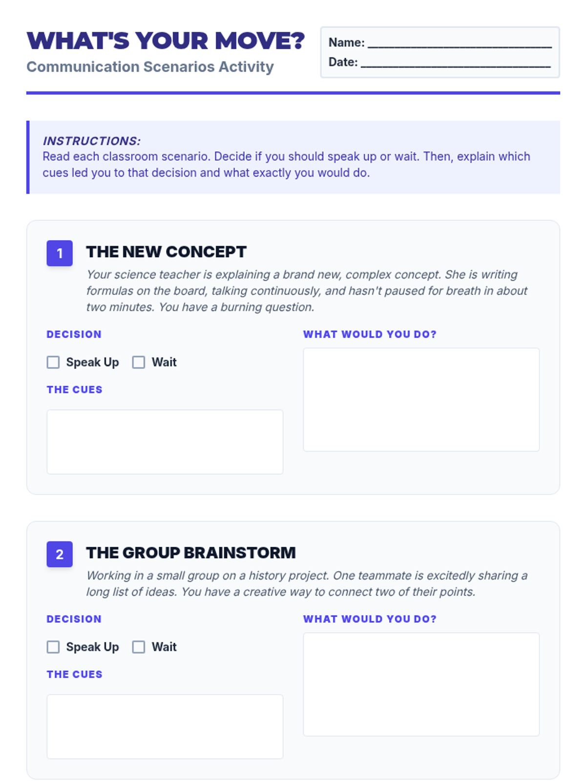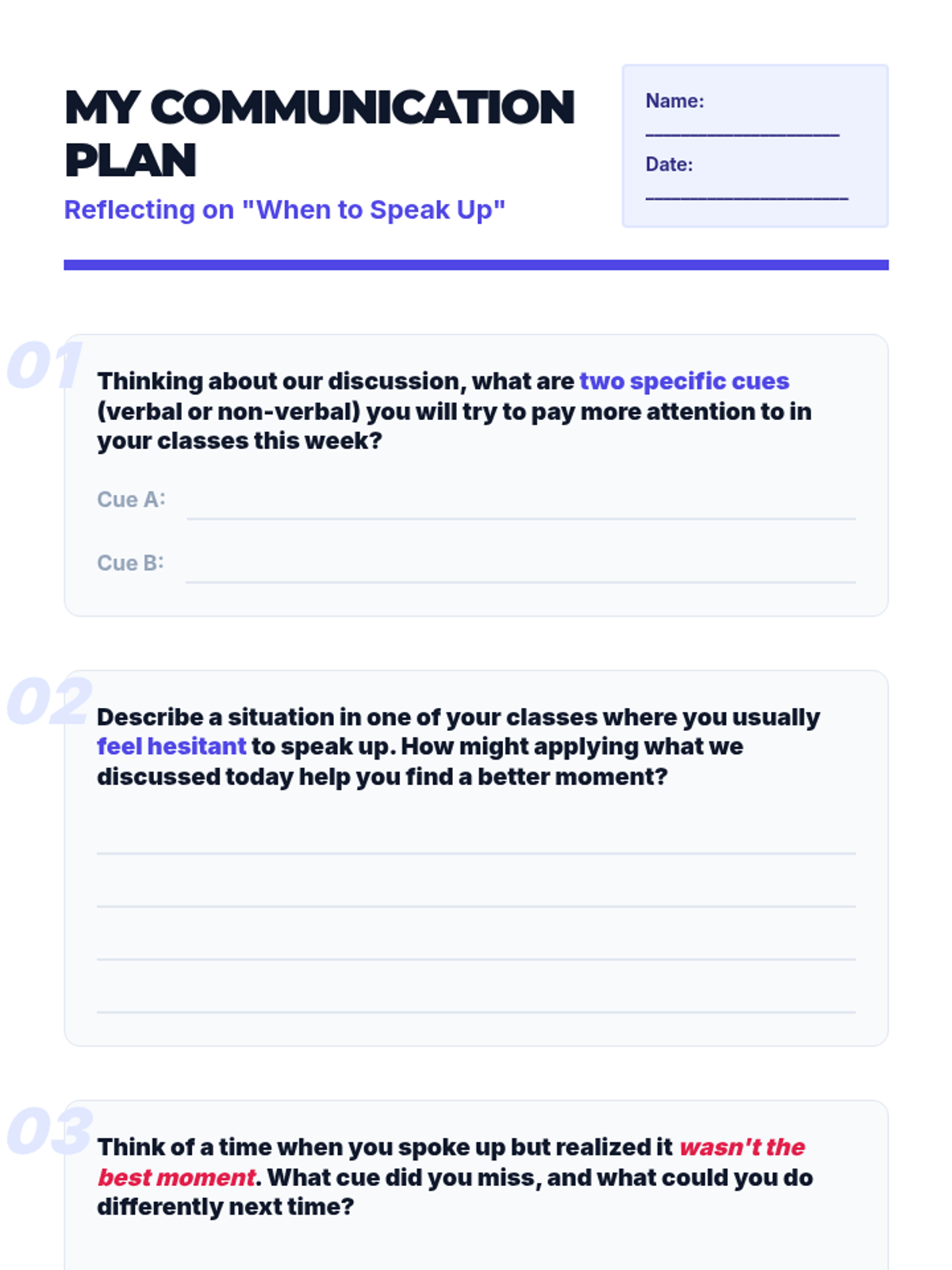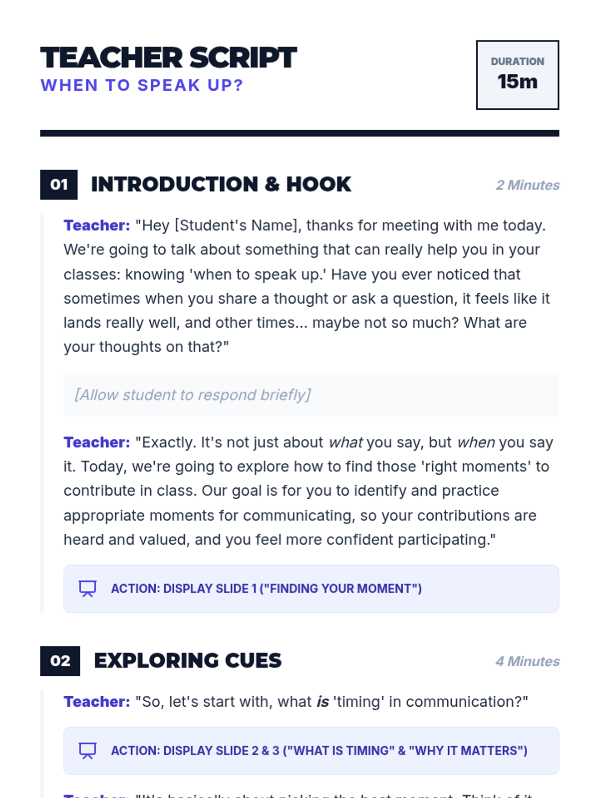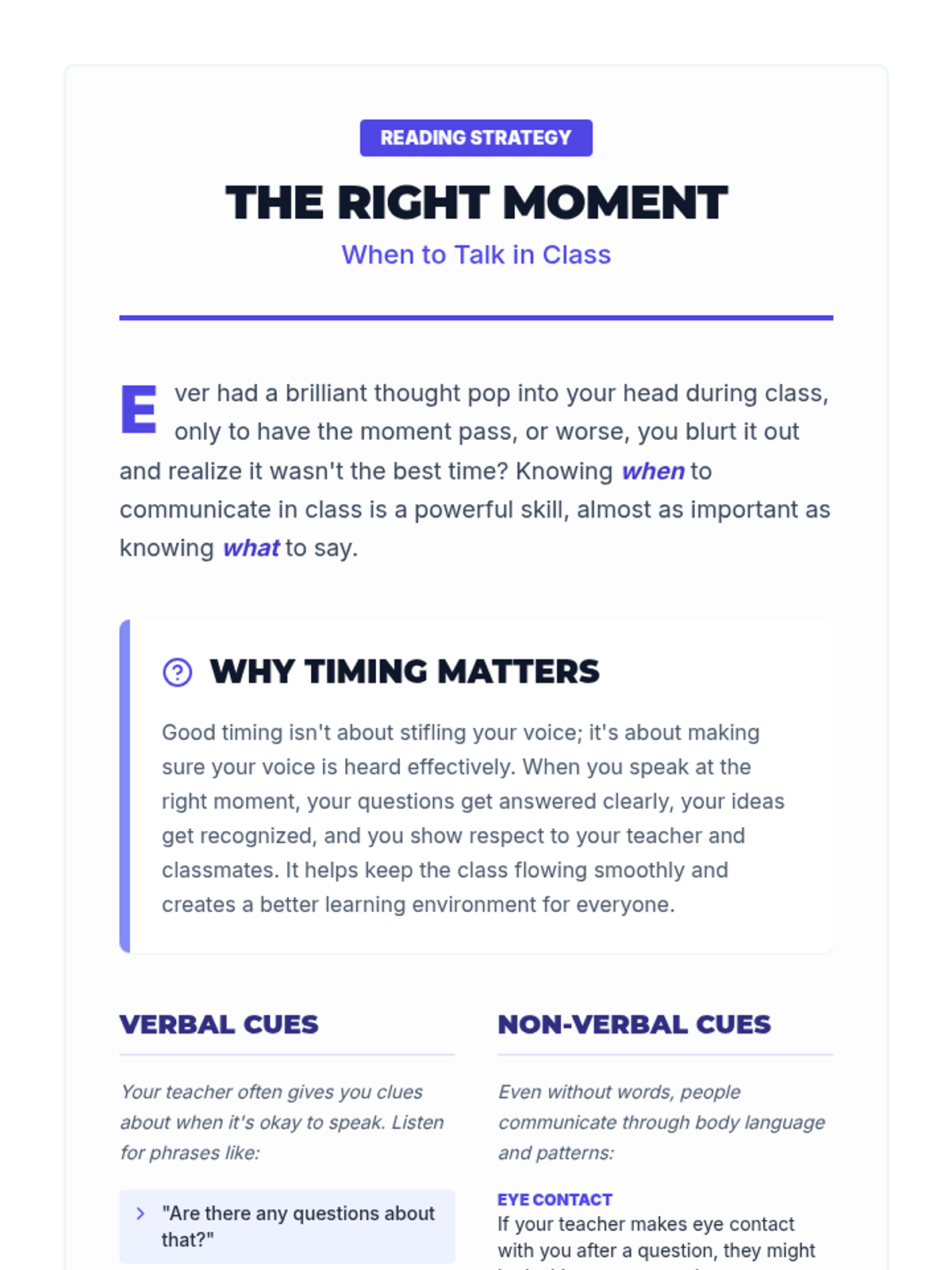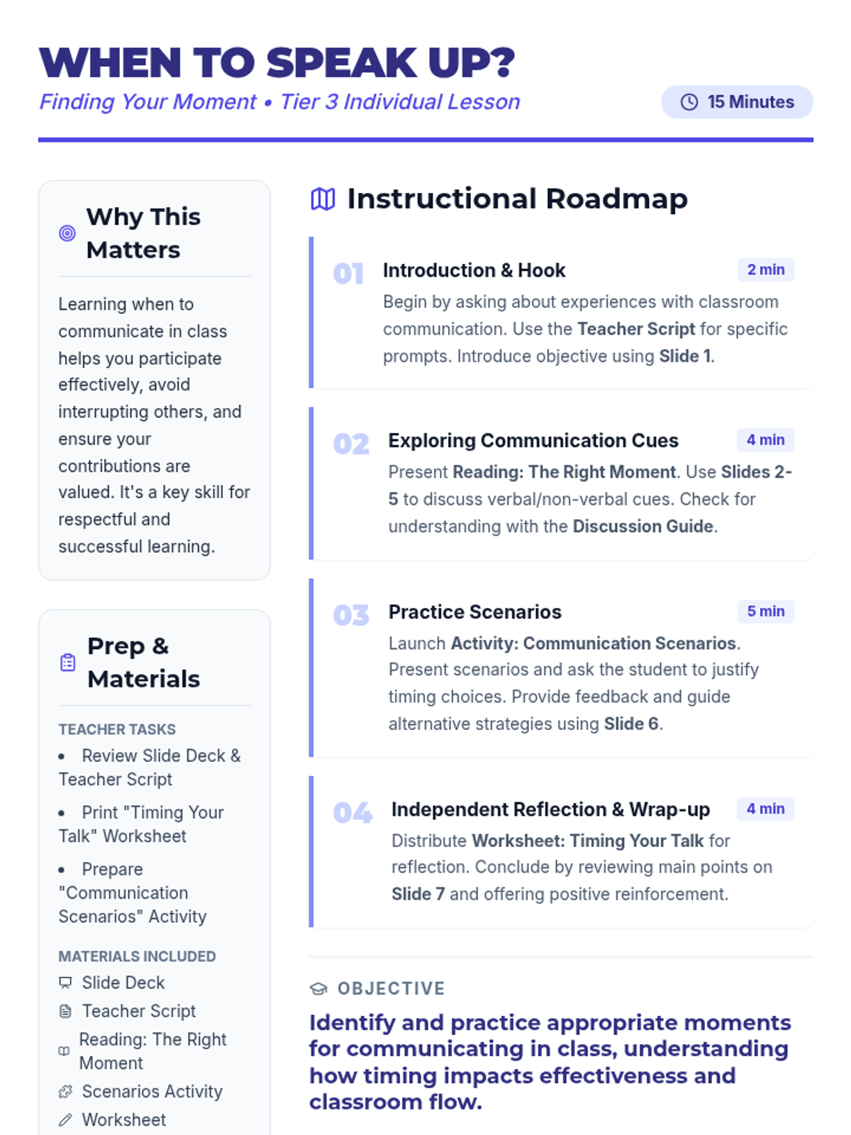 An individualized Tier 3 lesson designed for a 15-year-old student to master the art of classroom communication timing. Through discussion and scenarios, the student learns to recognize verbal and non-verbal cues to engage effectively without causing disruption.