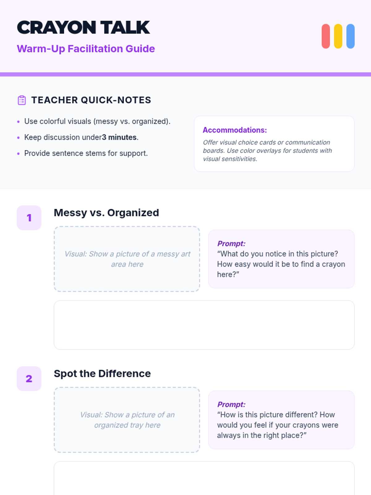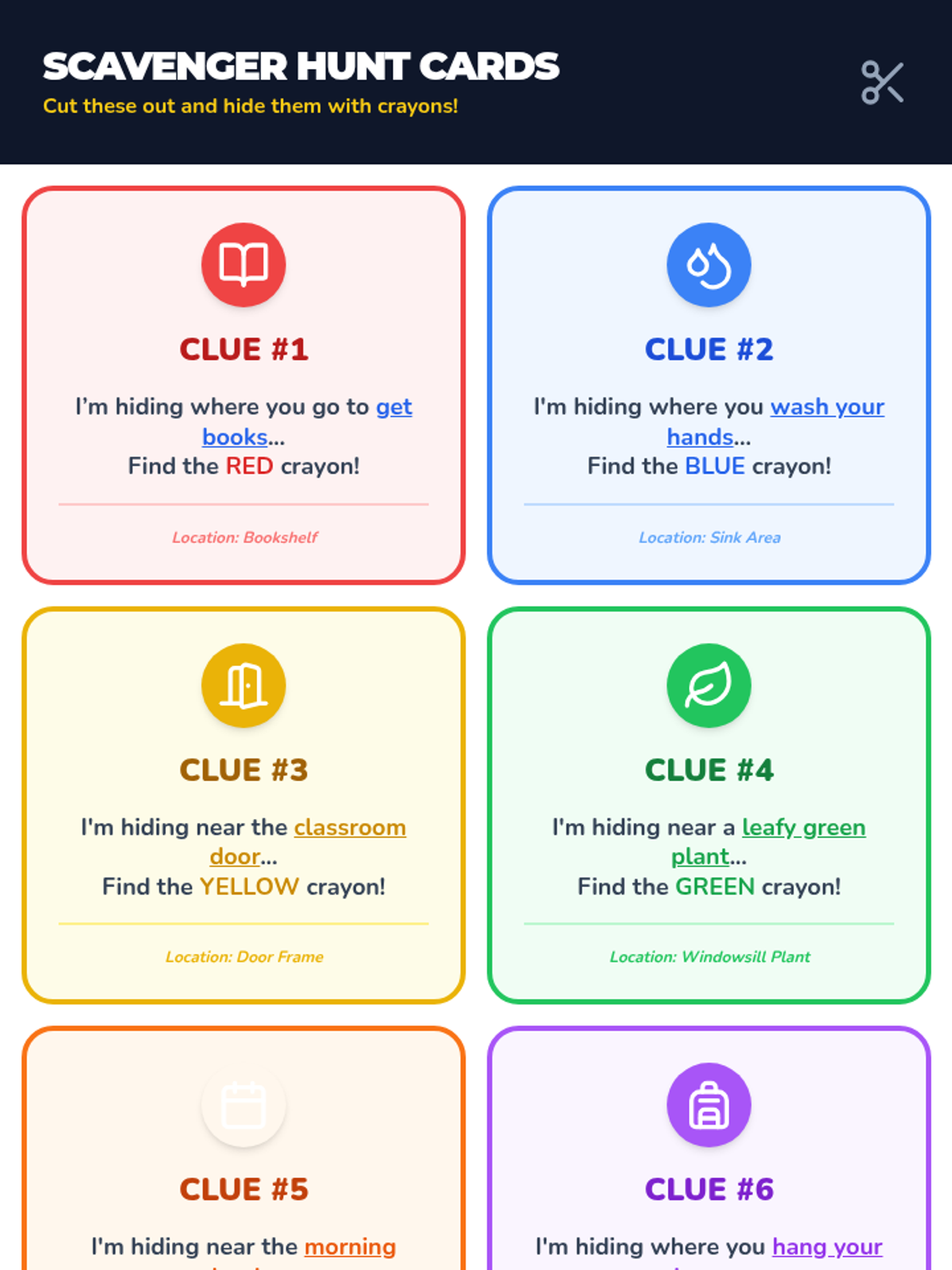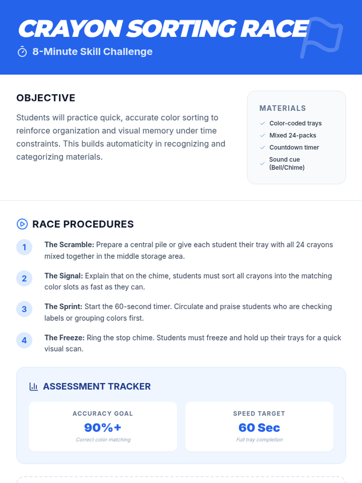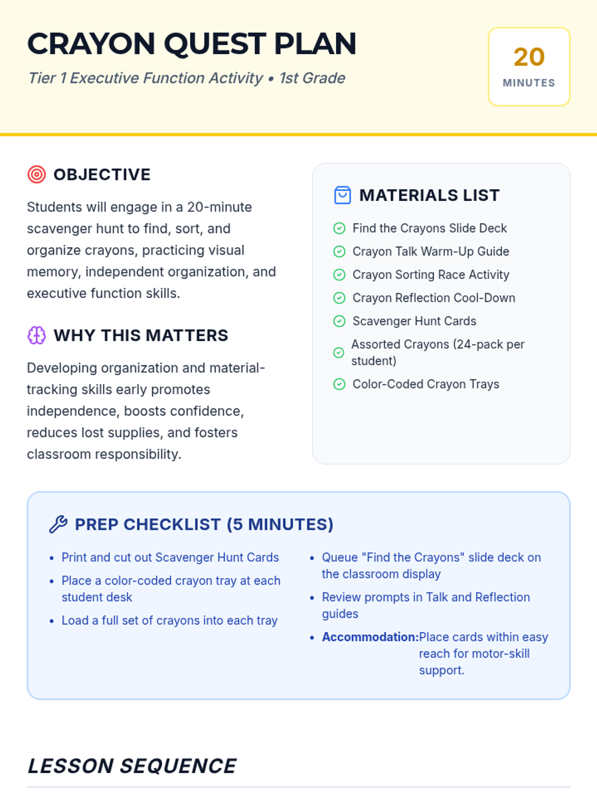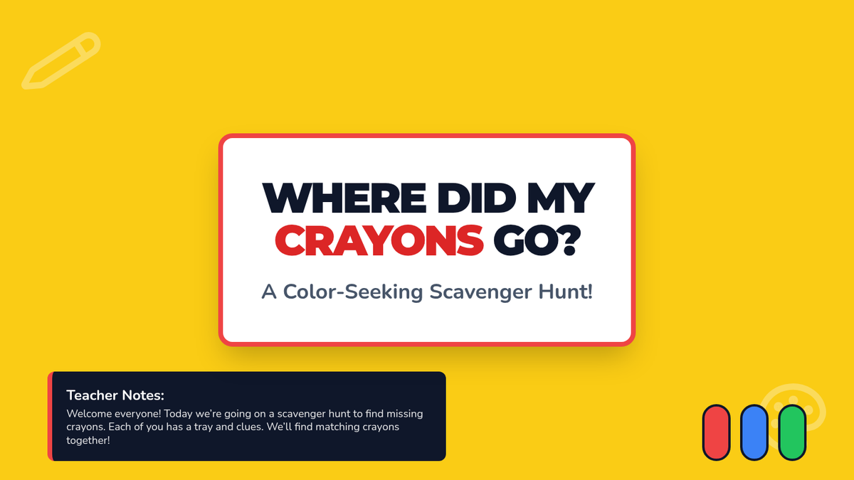 A fun, whole-class scavenger hunt that teaches 1st graders to track and organize materials, boosting independence and visual memory through interactive crayon-based activities.