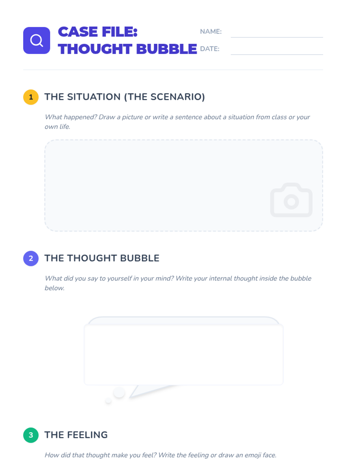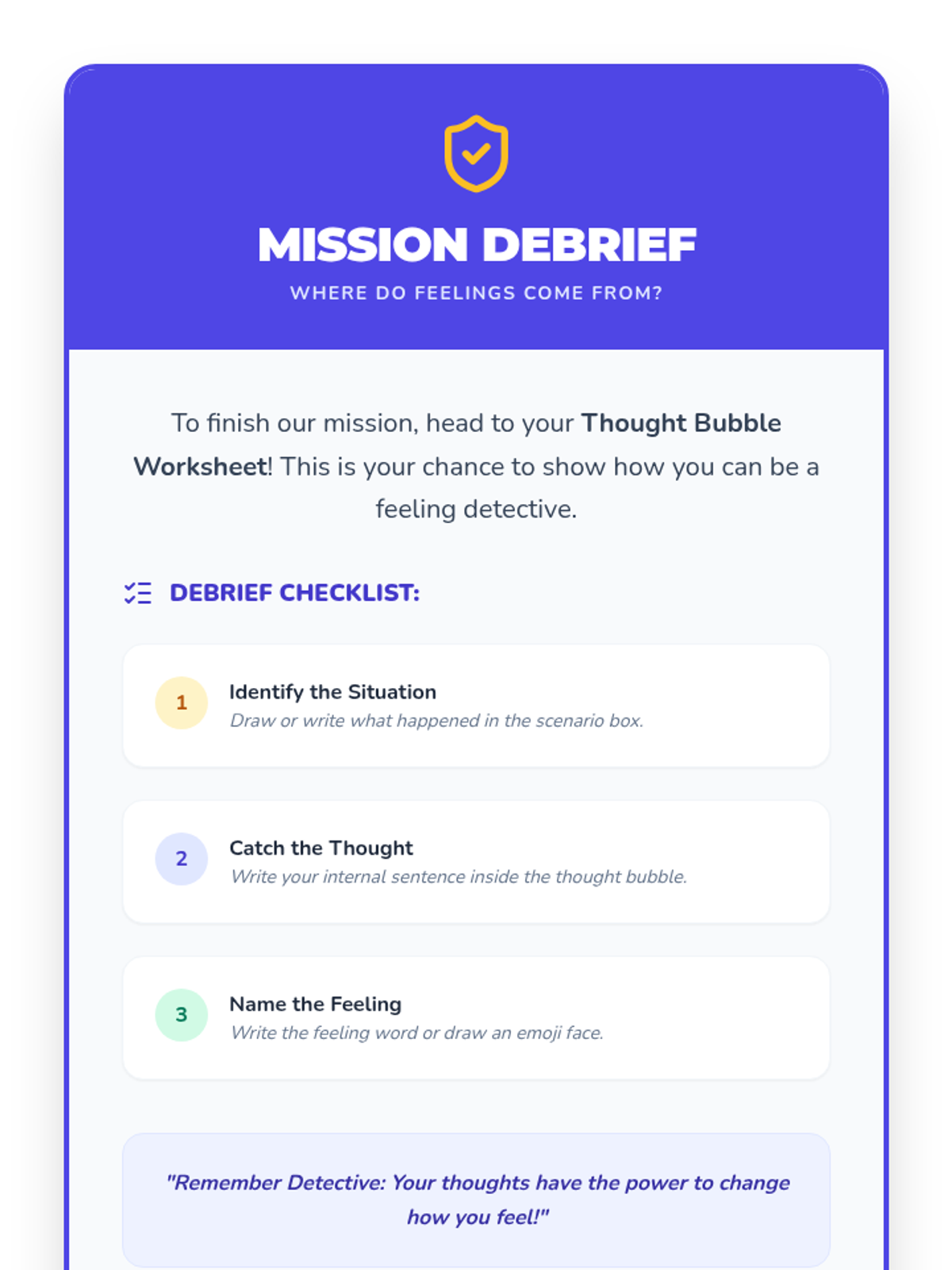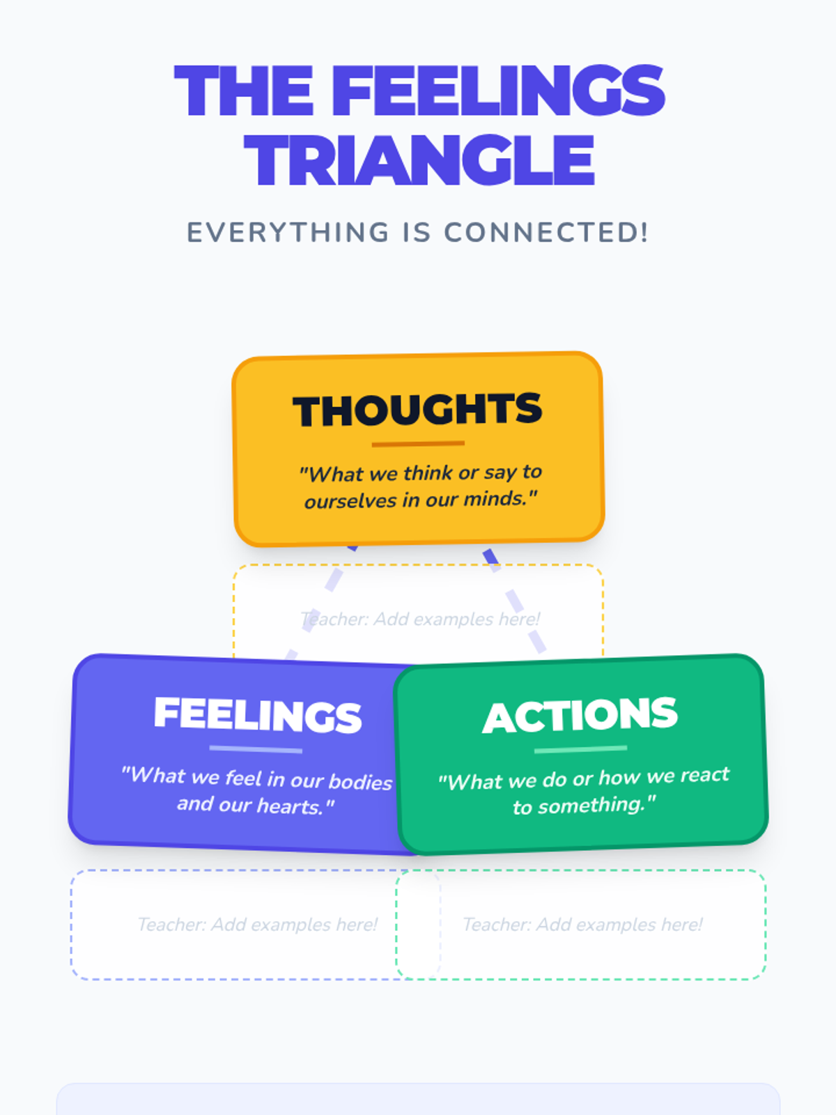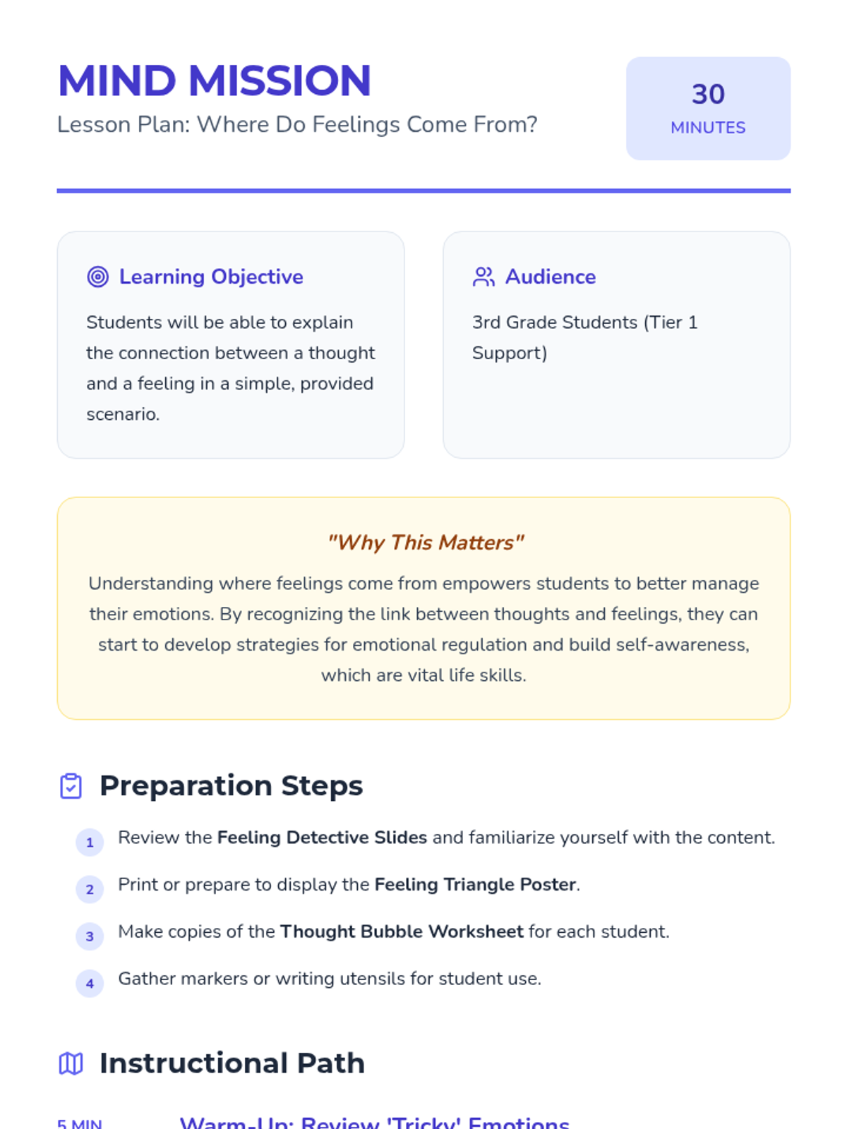 A 30-minute CBT-based lesson for 3rd graders exploring the connection between thoughts and feelings through scenarios and modeling.