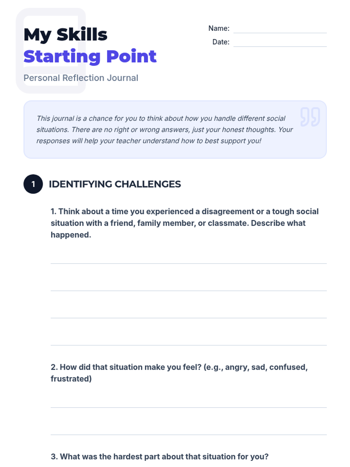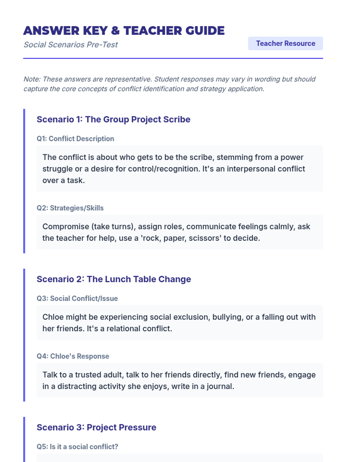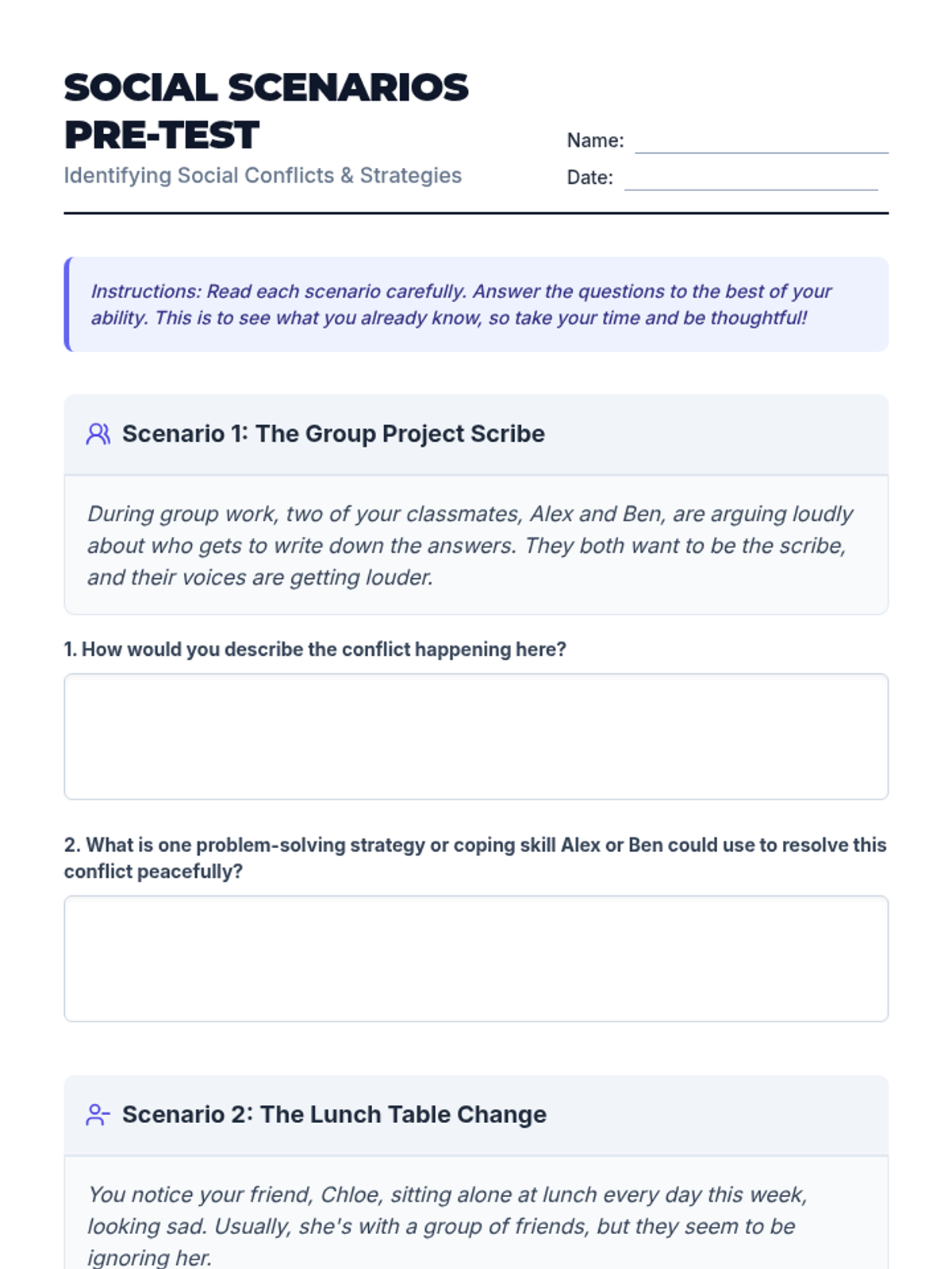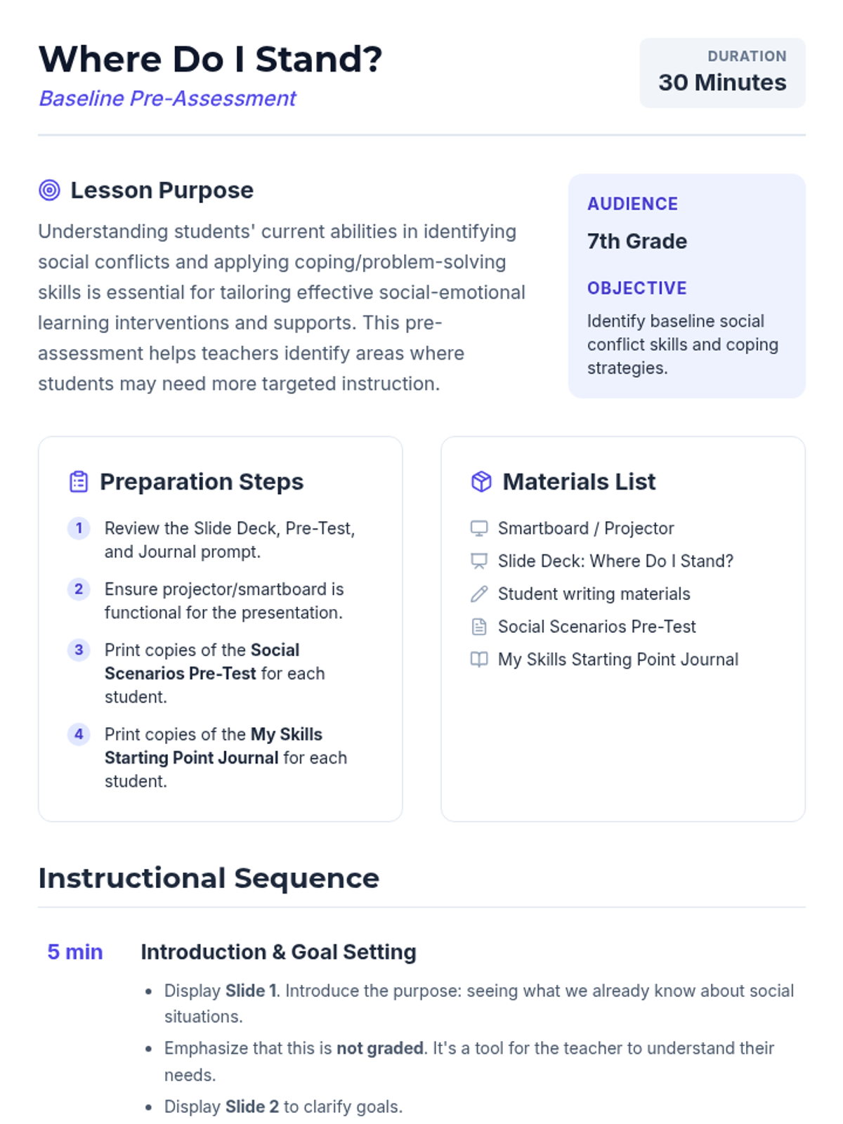 A 30-minute pre-assessment for 7th graders to establish a baseline for social conflict identification and coping strategy usage. This lesson helps teachers tailor future SEL instruction to meet specific student needs.