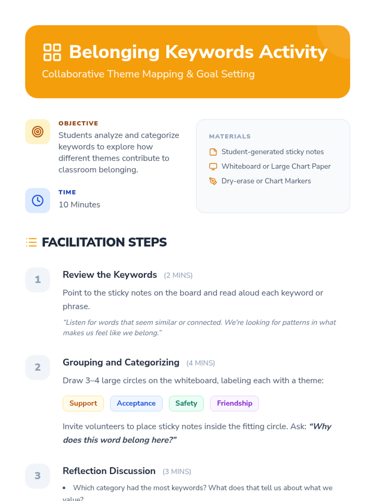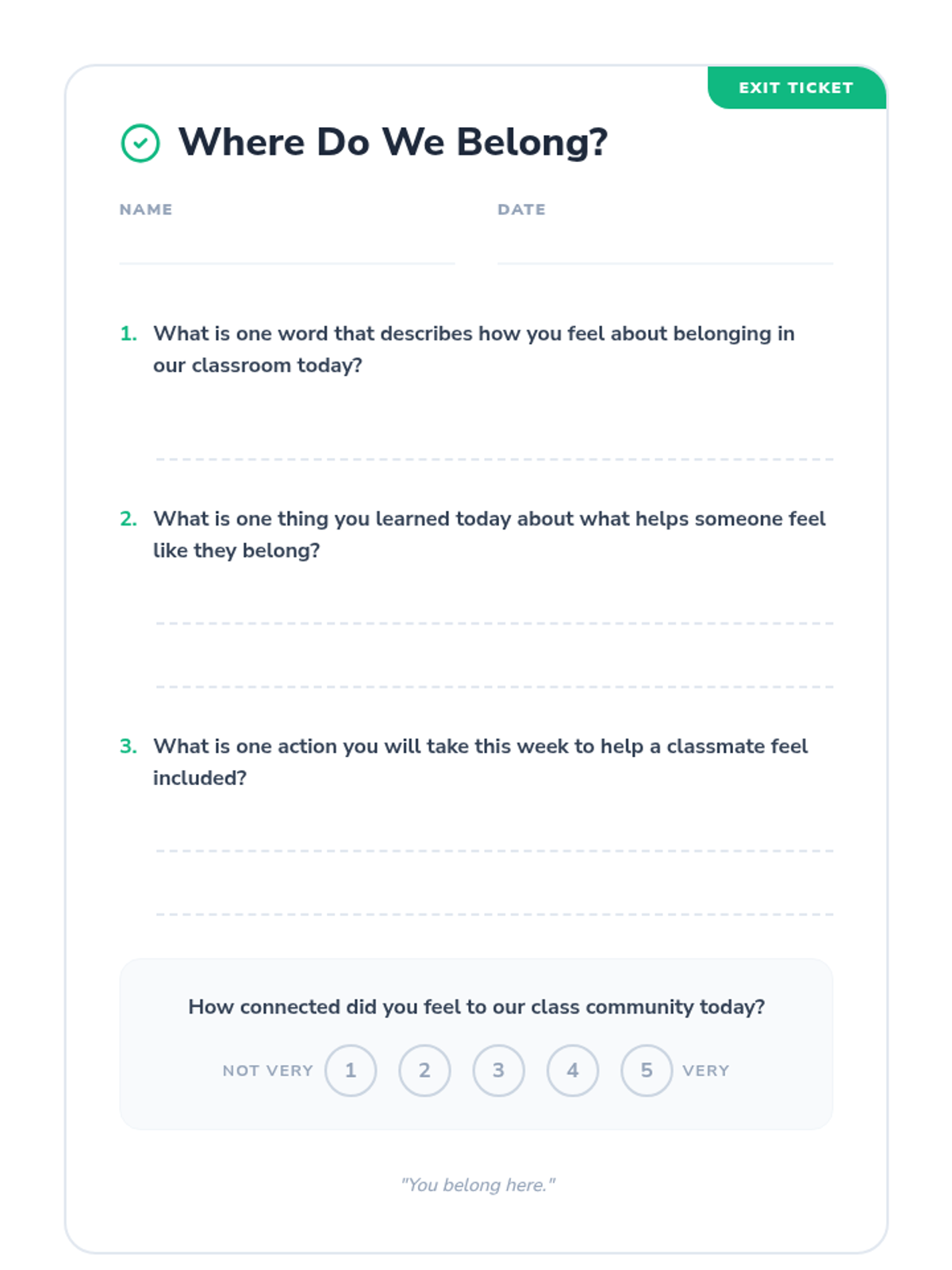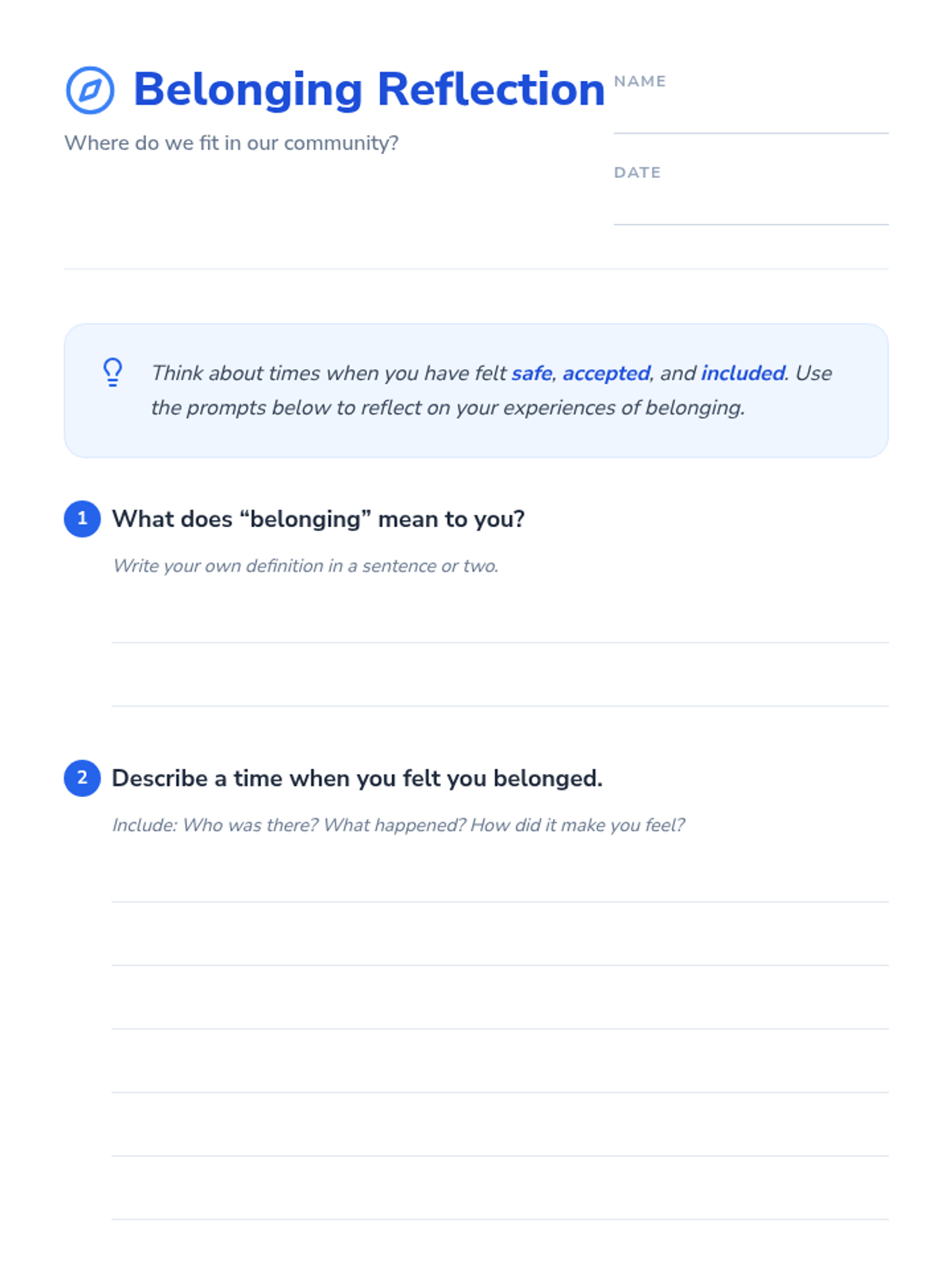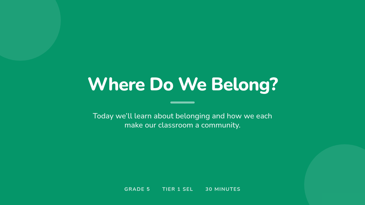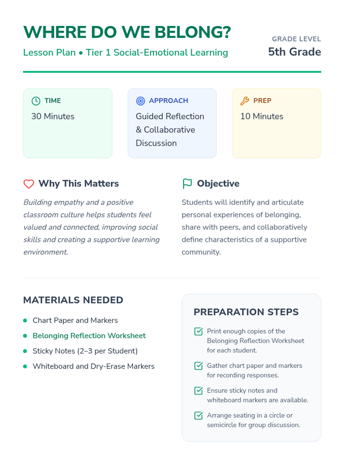 In this 30-minute Tier 1 lesson for 5th graders, students explore the concept of belonging and community by reflecting on personal experiences and sharing with classmates to build empathy and a positive classroom culture.