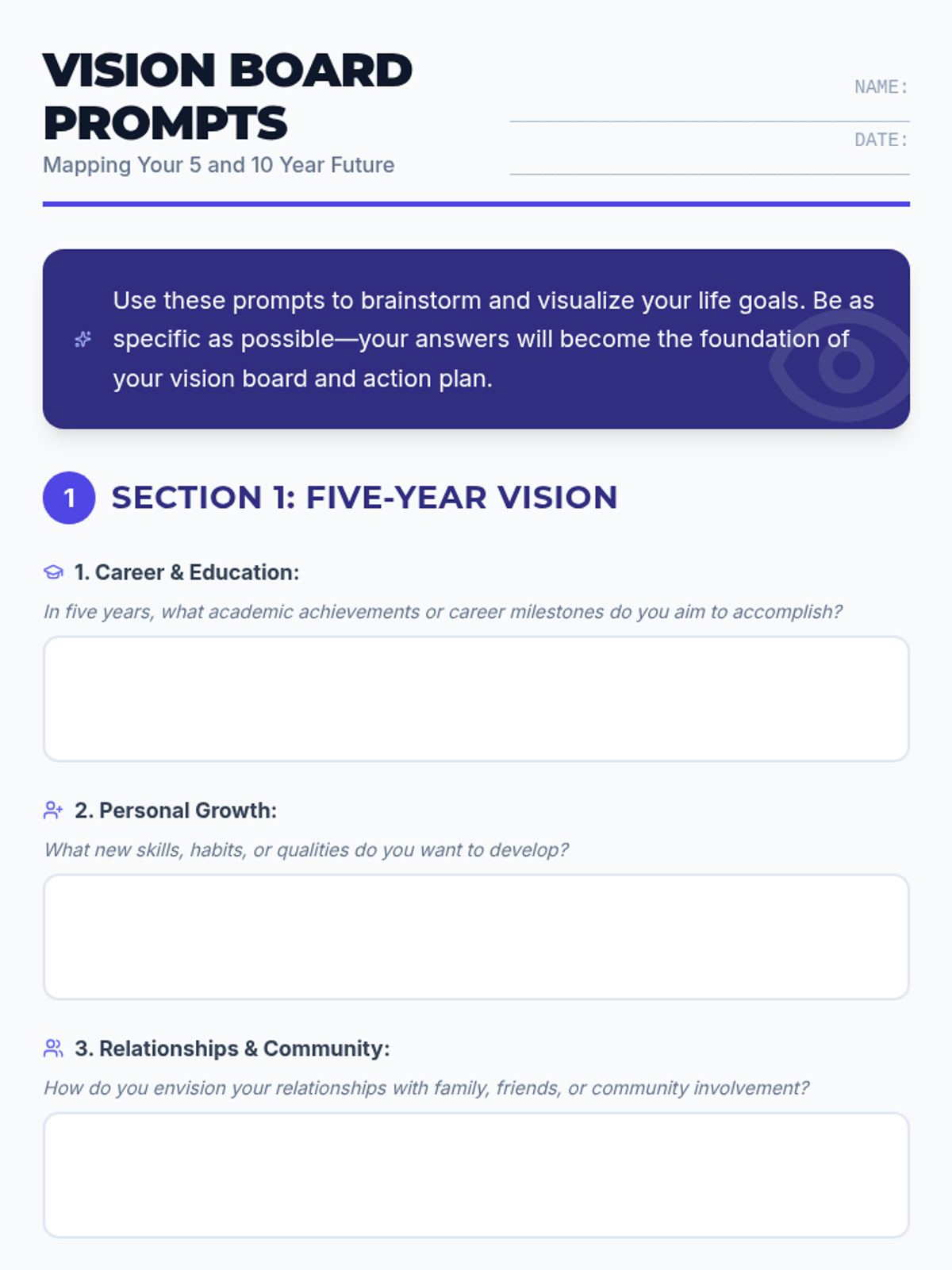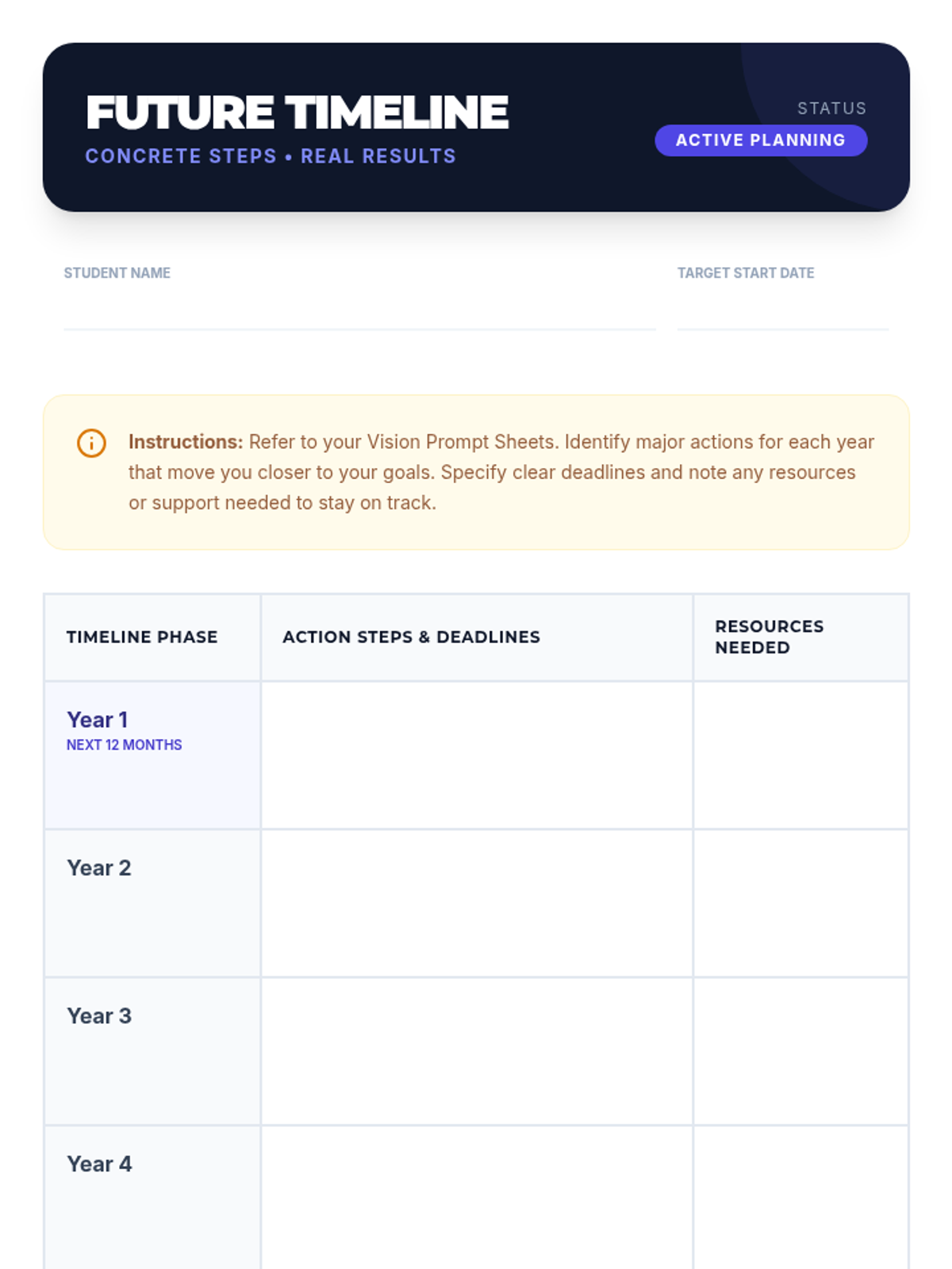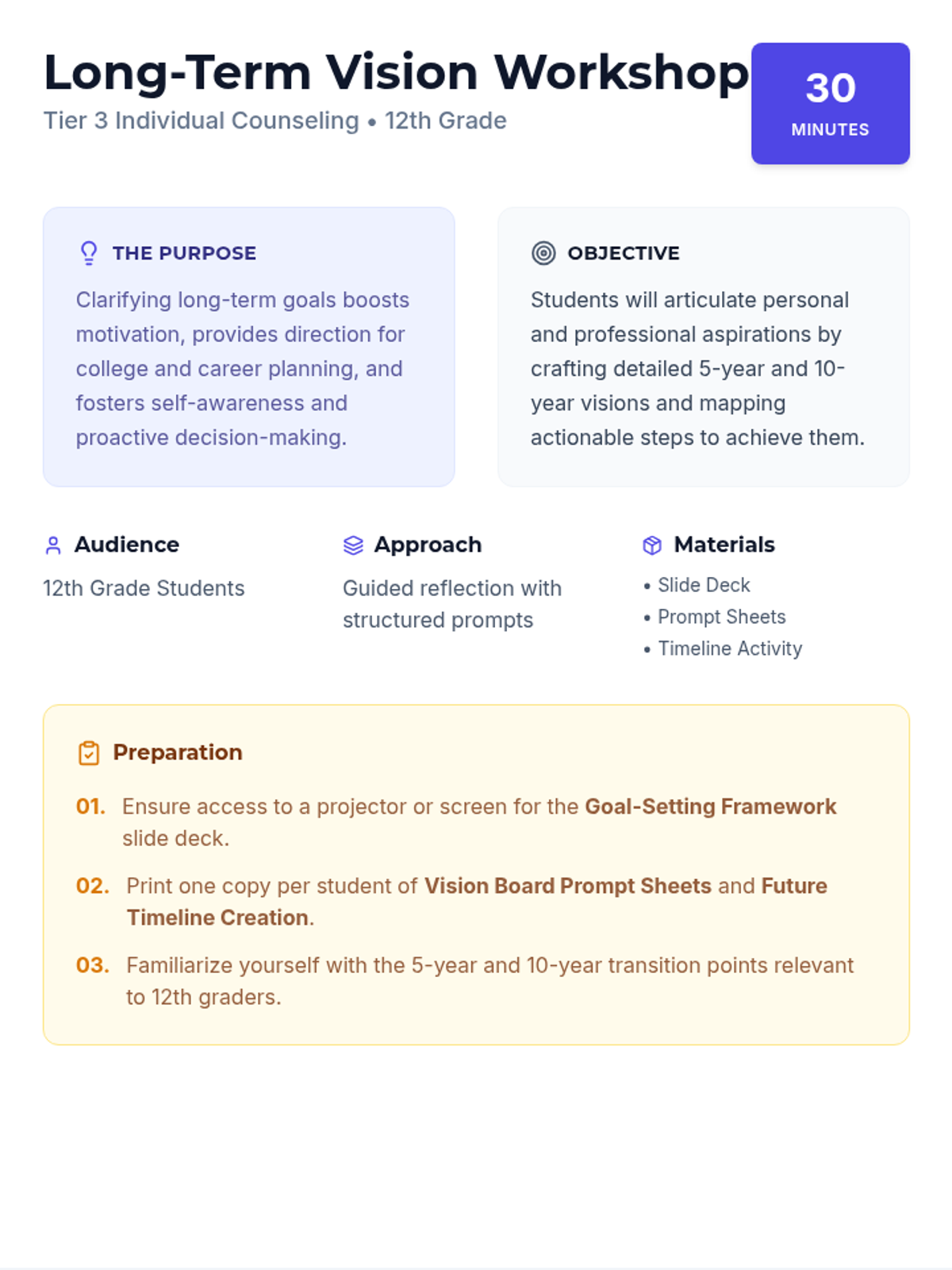 An individual Tier 3 lesson for 12th graders to envision their 5-year and 10-year life goals, aligning aspirations with actionable steps for college and career readiness.