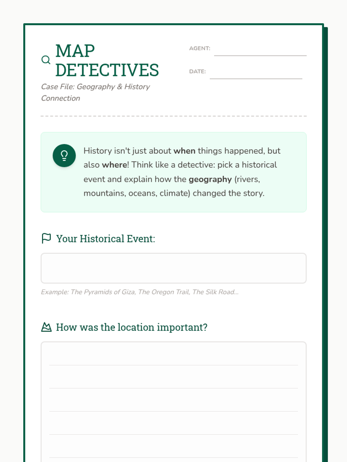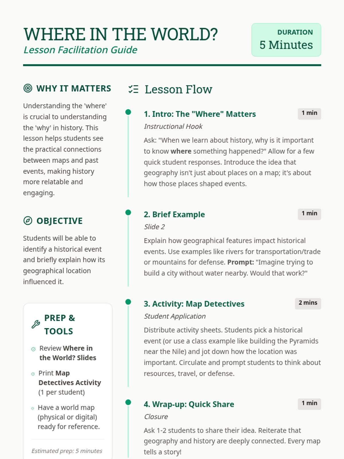 A quick, high-energy lesson connecting geography and history for elementary students, focusing on how 'where' events happened influenced 'how' they unfolded.