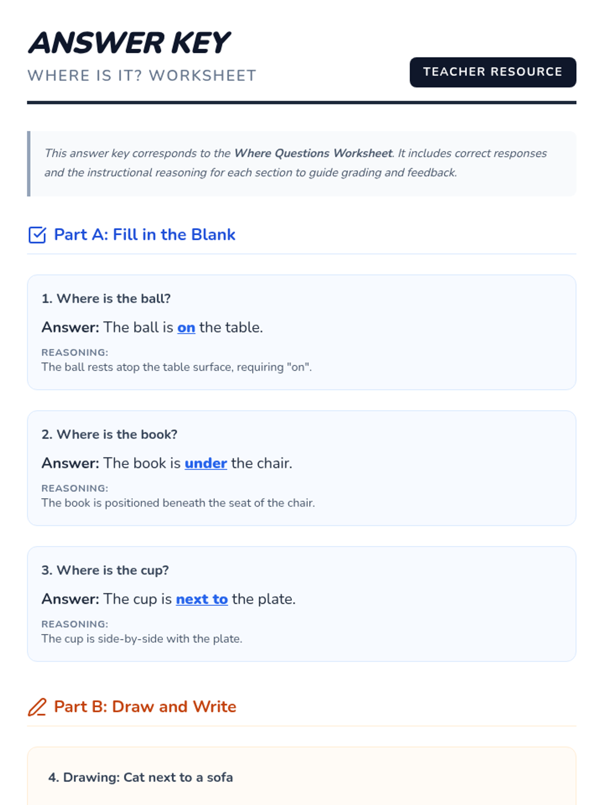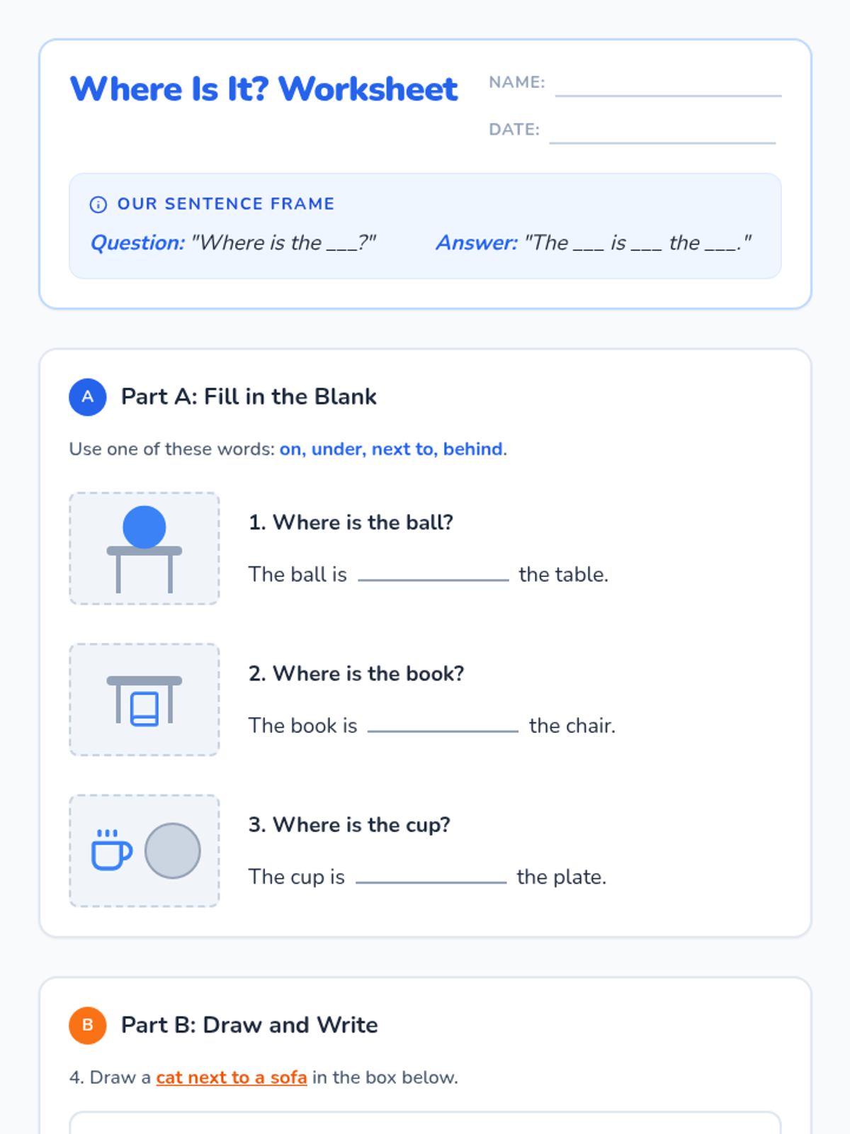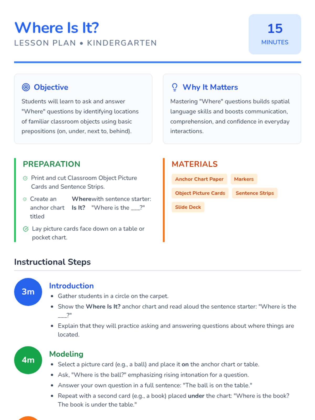 A 15-minute kindergarten lesson where students learn to ask and answer "Where" questions using basic prepositions like on, under, next to, and behind.